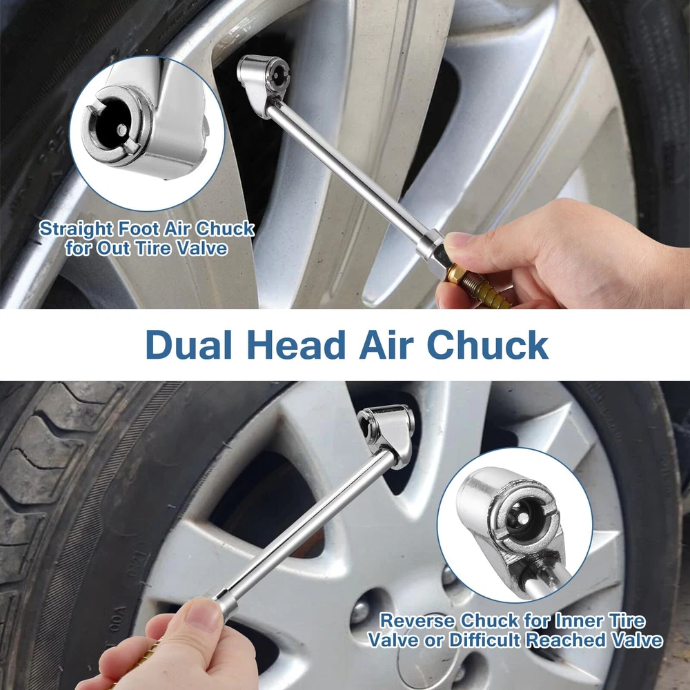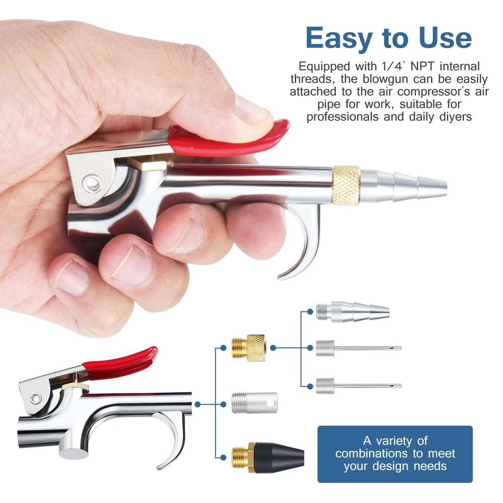 Product description: 20PCS Air Compressor Accessory Kit, perfect for removing dust, inflating tyres and sports equipment, cleaning the places such as pipes and the inside of the machine parts that are difficult to reach. Feature: Product Name: 20Pcs Air Compressor Accessory Kit Material: brass + stainless steel Packing quantity: 20PCS Function: Dual purpose pneumatic tools for ash and air blowing. Advantage: 1. Airbrush kit is mainly made of high quality stainless steel, refined workmanship brings a perfect result. 2. This air blow gun set is rust resistant and durable, Easy operation, improving work efficiency. 3. Small size and lightweight, it is convenient to carry and easy to use. 4. Widely used for cleaning narrow,high places where hands cannot reach and also pipes. Package List: 1pc- dual-foot tire chuck 1pc tire gauge 1pc-Air Clean Tool adapter 1pc-Air Clean Tool rubber nozzle 1pc-1/4" double male connector 1pc-1/4" double female connector 1pc-Air Clean Tool safety nozzle 1pc-Air Clean Tool tapered nozzle 1pc-thread seal tape 1pc-Air Clean Tool 2pcs-1/4" FNPT industrial coupler 2pcs-1/4" FNPT industrial plug 3pcs-1/4" MNPT industrial plug 2pcs- inflation needles 1pc-1/4" x 25Ft Recoil Air Hose Complete Air Tool Accessories Kit: Includes Air Hose, sealing tape, tire chuck, tire gauge, air compressor gun, safety nozzle, tapered nozzle, inflation needle, 1/4 inch NPT quick connector, air hose adapter, etc. Meet all air compressor use needs Premium Air Hose: The recoil air hose is made of High quality PU material, which is wear-resistant and durable. It can be stretched to a maximum of 25 FT US Standard NPT Fittings: All air fittings are standard American 1/4 inch NPT conical thread. The package also contains a roll of teflon tape, which can be evenly wrapped around the thread of the interface before using the air compressor equipment to avoid air leakage Multi Purpose: The 20pcs Air Compressor Accessory Kit contains a wide variety of useful accessories for removing dust, cleaning truck cab, inflating tyres and sports equipment or any other job that requires an air supply from an air compressor Easy To Use: This accessory has a quick-connect air hose connector. (1/4 inch standard quick connector and plug). You can connect it to your air compressor easily