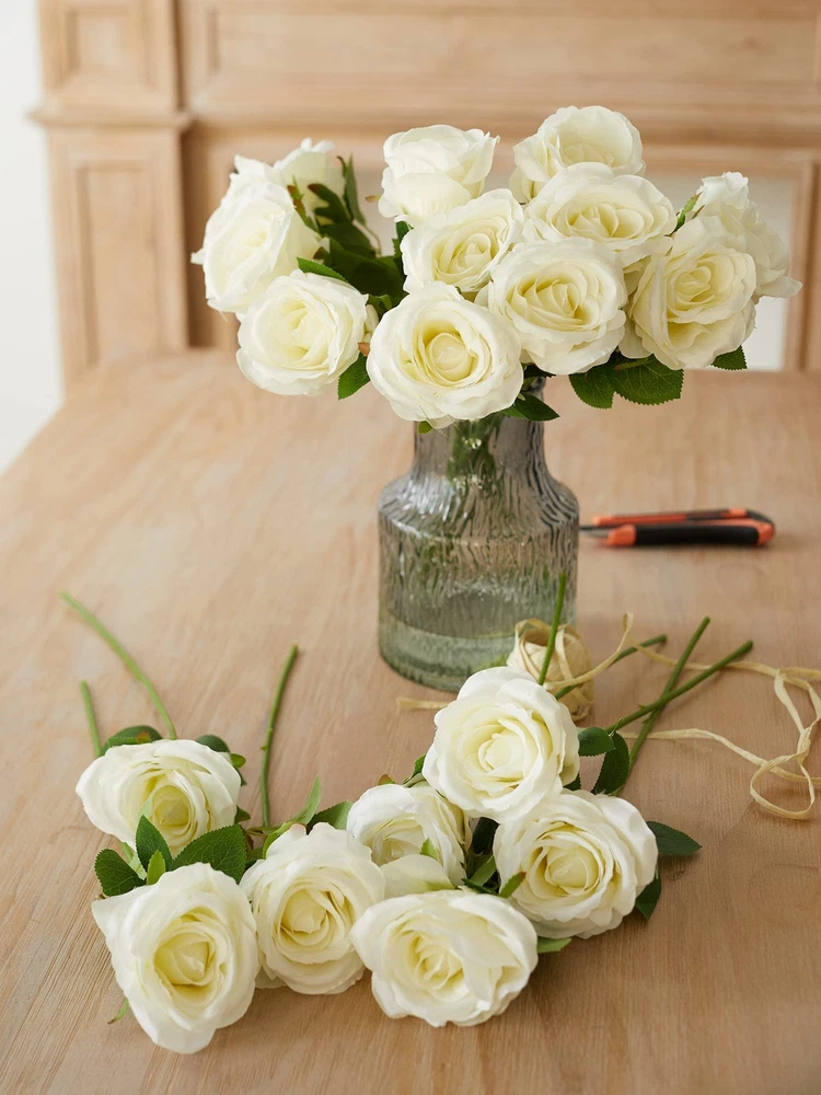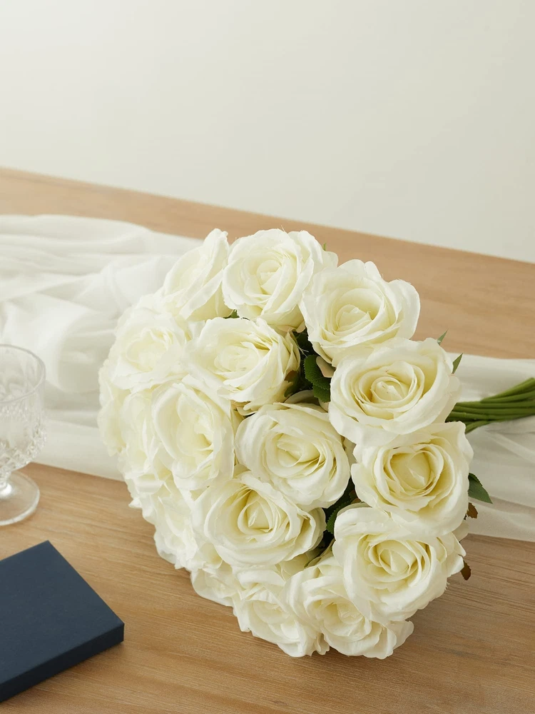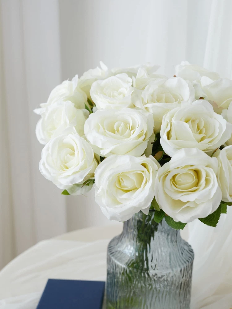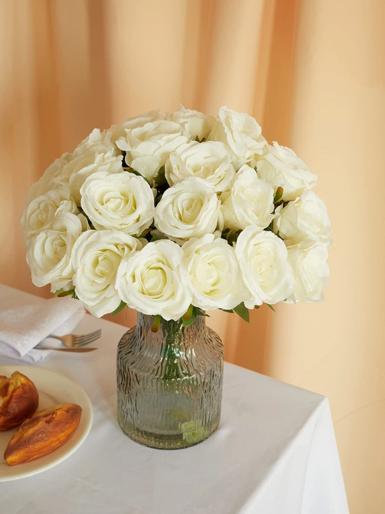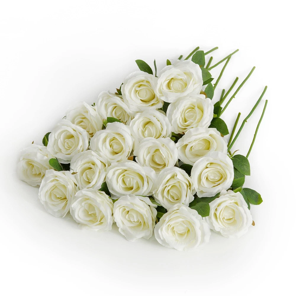 Artificial flowers Fake Roses Packaging and size: A set includes 20pcs artificial roses, its height is 15.8in/40cm, diameter is 2.8in/7.12cm. High-grade material: The white artificial rose bouquet is made of high-quality silk, plastic and metal wire, so it can be bent freely, and can be adjusted in height and shape. Easy to maintain: The flowers and leaves of the wedding rose bouquet are very realistic and feel real. They will not fade, require no care, and have no peculiar smell. Various decorations: very suitable for weddings, Halloween parties, families, birthdays, Valentine's Day and any other places you want to decorate. Reminder: Artificial flowers may be squeezed and deformed during transportation, but they can be restored to their original shape after a little adjustment.