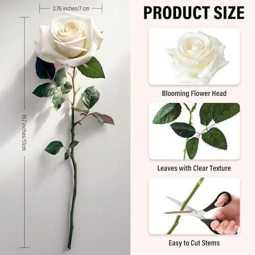Return Policy Fast Delivery Trusted seller 20PCS Artificial Roses with Long Stems - Realistic Silk Flowers, Fake Roses Real Touch Bouquet of Roses for Home Decor, Bridal Wedding Party Table Centerpieces, Bulk Faux Rose Flowers (White) Product Description 【Real Touch 20 Artificial Roses】You will receive 20 pieces of artificial white roses with plastic stems and leaves. Our roses artificial flowers boast high-quality silk petals and leaves that are vivid and soft to the touch.This 20 set provides ample flowers for your decoration needs, whether for home, events, or crafting purposes 【Excellent Durability】Each petal of our roses artificial flowers bulk is made of silk. The flowers are supported by plastic stems and leaves with wire inside, ensuring that the rose bouquet retains its shape and lasts a long time. The diameter of the blooming rose head is 2.76 inches/7 cm, and the total height is about 19.7 inches/50 cm 【Adjustable Long Stems】 The white silk roses come with long plastic stems that can be easily bendable or cut according to the size of the vase or floral arrangement. Their white color faux roses can match various home decorations, bringing a touch of elegance and purity to the setting. Note: The flower buds may be compressed or deformed during transportation. Please use a hairdryer to gently blow the flower buds to restore their shape upon receipt 【Long-Lasting Beauty】Unlike real flowers, these fake roses do not wither or die. Plastic roses retain their beautiful look for a long time, adding ongoing charm to your space. Rose bouquet are suitable for weddings, wedding arches, flower walls, kissing balls, reception centers, office decorations, and more 【Thoughtful Gift Idea】 This roses artificial flowers bulk fits into different settings, whether it's home decoration, a romantic wedding centerpiece, or adding vibrancy to a party decoration. With its beauty and practicality, rosas artificiales para decoracion is a great choice for those who love home decorations or botanical elements Shipping Returns Payment Shipping Shipping is FREE to all addresses other than APO/PO boxes in the lower 48 states. All our stock ships from US-based warehouses. Shipped via USPS or UPS (depending on location and package weight) Unless stated otherwise, all orders will ship within 24-72 hours of your payment being processed. Check our feedback to see the great reviews of FAST shipping we offer. Returns Seller does not accept returns Payment We currently accept payment via eBay managed payments only. Once payment is cleared, we will dispatch your shipment within 1-3 business days. Please refer to the "Shipping" tab for more information regarding shipping speed to your destination.