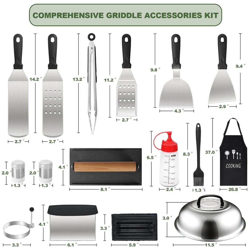 20 Pcs Griddle Accessories Kit 【Perfect BBQ Accessories】This griddle accessories kit includes: 1* long slotted spatula, 1* long spatula, 1* griddle filpper, 1* small slotted spatula, 1*grill tongs, 1* slant edge scraper, 1* basting cover, 1* griddle press, 1* exclusive apron, 1* sauce brush, 1* griddle chopper, 2* spice shakers, 2* squeeze bottles, 2* egg rings, 1* cleaning brush, 1* storage bag, 1* gift box. 【Premium Stainless Steel】Compared with other stainless steel on the market, Our metal flat top grill is made of high quality stainless steel, heat-resistant and rust-proof, safer and more durable. So you can easy enjoy your grilling, camping or cooking without worry about your tools bending, breaking or rusting again, which is BPA free you can use it with confidence. 【Easy to Clean & Storage & Carry】Our griddle tool kit is dishwasher safe, or easily wash by hand with water and soap, so you can enjoy a delicious barbecue with your family without hassle. Each tool can be placed in an orderly manner and better protected in the compact storage bag. Convenient hangers are provided for easy storage and food grade grill tools are easily cleaned with warm, soapy water. Note: After washing the spatula and scraper, please make sure to dry them to avoid rust. 【Chef's Choice griddle accessories kit】This grill tools set with griddle scraper, spatulas and oil bottles helps you to grill as easily as a restaurant chef. Great for flipping burgers, pancakes, veggies, cutting bread,meat and sausage, scraper & chopper to dice food and scrape griddles clean. The Long Griddle Spatula can move large amounts of food quickly and accurately. Egg rings and pepper shakers to enhance your griddle cooking experience. 【Great Gift Choice】This practical barbecue tools set with beautifully designed gift box is ideal gift choice for Fathers Day, Thanksgiving or Christmas. It includes all the tools needed for yard, outdoor, and camping barbecues an ideal gift for friends, lovers, or family members who love cooking or barbecue and camping enthusiast.