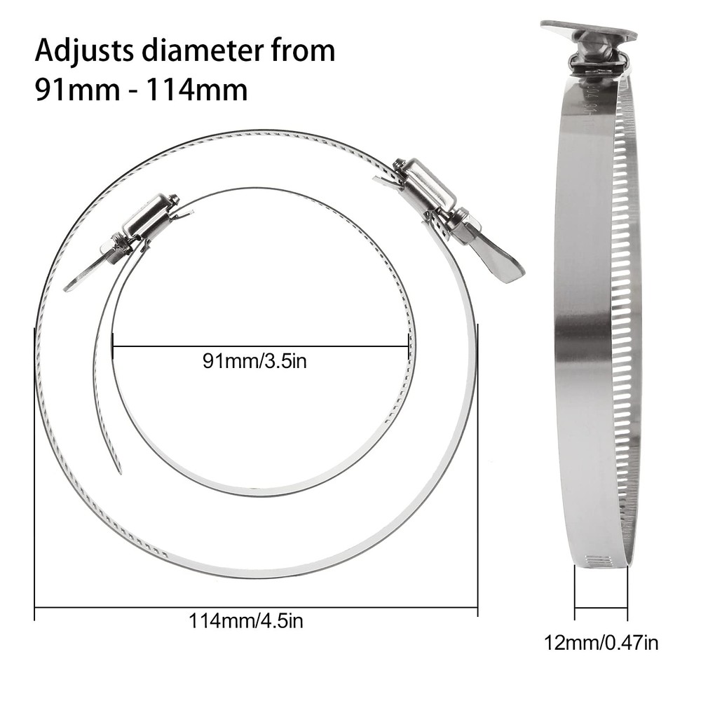 20 PCS Hose Clamps, 304 Stainless Steel Hose Clamps, 4 Inch Duct Clamps Worm Gear Adjustable 91-114mm Hose Clamp, Fuel Line Clamp for Plumbing, Automotive and Mechanical Applications Why Choose Us? * High Quality Material: These fuel clamps are made of high quality 304 stainless steel, rust-proof, water-proof, corrosion-resistant for long lasting use * Easy to Use: Easy to tighten or loosen without any other tools for easy installation * Multi-Uses: The hose clamps stainless steel can be applied to secure hoses, pipe, cable, tube, automotive, industrial, boat, etc; * Perfect Seal: The duct clamps are locking secure and tight, which provides an excellent seal for variety of hose materials, effectively solves the problem of liquid and gas leakage of the hose * Great Value: You will receive 20 pcs 4 in fuel line clamps, large quantity set products achieve great favorable price Specification of Hose Clamps: Material: 304 Stainless Steel Diameter Range: 91-114mm/3.5 - 4.5 in Band Width: 12mm/0.5 in Color: silver Package included 20 x Stainless Steel Hose Clamps 304 STAINLESS STEEL DUCT CLAMP- The whole duct clamp (including the band, housing and screw) are all made of premium 304 stainless steel; Salt resistant, anti-rust, anti-corrosion, waterproof, oil-proof; These adjustable hose clamps are sturdy, strong and reliable FLEXIBLE ADJUSTABLE SIZE RANGE- The 4-inch stainless steel hose clamps can be adjusted from 91-114mm / 3.5-4.5 inch; This pipe hose clamp are flexible and ductile for using; Secures ducting tightly in place WIDELY USE- The worm drive clamps are widely used in securing ducting, dryer vent, hoses, pipe, cable, tube, fuel lines etc; Perfect to apply in automotive, industrial, mechanical, agriculture, boat/marine, shield, household etc; Both indoor or outdoor use PACKAGE INCLUDES- The stainless duct clamp kit comes with totally valued 20 pieces hose clamps with adjustable size range from 91 mm to 114 mm, perfect for hose outside diameter 91-114mm / 3.5-4.5 inch; Enough quantity for your restoration projects ADJUSTABLE STYLE- These stainless worm gear hose clamps with a worm-drive lock, easy to use, don’t need any tools to tighten or loosen; You can adjust the size according to the diameter of the pipe, and you can install and remove DIY pipe hose clamps at any time