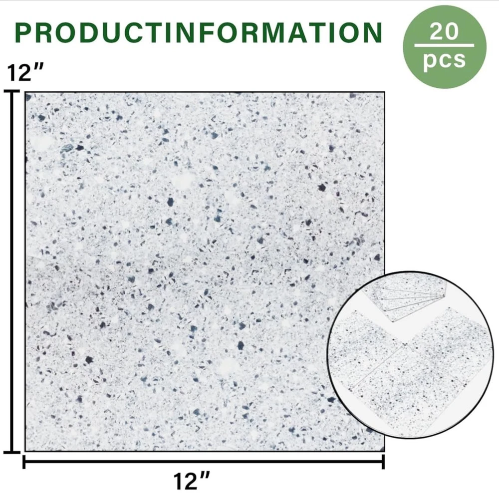 20-Pack Peel and Stick Floor Tiles Vinyl Floor 12 x 12 inch [Ultra-realistic Surface Texture Restoration]: Realistic texture and a durable surface with excellent wear resistance; the surface won't scratch easily, doesn't retain stains, and is easy to clean. [Thickened PVC Layer for Good Support]: Waterproof floor tiles design with a 0.05 inch thickened PVC layer, which can effectively cover slightly uneven surfaces. They offer strong support, preventing easy curling, while also providing excellent waterproof and stain-resistant capabilities. [Strong Adhesion Layer]: Our floor tiles have very strong adhesion, which will not easily lose stickiness when exposed to water, and are not prone to curling due to friction. [Bright Your Home Using Floor Tiles]: Equipped with different floor tiles color options to meet different decoration styles. They are perfect for various spaces including kitchen, bathroom, laundry rooms, living rooms, RVs, entryways, and bedrooms. [Size and Coverage Area]: Each peel and stick floor tiles measures 12 x 12 inches, with a thickness of 0.05inch. A set of 20 pcs covers an area of 20 Sq.Ft.
