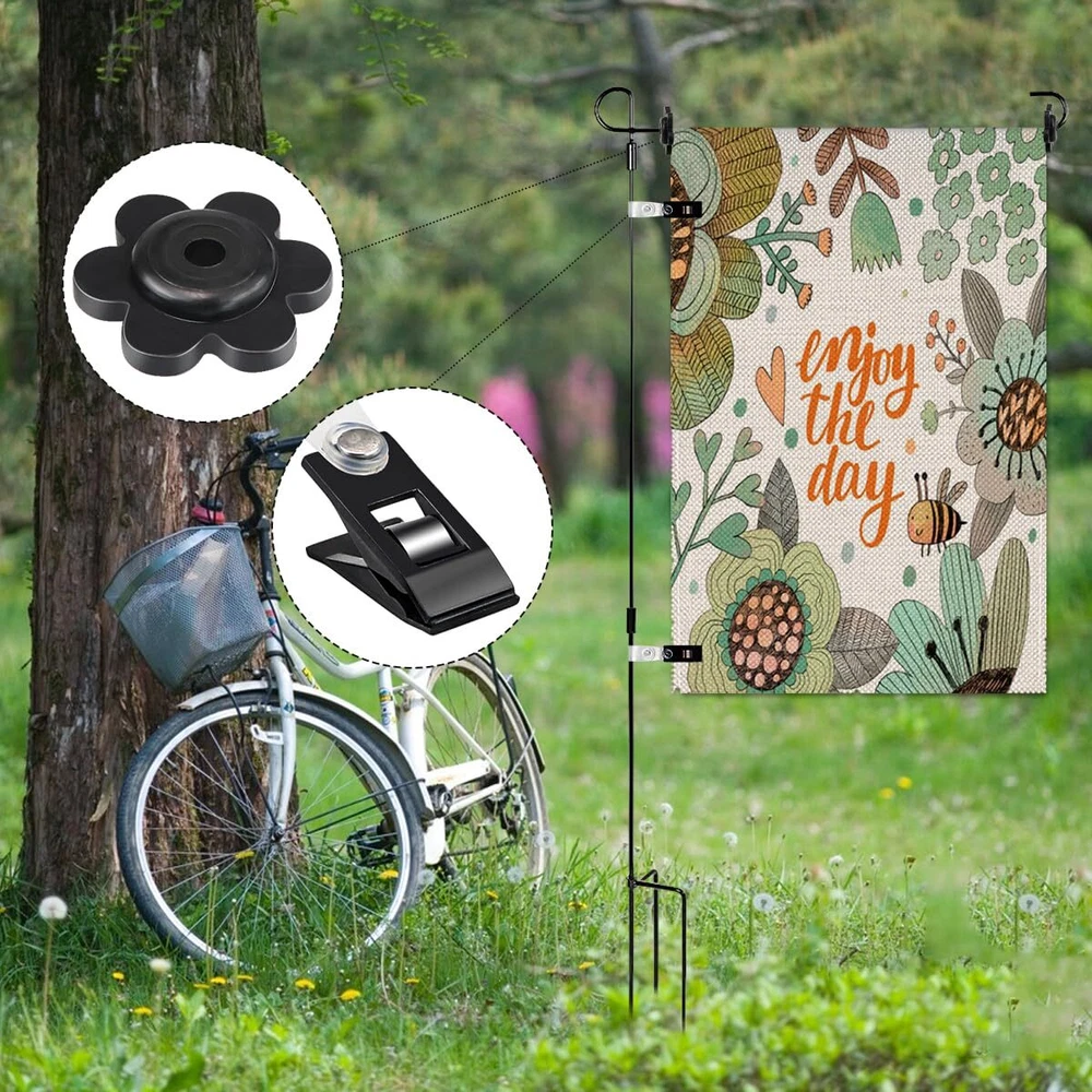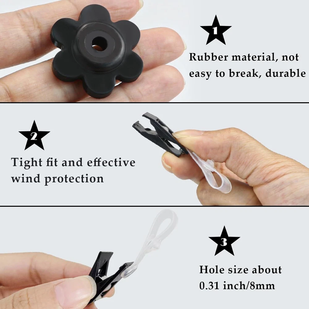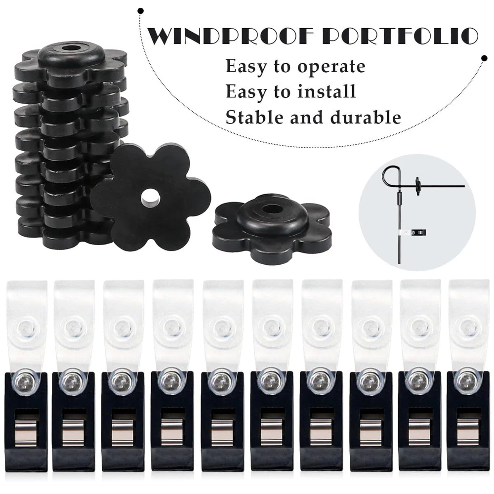 Features Material:Plastic,Rubber Color: Black Flag Clips Size: About2.2x0.47inches/56x12mm Stoppers Inner Hole diameter: About 0.2inch/5mm Package Includes:10 x Garden Flag Clips,10 x Garden Flag Stoppers Notes 1.Manual measurement, please allow slight errors on size. 2.Choking risk may exist, please keep away from children. Package Content: Including 10 pieces of rubber garden flag plugs and 10 flag clips, which can work properly in the environment of sunshine, rain and wind. Tools For Fixing Flags: The flag clips and rubber stoppers are specially set for garden flag poles, the rubber stoppers are soft and thick and can be resized to fit different sizes of flag poles, this set can effectively prevent flags from blowing away, effectively prevent flags from being blown away and work properly in different weather. Easy To Install: The black flower-shaped rubber stopper with holes is put on the open end of the flag holder to prevent the flag from falling off, and it is put on in the same way as you put on the flag. The clip is at the bottom of the flag and clips onto the upright part of the flag stand, keeping your flag in place even on windy days, simple and easy to use. Flag Plug: The black flower shaped rubber plug has a diameter of about 1.14 inches and the black flower shaped rubber plug has an inner hole diameter of about 0.2inches, it has good flexibility to fit snugly to most garden flagpoles. Flag Clip: The clip is about 2.2 inches in length and the clip holds the flag well so that it doesn't roll around the top of the flagpole when it's windy outside. It keeps your flag in place so you can enjoy it without always having to adjust it.