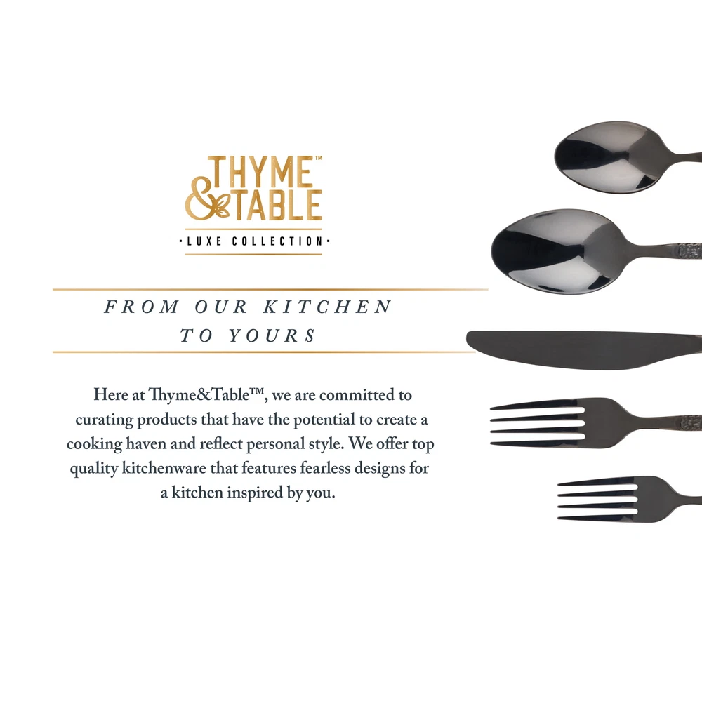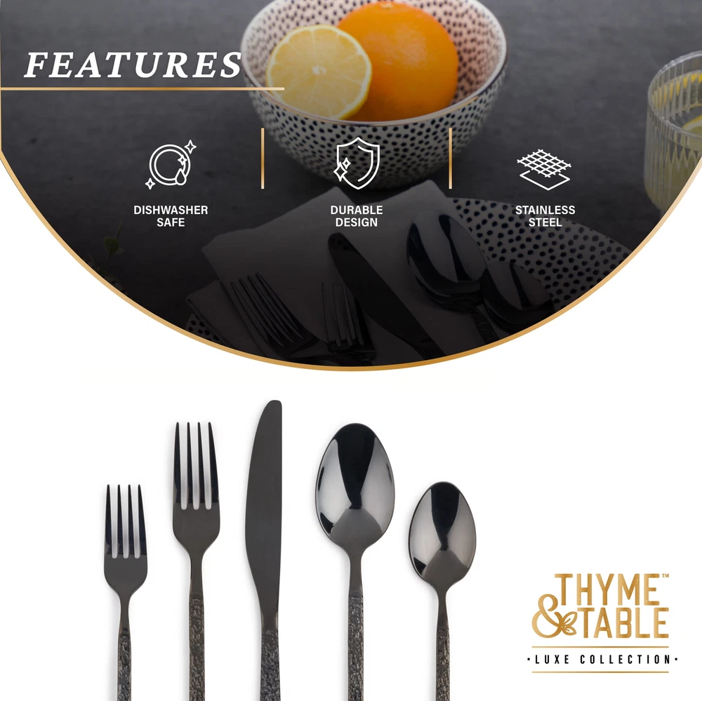 20-Piece Lumi Stainless Steel Flatware Set, Black. Elevate your dining experience with this exquisite 20-piece stainless steel flatware set. Crafted with precision and designed with style in mind, this set is the perfect addition to your dinner table. Whether you're hosting a formal dinner party or enjoying a cozy family meal, our flatware set adds a touch of sophistication to every occasion. Our flatware is made from high-quality 18/10 stainless steel, ensuring durability for daily use and long-lasting shine. Say goodbye to rust and stains! This comprehensive set includes everything you need for a four-person meal – four dinner forks, four salad forks, four dinner knives, four dinner spoons, and four teaspoons. For care and use, please wash in warm water before first use. Do not soak and do not use in microwave. For product's longevity, please hand wash. 20-Piece Lumi Stainless Steel Flatware Set, Black 18/10 stainless steel Service for Four Made for Everyday Use