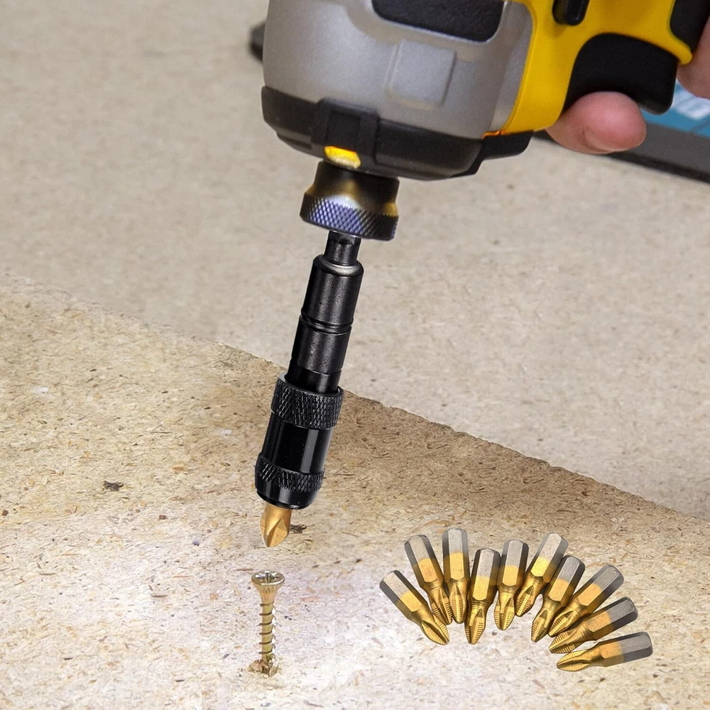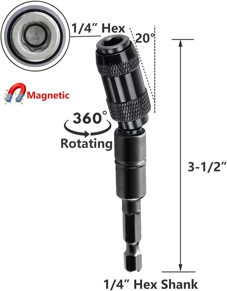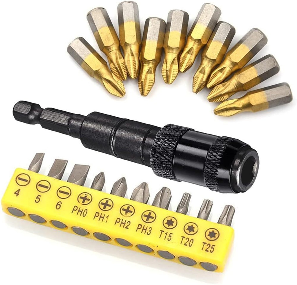 20° Pivoting mode and rotating design allows for perfect accessibility in tight spaces, corners and hard-to-reach areas. Can be used in straight or pivot mode by adjust the locking collar. Built-in strong magnet, can be quickly connected to the 1/4 inch hex shank bit and socket. 1/4" Hex quick change shank, ideal for use in impact drivers to extend all kinds of screwdriver bits, drill, batch head, screwdriver head, etc. Made of high-quality metal materials, which is strong and durable. Come with 20-Piece screwdriver set, includes 10pcs PH2 Titanium Coated Screwdriver Bits & 10pcs Slotted Phillips Torx Screwdriver Bits Product Description Pivoting Bit Tip Holder with 20-Piece Slotted Phillips Torx Screwdriver Set Tackle any drilling and fastening task with confidence using the Yakamoz Pivoting Bit Tip Holder and 20-Piece Screwdriver Set. Engineered for precision and flexibility, this set is perfect for professionals and DIY enthusiasts who need to work in tight spaces and corners. Specification - Pivoting Bit Tip Holder Shank Size: 1/4" Hex Total Length: 3-1/2" Holder Fits Bit Tip Type: 1/4" Hex Maximum angle: 20° Material: Chrome Vanadium Steel Specifications -10pcs PH2 Titanium Coated Screwdriver Bits Material: S2 titanium coating The head type: PH2 Shank: 1/4" Hex Length: 1" Package 1 x Magnetic Pivot Bit Holder 10 x PH2 Titanium Coated Screwdriver Bits 10 x Slotted Phillips Torx Screwdriver Bits Feature: Designed with a locking collar, allowing to flex up to 20 degrees for either straight or angled driving. 1/4'' Hex shank which allows for using in any chuck or impact driver. Suitable for electric screwdriver, manual screwdriver, electric drill, pneumatic drill, etc. Made of engineered steel for maximum strength and flexibility. PH2 bits are suitable for home screws and major electrical appliances.