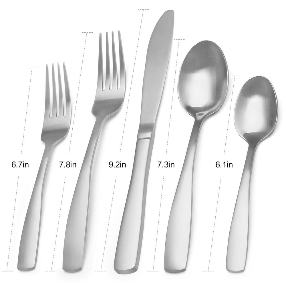【MODERN DESIGN】: Its fashion and elegant appearance can be a good match for your existing silverware and elevate everyday meals into a fine dining experience. 【SERVICE FOR 4】: 20 pieces silverware set includes 4 dessert forks, 4 dinner forks, 4 dessert spoons, 4 dinner spoons, and 4 dinner knives. 【HIGH QUALITY MATERIAL】: Constructed by high quality rust-resistant stainless steel, excellent resistance against corrosion, extremely durable. 【FUNCTIONAL】: Healthy and handy silverware would bring more joy to your dining experience. Perfect for Daily Use / Gathering / Parties / Camping /Restaurant / Hotel. 【DISHWASHER SAFE】: This silverware set is dishwasher safe, making clean up easy and convenient, your proper care can make the utensil sets always looks as good as new, and enable it to last for many years.