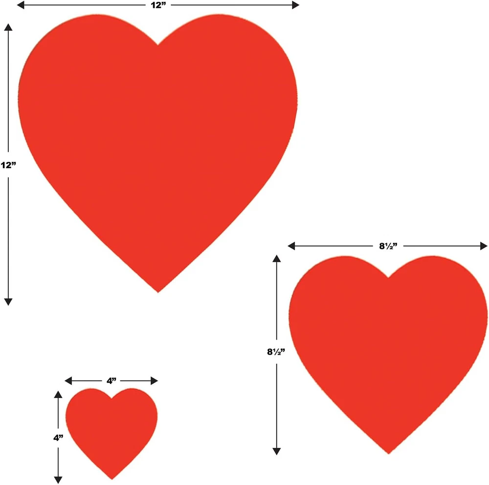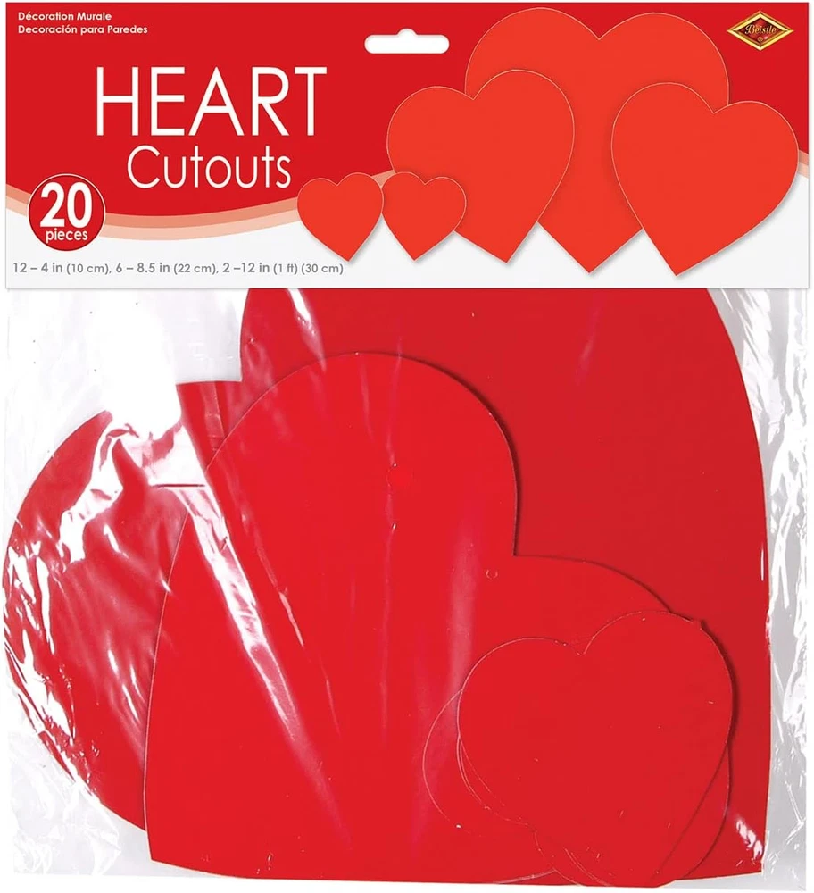 100% Paper Made in the USA MADE IN THE USA INCLUDES: 20 printed red heart cutouts in package MEASURES: Twelve 4 inch cutouts, Six 8. 5 inch cutouts and Two 12 inch cutouts PRINTED: Both sides of boardstock paper USE these pretty red heart cutouts to decorate for Valentine’s day! *** Beistle Printed Heart Cutouts *** The package contains 20 red heart cutouts in assorted sizes. You will receive twelve 4-inch cutouts, six 8. 5-inch cutouts and two 12-inch cutouts. These pretty heart cutouts are printed on both sides of boardstock paper. They make great decorations for Valentine’s Day! ***PROUDLY MADE IN THE USA *** *** Party Planning Made Fun *** From New Year’s Eve Parties, Halloween and Fall Festivities, Bachelorette Parties, Birthday Bashes, Graduation Get-Togethers, Baby Showers, Pool Parties, and more, our Novelty Items and Party Supplies are sure to add a pop of color and extra spice to any occasion. *** Celebrating life's events - one party at a time *** The Beistle line includes over 8,000 items - products for nearly any event, celebration, or theme imaginable. Since 1900 our mission has remained the same: Create products using the finest materials and to the highest standards. Our customers, products, and employees make us who we are. We are The Beistle Company!