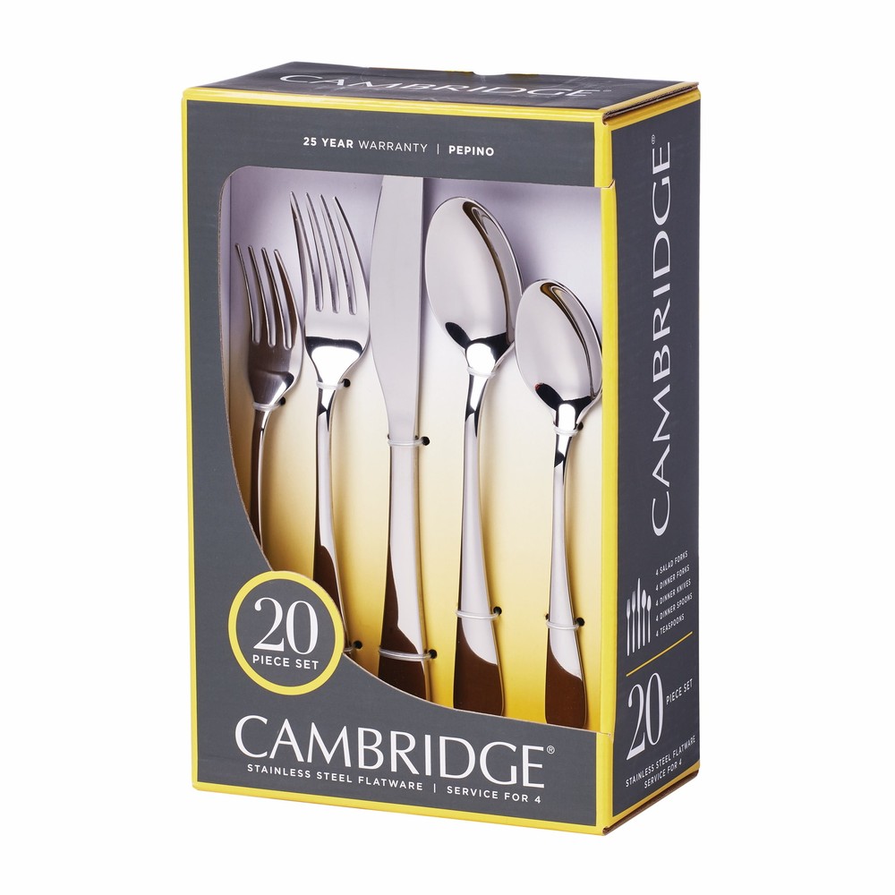 The 20-Piece Stainless Steel Flatware Set (Service for 4) is designed to enhance your dining experience with its elegant style and durability. Crafted from high-quality 18/0 stainless steel with a sleek mirror finish, the set includes 4 dinner forks, 4 dinner knives, 4 dinner spoons, 4 teaspoons, and 4 salad forks. Dishwasher-safe for easy cleanup, just be sure to remove food residue before loading and avoid abrasive cleaners like steel wool or citric acid detergent. This set combines both practicality and sophistication, making it a perfect addition to your home. 20 Piece Set includes 4 dinner forks, 4 dinner knives, 4 dinner spoons, 4 teaspoons and 4 salad forks Mirror Finish 18/0 Stainless Steel Dishwasher Safe - remove any food soil prior to loading into the dishwasher. Avoid using abrasive cleaning agents such as steel wool and citric acid detergent. Do not soak, clean after use.