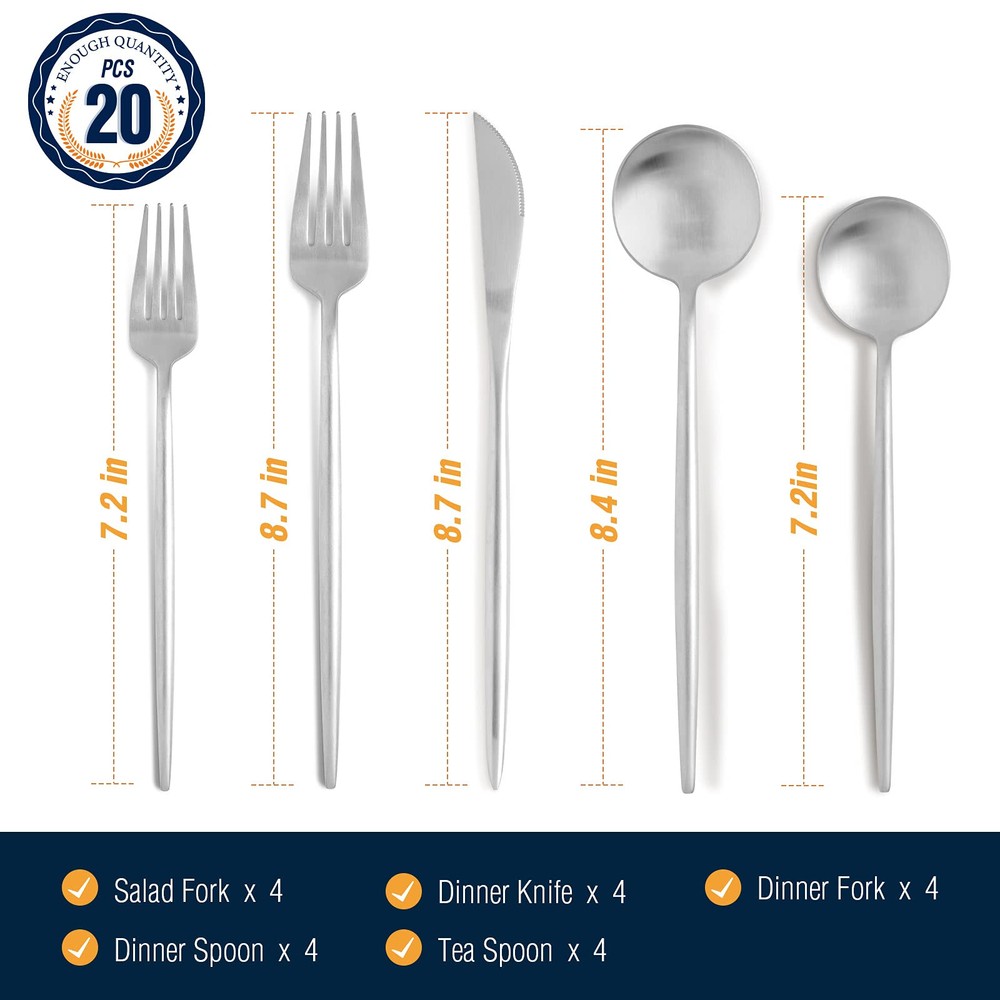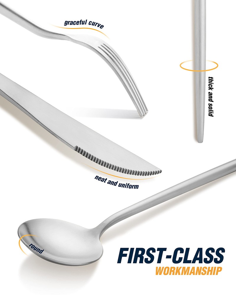 【Silverware Set For 4】This flatware set service for 4 people which contains 4 dessert fork, 4 dessert spoons, 4 dinner forks, 4 dinner spoons, 4 dinner knives. 【Stainless Steel】This eating silverware set is made from premium stainless steel material, with no sharp edges, stylish and extraordinary, round and sleek lines, especially the edges where your fingers hit are smooth for safe use. 【Dishwasher Safe】This kitchen utensils set is easy to clean and dishwasher safe. It is heavy-duty and sturdy. Your proper care can make the utensil sets always look as good as new, and enable it to last for many years. 【Mulit-application】Sturdy kitchen silverware sets are perfect for any formal or informal occasions, such as home, restaurant, hotel, Suitable for wedding, traveling, camping, party, catering, Also as a good gift for family and friends. 【How to know whether it is good brushed silverware】 Ordinary silverware is made in 9 processes, advanced is made it in 16 processes ; Ordinary silverware can only be washed for 25 weeks before the color starts to fade, while high-end can be washed for up to 50 weeks; Ordinary is not artificially involved, the edge of the silverware is not further rounded, easy to hurt the mouth, high-does not exist this problem. Please carefully identify, rest assured to buy!