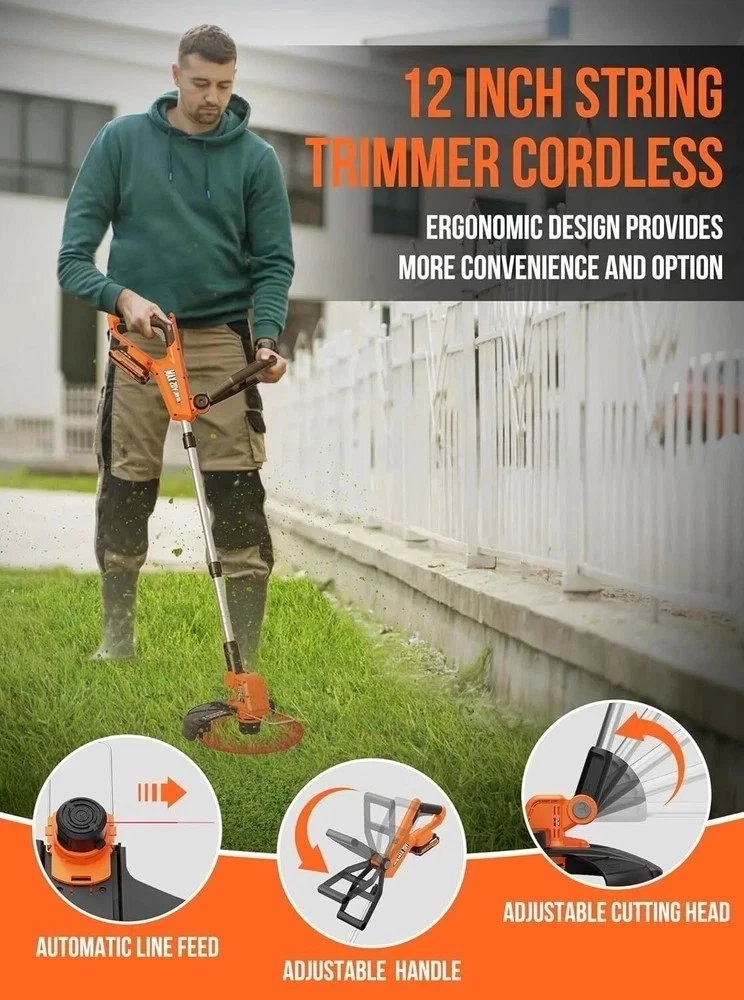 About this item 【2-in-1 String Trimmer & Edger】VARSK Professional string trimmer effortlessly converts between trimming and edging modes, simply press the 90° rotation button and rotate the aluminum tube 90° to the left. Saving you time and money on separate yard tools. With the 8700RPM advanced motor, it will help you finish multiple works for your lawn, garden, yard, etc 【Smart Auto-Feed Line Technology】Never stop to adjust lines mid-task! Our advanced string trimmer automatically feeds fresh cutting line when needed and self-cuts excess length for consistent, uninterrupted yard maintenance. The spacer guard will protect your plants and lawn ornaments 【2x 2.0Ah Batteries and Fast Charging】Comed with 2 x 2.0Ah lithium-ion batteries, power through tough jobs with our longest-lasting string trimmer. Dual batteries provide 50% more runtime than single battery, delivering 30+ minutes of cordless freedom for your yard 【Lightweight and Adjustable Design】Weighing just 5.3 lbs, this easy-to-maneuver string trimmer features a 180° adjustable handle and 80° pivoting cutting head for multi-angle operation. You can use it in many hard-to-reach places. The integrated stabilizer wheel ensures professional edging results with balanced control, making tight space trimming effortless 【6 Bonus Spools + 1 Year Warranti】Includes 6 premium replacement spools (3 X longer life) for quick no-tool swaps. Backed by hassle-free 1-year warranti - your ultimate durable string trimmer investment. If you have any problems, please don't hesitate to reach out to us, and we will answer it within 24 hours Product Description Previous page Next page Previous page Next page 2 IN 1 TRIMMER & EDGER TRIMMING EDGING Previous page Shipping We offer FREE shipping on all orders! We ship within Three business days of payment, usually sooner. We use a selection of shipping services such as UPS, FedEx, USPS etc. Local pickups and combined shipping options are not provided at this time. Return You can return a product for up to 30 days from the date you purchased it. Any product you return must be in the same condition you received it and in the original packaging. Please keep the receipt. Payment We accept payment by any of the following methods: PayPal Please pay as soon as possible after winning an auction, as that will allow us to post your item to you sooner! Feedback Customer satisfaction is very important to us. If you have any problem with your order, please contact us and we will do our best to make you satisfied. Contact Us If you have any queries, please contact us via ebay. We usually respond within 24 hours on weekdays. Please visit our eBay store to check out other items for sale! Thank you for shopping at our store. Disclaimer We are working with different suppliers in USA to deliver the item to your doorstep. If you have any issues regarding the item, Feel free to ask.