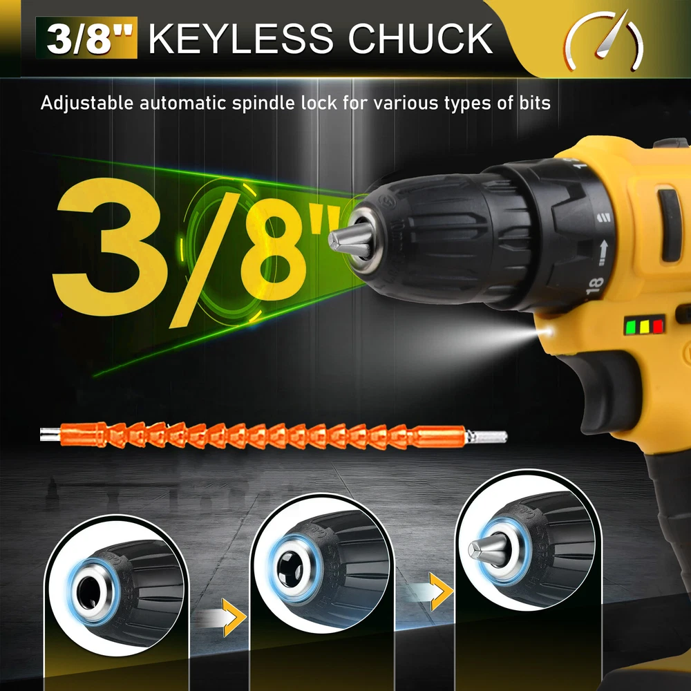 20V Cordless High Power Drill Set 3/8" Keyless Chuck And 18+3 Torque Setting