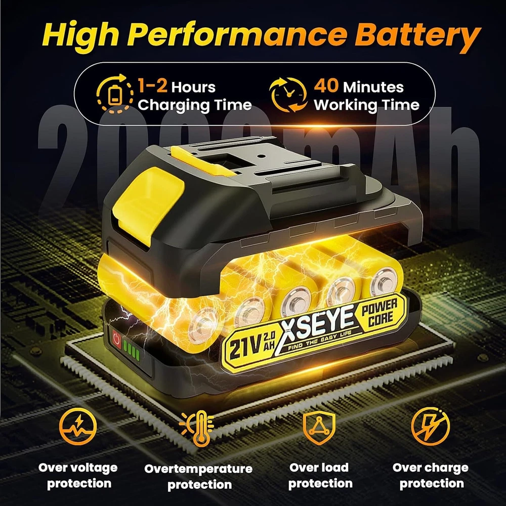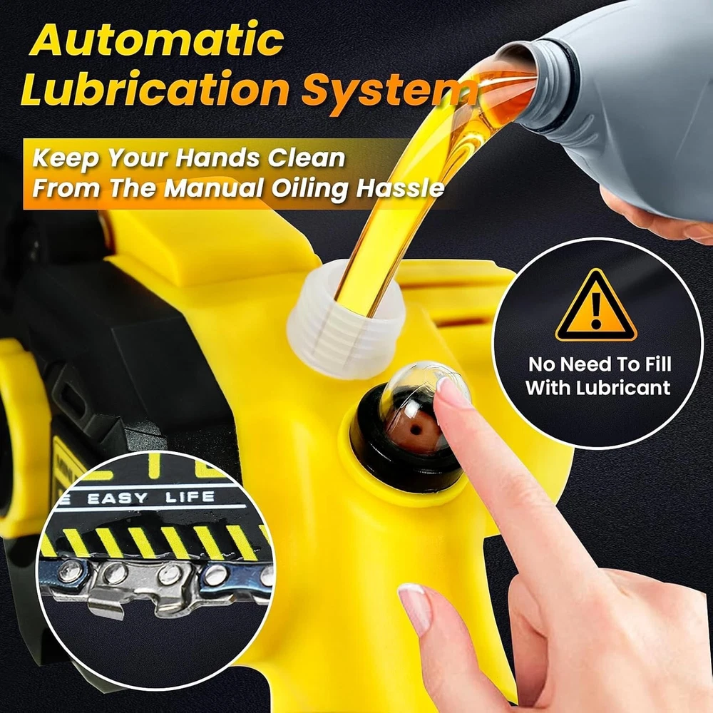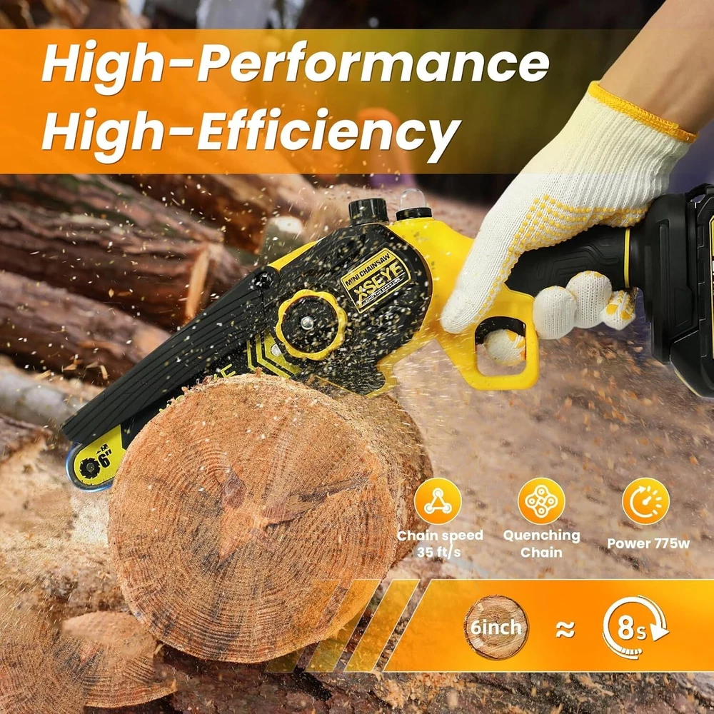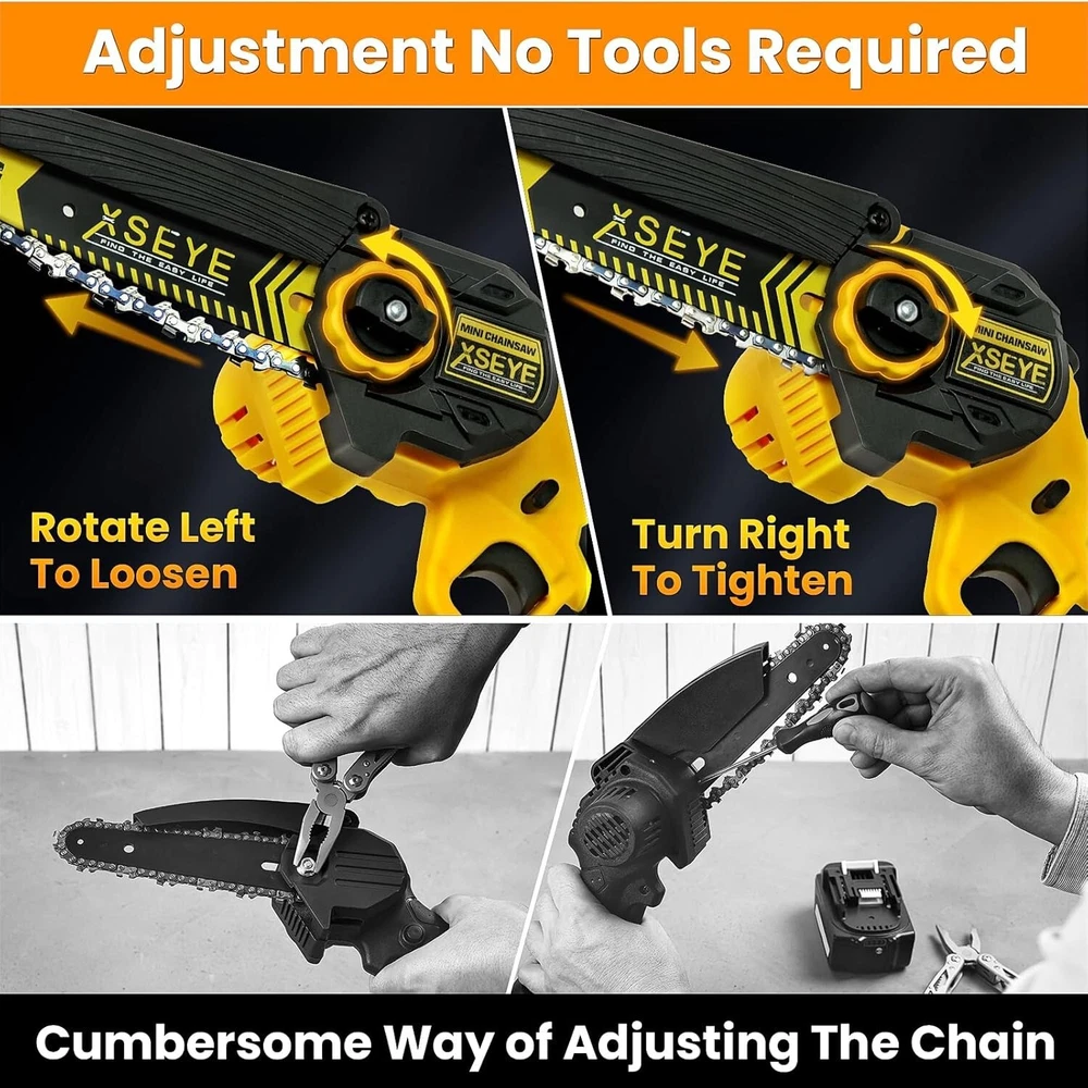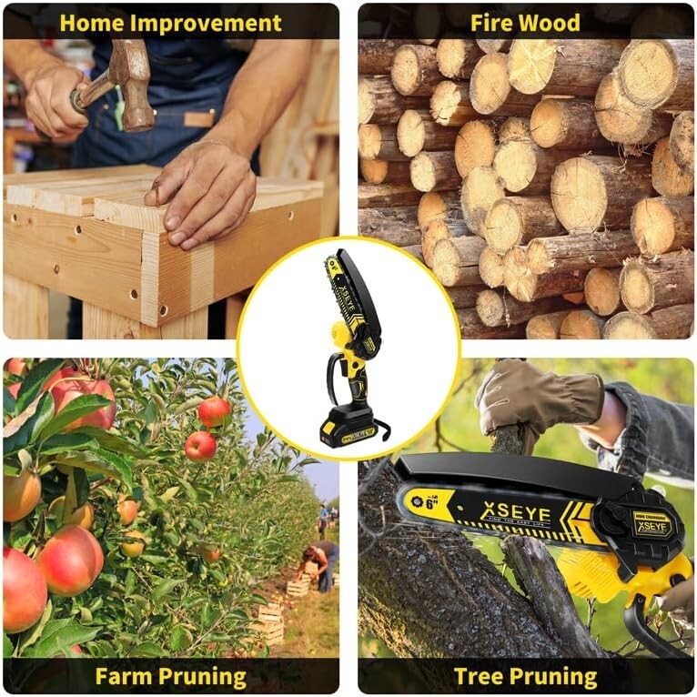 【AUTO-LUBRICATION SYSTEM】XSEYE mini chainsaw features an automatic oiling system for easy maintenance. Simply pour oil into the tank, tighten the cap, and squeeze the bulb a few times to lubricate the chain. The auto-lubrication system reduces chain wear, extends its lifespan, and ensures smoother, more efficient cutting. 【BATTERY POWER INDICATOR】This mini chain saw battery powered comes with a 21V 2000mAh rechargeable lithium-ion battery, providing long-lasting power and easy removal for convenient recharging anytime. The battery includes a power indicator, so you can easily monitor remaining usage time. Perfect for a variety of cutting tasks, the electric tree trimmer excels in wood cutting, garden trimming, pasture maintenance, backyard work, and more. 【550W PURE COPPER MOTOR】This electric chainsaw cordless features a robust 550W pure copper motor, delivering an impressive idle speed of up to 19,000 RPM for powerful performance. Equipped with a high-quality metal chain, it effortlessly cuts through branches up to 6 inches (15 cm) in diameter, as well as wood and more. Ideal for tree trimming, camping, and gardening, it makes these tasks hassle-free and efficient. 【LIGHTWEIGHT & PORTABLE】XSEYE Lightweight Mini Cordless Chainsaw weighs just 5.86 pounds and features an ergonomically designed handle for comfortable, fatigue-free one-handed use. It’s easy to maneuver and a joy to work with, making it ideal for beginners and gardeners alike. The cordless design ensures excellent portability, even in tight spaces. 【SAFETY LOCK】User safety is our top priority, which is why the mini chainsaw is equipped with a safety lock. The cordless chainsaw only activates when both the safety lock and trigger are pressed simultaneously. Additionally, a removable, adjustable splash guard on the guide plate helps prevent flying debris, while the included goggles offer excellent eye protection. 【PERFECT GIFT CHOICE】XSEYE mini chainsaw cordless is your first choice of gifts for Men Dad Him Husband Gardener Wife at Christmas Birthday Anniversary, etc. Choose this mini cordless chainsaw and bring him/her a holiday surprise! 【365-Day Warranty for XSEYE Products】 We are committed to product quality and offer a 365-day support plan—no complicated return process required. Check the "Product Description" section for helpful usage and maintenance tips. If you have any questions, our team is always ready to assist you.