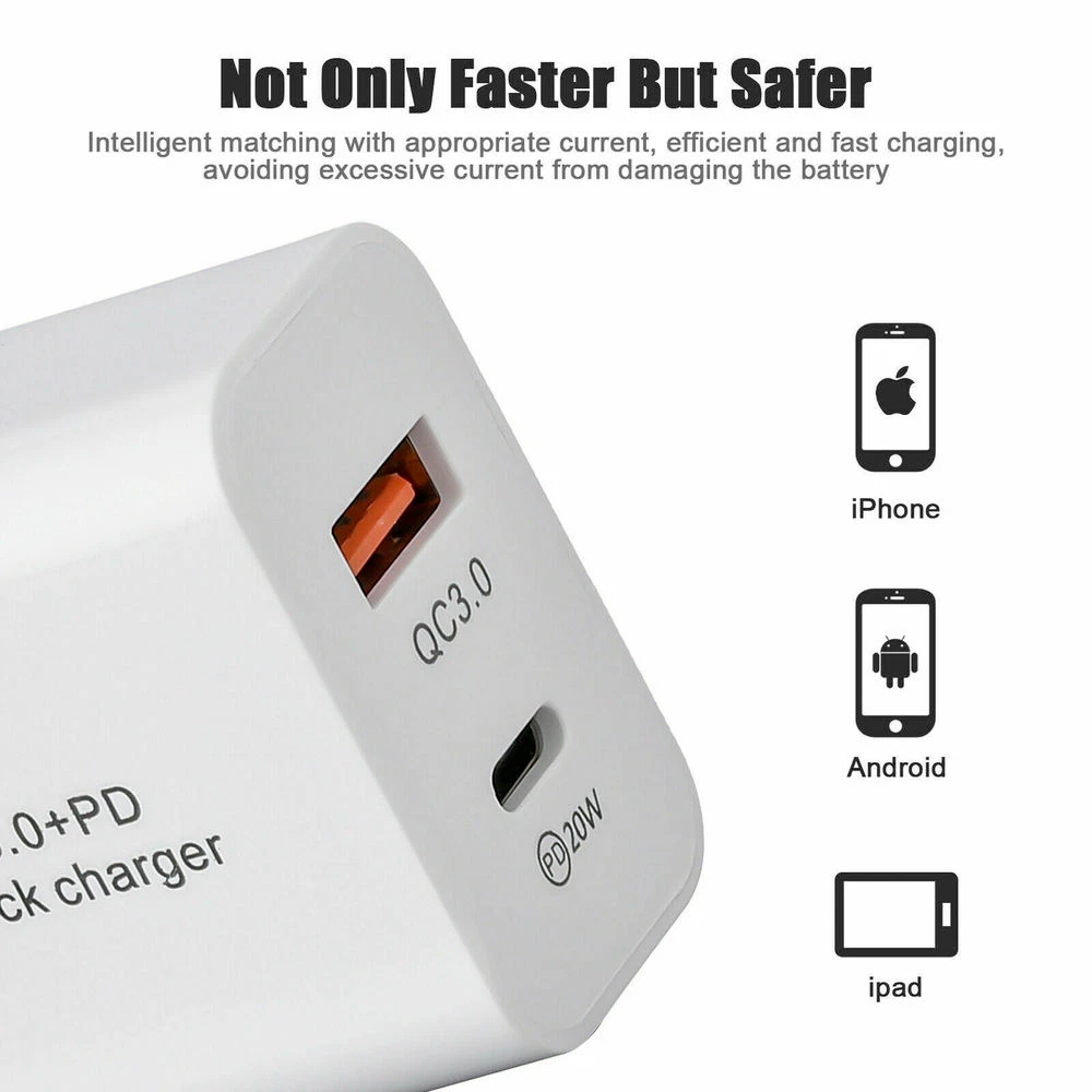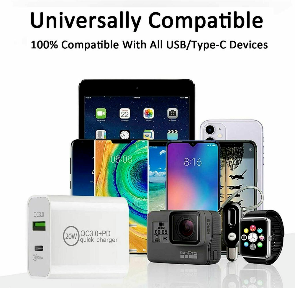 Description: 【20W Dual Port Fast Charging】Equipped with USB-C (PD Power Delivery) and USB-A (QC3.0 Quick Charge) dual port with totally 20W output, you can charge two devices at the same time 【The USB-C Port】20Watt Type-C PD Power Delivery -The latest generation fast charging technology, Charge 2.5x faster than the 5W charger, you can charge for iPhone 12 from 0 to 50% in about 30 minutes ( Fast charging List: iPhone 12 / Pro / Max / Mini, iPhone 11 / XS / X / XR / 8 / 8 Plus ) 【The USB-A Port】 QC 3.0 Quick Charge - Max speed charge your QC3.0 Enable Devices, Including for Samsung Galaxy S20/S10/S9/S8/S7, Moto, LG More Android Phones, also can charge for iPhone, iPad in ordinary speed. 【Safe and Compact】 Built-in smart chip will prevent over-current, overcharging, overheating and high temperature to protect your device safety. The USB C Charger small and exquisite, you can take everywhere. For iPhone Charger Cable: Full Support with iOS versions and all future updates Strong and durable premium material support upto 5500 times bending High coverage aluminum foil makes data transmission is not disturbed by external signals Gold-plated C48 terminal and tinned copper material ensures charging performance increased by 30% Fast Charging speed and High Speed transmission Compatible with Devices: For iPhone SE 2020/13/12/11/ Pro/Max/iPhone Xs/Max/XR/X/8/8 Plus For iPhone 7/ 7 Plus / 6s Plus / 6s / 6 Plus For iPhone 5s / 5c / 5 / SE For iPad Pro / iPad Air / Air 2 For iPad mini 2 / mini 3 / mini 4 For iPad 4th gen For iPod Touch 5th gen / iPod Nano 7th gen and Beats Pill+ Package Included: 2X 3ft/6ft USB Cable (Optional) 2X Dual Port Adapter (Optional)