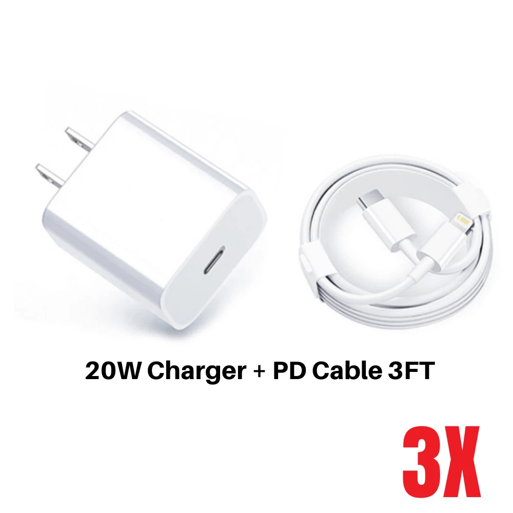 3X 20W USB C Fast Charger Adapter PD Cable For iPhone 14/13/12/11Pro Max XR iPad Specification: Type: PD Fast Charger, Wall Charger , Power Adapter, Car Charger, Charger Adapter, USB-C Cable, Charging & Data Sync Cable, Type-C, USB Cable, USB-C to iPhone Cable Features: Fast Charge, Lightweight Color: White Length: 1m/3ft,2m/6ft Ultra-Fast Charging : 20W USB-C For iPhone fast charger, For iPhone 12 up to 50% in just 30 minutes, which saves more than 1 hour for you, when compared to the 5W original charger. Fast Charging & Data Transfer : Top quality For iPhone cable is made of excellent copper cord, which charge For iPhone safely and fast. Work perfectly with wall charger or computer. It not only a safe For iPhone charge cable, but also a fast transferring For iPhone data cable. Tangle-free 6 Foot length is convenient for usage while charging and sync at home/office/travel in bed, hotel rooms, and more. Safety Protection: The Charger Internal High-Quality Chips Protect Your Devices from Heating, Short-circuiting, and over Charging. Our Technology Teams Make Tens of Thousands of Tests to Ensure Users and Devices Safety . Universal Compatibility: 20W USB-C power adapter & C to iPhone cable set, compatible with for iPhone 12/12 Mini/12 Pro/12 Pro Max/11/11 Pro/11 Pro Max/XS/XS Max/ XR/X/8 Plus/8, For iPad Pro/Air/ Mini and More. Travel Ready : Lightweight and pocket-size, USB-C wall charger with 3FT charger cable maximizes portability wherever you go. And a wide range of 100-240V input makes it ideal for world travel. Comprehensive Compatibility : With the Corey kin 20W wall charger to access the fast charging for iPhone 12/12 Mini/12 Pro/12 Pro Max/11/11 Pro/11 Pro Max/XS/XS Max/ XR/X/8 Plus/8/7/7 Plus/6; for iPad Pro 10.5”/for iPad Air 3 10.5”/for iPad Mini5 7.9” and More