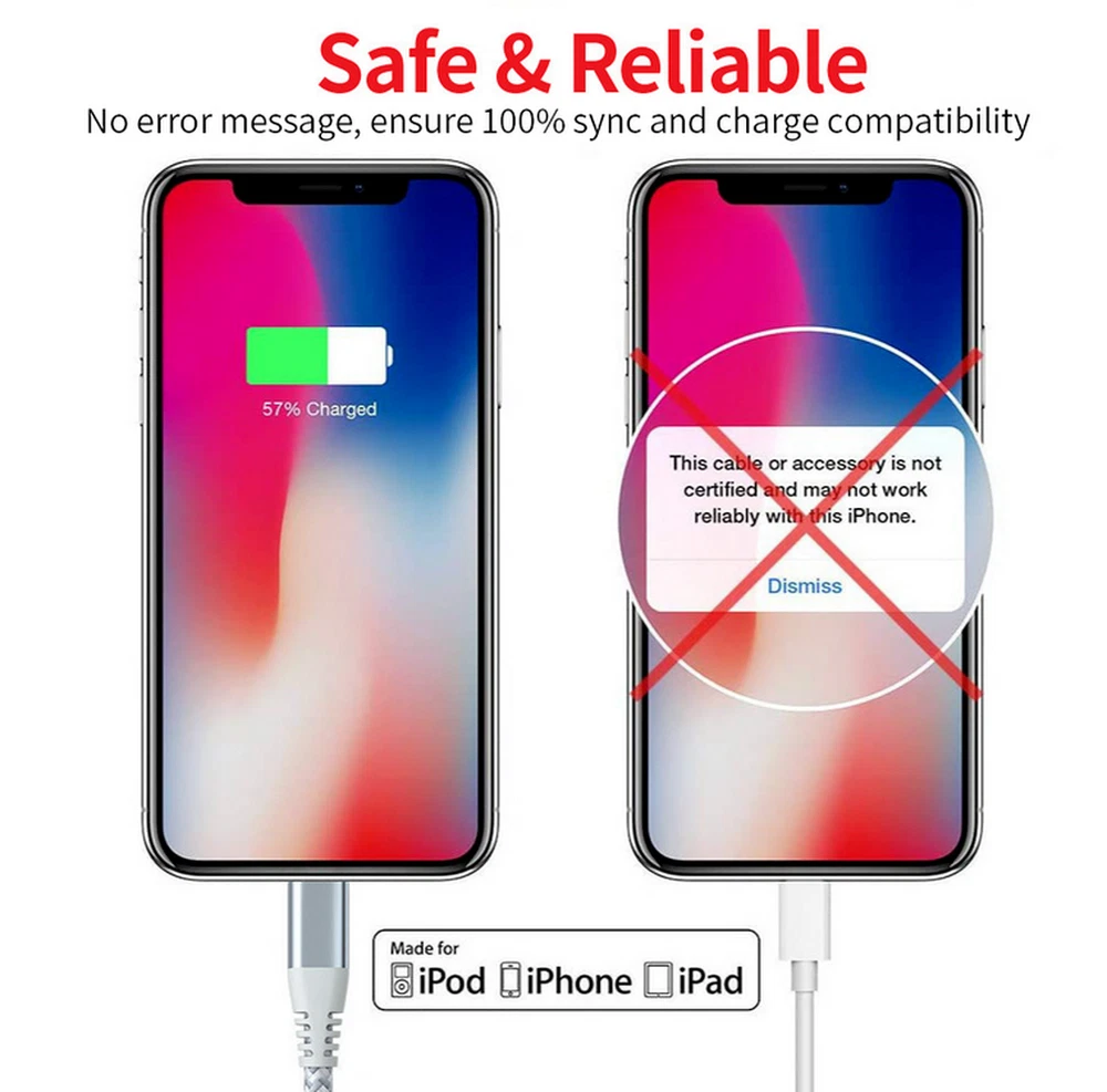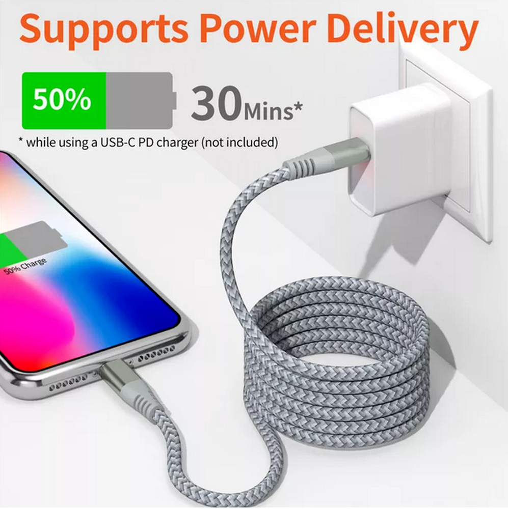 Description: PD fast charging & Sync. Charge your for iPhone 13 up to 50% in 30 minutes when using a USB-C PD charger, almost 3x faster than the regular charger; Safe, reliable, fast charging and syncing. Built to last. The durable braided nylon casing ensures fewer tangles and more tensile strength, proven to withstand over 15,000 bends in strict laboratory tests. Quality aluminum connector ensures your cable won’t get damaged when plugging in and out frequently. Compatibility. This cable supports fast charging for iPhone 13 series, iPhone 12 series, iPhone SE 2020, iPhone 11 series, iPhone X series, iPhone 8 series, iPad Pro 12.9 1st and 2nd gen, iPad 8th gen, iPad Pro 10.5; supports standard charging for iPhone 7/6, etc; 18W or above USB-C PD wall adapter is required for fast charging. Specifications: Jacket: Nylon braided Function: Charging + Sync Bend Lifespan: 15,000+ Color: Grey Length: 6FT/10FT Compatibility: PD Fast Charging: Compatible with iPhone 13, 13 Pro, 13 Pro Max, 13 Mini, iPhone 12, 12 Mini, 12 Pro, 12 Pro Max, 11, 11 Pro, 11 Pro Max, XS Max, XS, XR, X, 8 Plus, 8 and iPad 8th iPad 2020, iPad Pro 12.9" Gen1, iPad Pro 12.9" Gen2, iPad Pro 10.5", iPad Air 3 10.5", iPad Mini 5, AirPods and AirPods Pro, etc. Non-PD Charge (only normal charge): Compatible with iPhone 7/7plus/6s/6s Plus/6/6Plus/5s/5c/5/SE (2016) Compatible with iPad Pro 9.7 inch/iPad 9.7 inch/iPad Air 9.7 inch/iPad mini 7.9 inch/ipod touch Attentions: Please allow tiny size deviations due to human measurement. Due to the effect of light and monitor's brightness, there may be slight differences between the color tone of the photo and the actual item USB-C PD charger not included. You need a USB-C Power Delivery wall charger to achieve fast charging. Package Included: 1/2/3 x PD Cable