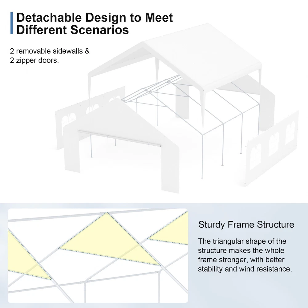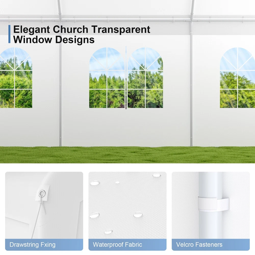 FEATURES: • Heavy-duty structure: High quality trust&corrosion resistant white powder coated steel frame with compression lock, more secure and stable. • Super large field: 20X19.5FT large space allows you to give more play to the site layout. • Weather resistant: Heavy-duty 180g PE top , waterproof, with UV protection. • Humanized design: The windows will not make you feel depressed when you stay inside. People outside can also see the situation inside. • Versatility of use: It is applicable to various occasions, such as commercial, business, party tent, wedding tent, etc. • Easy to install: Complete accessories and detailed installation instructions are provided for you to get started quickly. • NOTE: Please avoid using in harsh weather conditions and avoid irreversible damage to the product. • NOTE: Ships and arrives in 2 separate boxes. Delivery times may vary per box. Please contact after-sales service for any problems,and we will reply within 24 hours. SPECIFICATIONS: • Color: White • Material : Powder Coated Steel & 180g PE • Pipe Size: Φ38mm, thickness 1 mm • Connector Size: Φ42mm, thickness 1.2 mm • Overall: 20' W x 19.5' D x 11.7' H • Overall Product Weight: 170 lb. • Roof Hanging Weight Capacity: 5 lb. ITEM INCLUDED: Assembly Instructions, Base, Connector, Hardware, Ropes, Stakes .