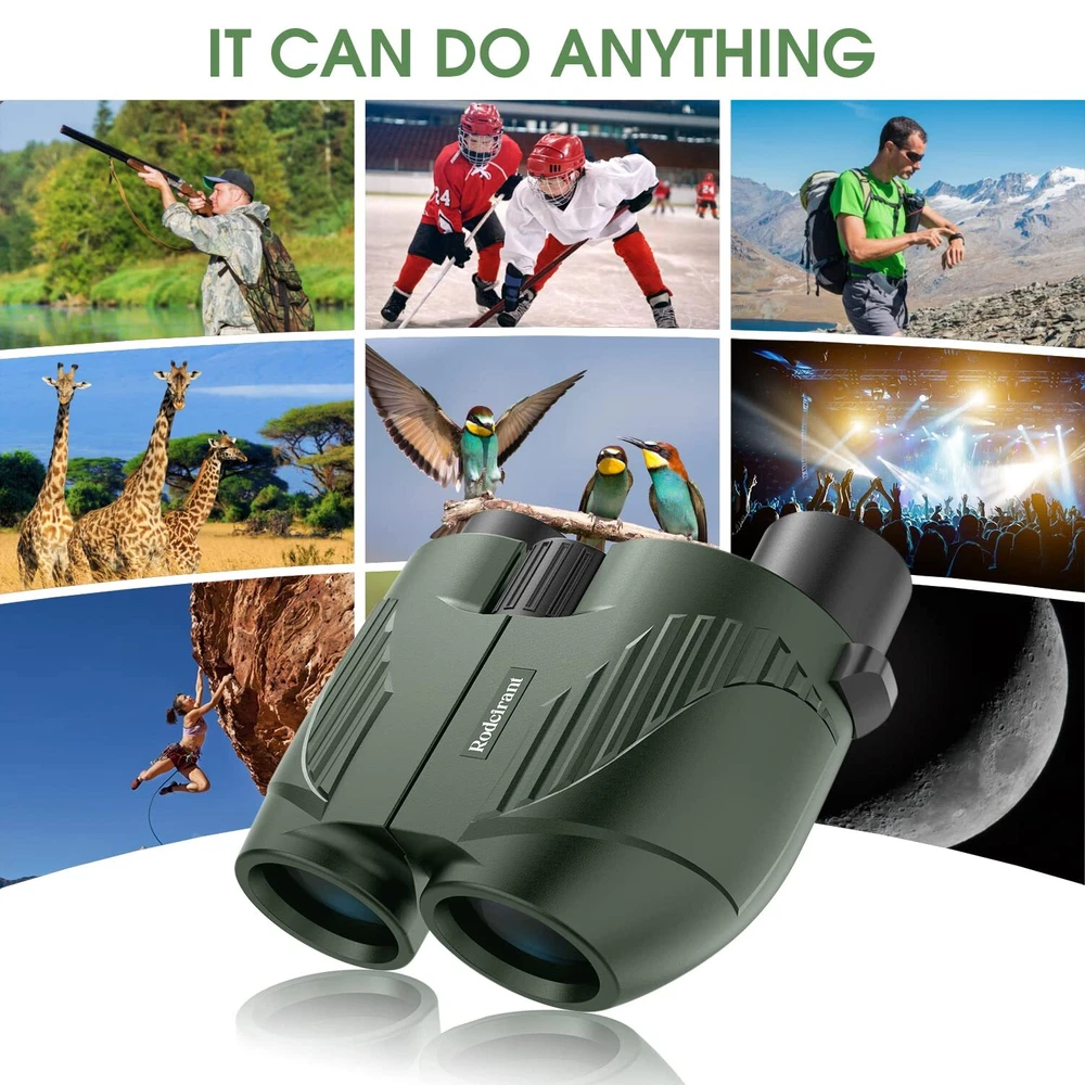 Binoculars 20X25,with 16mm large eyepiece,20X25 binoculars provide high definition without a color-changed or blurred image. The 20 magnification boasts a viewing field of 399ft at 1100 yds,and delivers large and clear details. Compact binoculars,lightweight,BAK4 prism.Multiple layer coated aspherical lenses elements for light reflection and minimal distortion, better image brightness, contrast and quality, even in low light condition. The binoculars provides brighter,clearer images and more comfortable observation for you. Because of 99.68% Light transmission, You can easily get bright, contrast images, and non-chromatic aberration. Easy to Focus,Compared with other large and heavy binoculars,This compact binoculars fold up for easier placement in a pocket or backpack and can be carried around as they weigh just 0.5lb. moderate size for both 8-12 yrs old and adults to use. Made of shockproof and soft silicone, it can protect your and your ' eyes. Low Light Night Vision,the external non-slip rubber armor of the binoculars can absorb shock while provide a firm grip, offering you excellent user experience.Based on this our binoculars also provide low light night vision. Waterproof binoculars,Daily Waterproof fog-proof body with rubber coated finish, durable and portable for outdoors, even suitable for hostile environment. These small binoculars are used for various activities, such as bird watching, hiking, hunting, sports and other "on the go" activities.