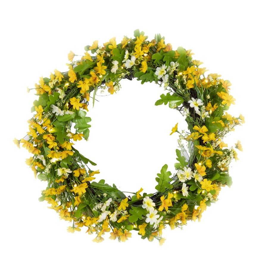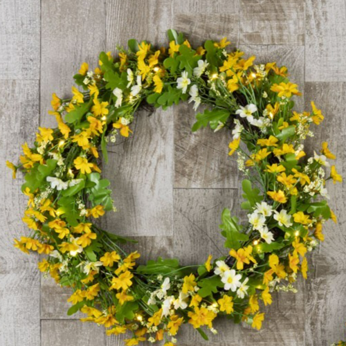 Battery operated 19.5 inch Daisy wreath for spring. Beautiful addition to your entry door or use tabletop as a candle ring. The uses are endless. 19.5 Inch Diameter Faux Daisy Flowers 3 x AA Batteries sold separately 6 Hour Timer Feature A great addition anywhere in your home for a fresh look Product Specifications SKU: #2584150 Size: 19.5" Dia Color: Yellow, white, green Scent: Unscented Type: Pre Lit Daisy Wreath Timer: 6 Hours Battery Size: 3 x AA