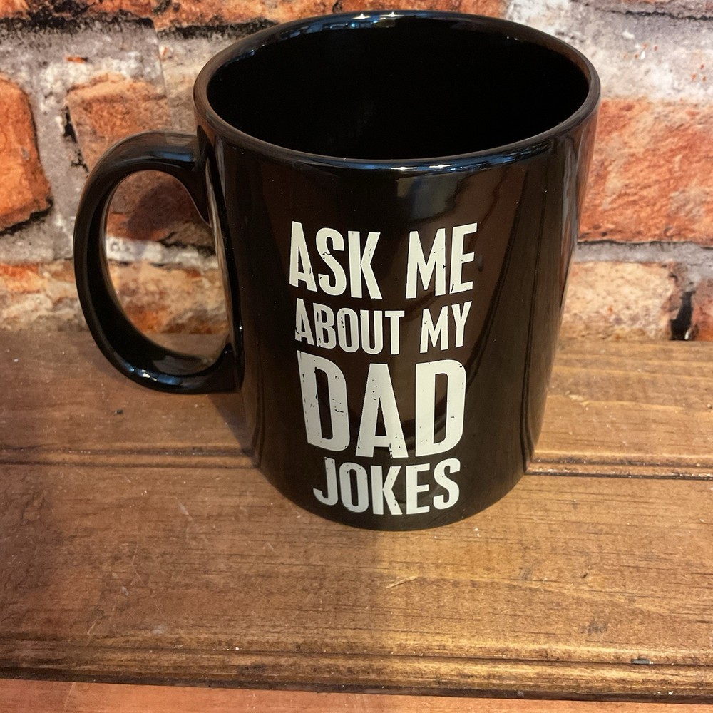 Sip your morning brew in style with the "Ask Me About My Dad Jokes" Coffee Mug, a playful addition to any kitchen or coffee nook. Made by Primitives By Kathy, this mug features a witty White Lettering on a Black background that's sure to spark a conversation among friends and family. The mug has a 20-ounce capacity, perfect for your favorite hot beverage, be it coffee, tea, or hot chocolate. Its sturdy construction ensures that your drinks maintain their temperature while you enjoy the humor it brings to the table. Good in the Microwave and Dishwasher Add a touch of humor to your daily routine with this charming and functional mug.