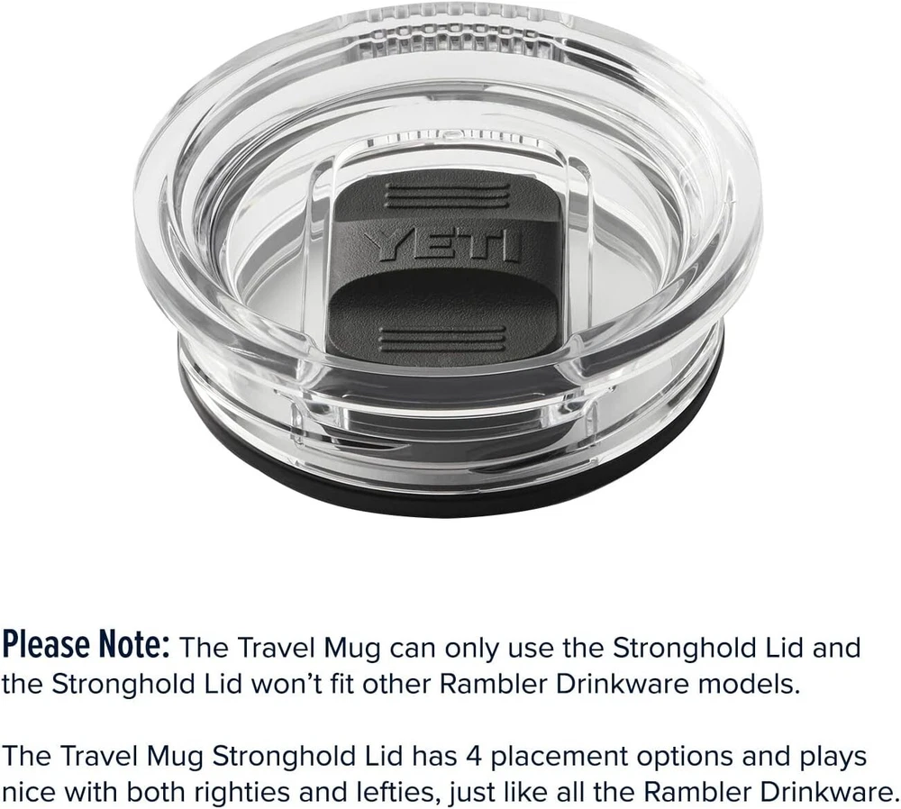 Bring on the potholes, quick turns, and backcountry roads because this 20oz. travel mug holds enough caffeine for even the biggest coffee drinkers. Features 18/8 STAINLESS STEEL that resists dents and drops. DOUBLE-WALL VACUUM INSULATION that keeps drinks cold to the last drop. DISHWASHER SAFE because no one needs more work to do. STRONGHOLD LID - Twist-on, twist-off lid backed with dual-slider magnet technology to keep your coffee full and worries away. (As long as it’s closed.) 360-DEGREE WELDED HANDLE - Cup-holder compatible and gives you a firm grip on your beverage of choice. Please Note: The Travel Mug can only use the Stronghold Lid and the Stronghold Lid won’t fit other Rambler Drinkware models. The Travel Mug Stronghold Lid has 4 placement options and plays nice with both righties and lefties.
