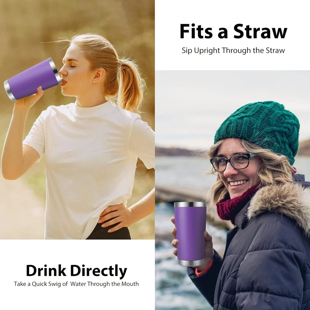 20oz Stainless Steel Tumbler Bulk with Lid, Double Wall Vacuum Insulated Travel Mug, Powder Coated Coffee Cup Powder Purple, 8 DURABLE EXTERIOR WALL: The tumbler pack are made with high-grade 304 18/8 Food Grade steel, anti-rust and lead free, unbreakable and stands up to heavy use through every season. Clear press-on top helps you see what's inside. EXCELLENT TEMPERATURE RETENTION DESIGN: The bulk cups keep your on-the-go beverages hot for three hours or cold for nine hours, perfect for daily use. MULTIFUNCTIONAL USE: Superior powder coating finish against chips and scratches, sweat free, outside stays dry. Grip fits easily in your hand, fits in most vehicle holders. EASY CLEANING: Hand washing is recommended, electro-polished interior doesn't transfer flavor & no aftertaste. You don't have to worry about your morning or afternoon teas being ruined. SATISFACTION GUARANTEE SERVICE: We are determined to provide the best product and high quality service. If you have any question, pls contact me as soon as possible. The video showcases the product in video guides you through product video compares multiple video shows the product being unpacked.