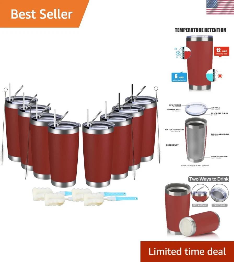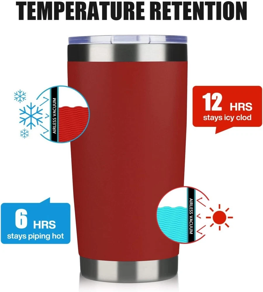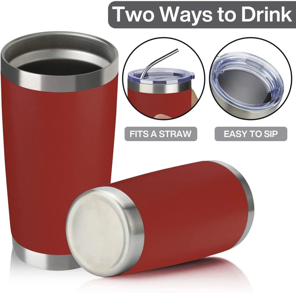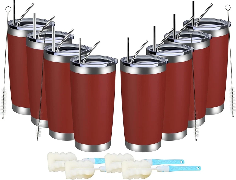 20oz Tumbler 8 Pack Double Wall Vacuum Insulated Travel Mug Bulk, Stainless Steel Tumblers with Lid and Straw, Powder Coated Coffee Cups for Cold & Hot Drinks Red, Set of 8 DOUBLE WALL VACUUM INSULATION: Enjoy Beverage Cold or Hot Under normal temperature, it can keep a tumbler of ice cake for 12h until the ice totally melt, or hot coffee warm for 6h DURABILITY- 18/8 food grade stainless steel body, No BPA, healthier than plastic cup. The insulated tumbler never sweat due to the Vacuum insulated design. Powder coating on the outside fits more comfortably in your hand, looks good, anti-slip APPLICABLE TO VARIOUS OCCASIONS - vacuum travel tumbler great for outdoor adventure, road trips, sports event, also the perfect travel cup to bring coffee from home to work or fill a tumbler of drink before you go to bed to drink through the night EASY CLEANING: hand washing is recommended, electro-polished interior doesn't transfer flavor & no metal aftertaste, you don't have to worry about your morning coffee or afternoon teas being ruined [Package included]8*20 oz glitter tumbler,8*splash proof cover with hole, 8*straight steel straw, 8*bend steel straw,4*cup brush,4*straw brush Stainless Steel Vacuum Insulated 20oz Tumbler with Lid Perfect Design: ● Double-Wall vacuum insulation technology. ● Removable lid with a straw hole, makes it convenient for you to insert a straw. ● Fits Most Cup Holders. ● Suitable size, it is easy to carry.