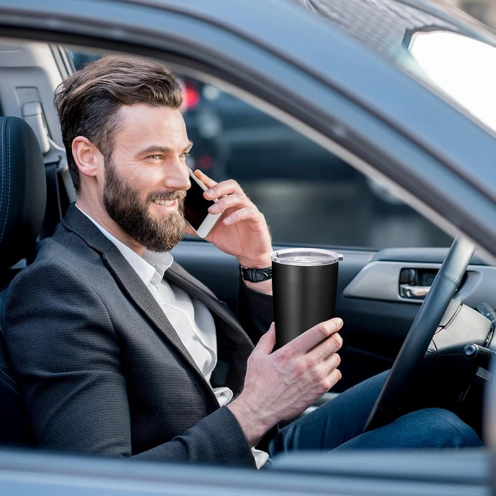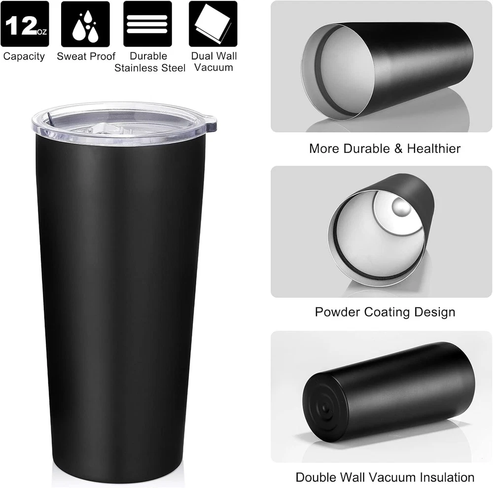 20oz Tumbler Bulk with Lid and Straw 12 Pack, Stainless Steel Vacuum Insulated Tumbler, Double Wall Coffee Cup Travel Mug, Black DOUBLE WALL INSULATION: Our classic water tumblers are double walled and vacuum insulated, which keeps your drinks hot up to 4 hours or cold up to 9 hours. The high-quality, no sweat design ensures your desk stays free of condensation STAINLESS STEEL SKINNY TUMBLER: Made of food grade stainless steel with Paint coating, no more worries about peeling or durable construction and splash-proof design make the travel tumbler great for indoor and outdoor use, it's an ideal coffee tumbler for keeping. Dishwasher cleaning is not recommended PORTABLE&ECO-FRIENDLY: Thanks to its slim and sleek body, it is easy to carry and store , also it fits in most cup holders. BPA free slider lid and plastic reusable straw are totally eco friendly and safe for drinking PERFECT GIFT SET: Each insulated tumbler comes with 1 splash-proof lid and 1 plastic straw. This 20oz tumbler is a stylish and practical gift for your friends, families, or colleagues on birthday, Christmas, Valentine's Day, Halloween, Mother's Day or Father's Day PRACTICAL TUMBLER: The coffee tumbler with sliding lid can be used as wine cups, champagne cups, water cup or sports fan travel mugs, suitable for parties, picnics, self-driving travelling, boats, beach, pool, camping and hiking, etc
