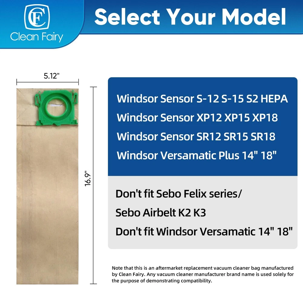 20pack Vacuum Filter Bags Compatible with Windsor Sensor S12 S15 XP12 XP15 FREE SHIP Compatible with Windsor Sensor S-12 S-15 & S2 HEPA Compatible with XP12 XP15 XP18 SR12 SR15 SR18 & Versamatic Plus 14" 18" Also fit Sebo C G&X series upright vacuums & Kenmore Professional Series Uprights Which Use Kenmore Type W 50015 Bag Don't fit Sebo Felix series/Sebo Airbelt K2 K3/Windsor Versamatic 14" 18" 20 bags, Replacement for 5300REP Vacuum Filter Bags The product size is indicated in the picture, if you are not sure whether it matches your vacuum cleaner model, please contact us for consultation before purchasing Note that this is an aftermarket replacement vacuum cleaner bag manufactured by Clean Fairy. Any vacuum cleaner manufacturer brand name is used solely for the purpose of demonstrating compatibility CF Clean Fairy vacuum cleaner bags 20pack Compatible with: Windsor sensor, Windsor Versamatic Plus, Sebo automatic, Sebo, Sears Kenmore Pro, AllStar Javelin, Century 400 U Vac, Triple S/SSS, SR12, SR 12, SR-12, SR15, SR 15, SR-15, SR16, SR 16, SR-16, SR17, SR 17, SR-17, SR18, SR 18, SR-18, Sensor XP12, VSP14, VSP 14, VSP-14, VSP18, VSP 18, VSP-18, X1, X4, X5, XP2, XP-2, XP 2, BS 36, BS36, BS-36, 370 electronic, G & C Series G1, C2,C3, X12 & X15 upright series Don't fit Sebo Airbelt K2 Kombi & K3, Sebo Felix, CV300 commercial version. The product size is indicated in the picture, if you are not sure whether it matches your vacuum cleaner model, please contact us for consultation before purchasing. Note that this is an aftermarket replacement vacuum cleaner bag manufactured by Clean Fairy. Any vacuum cleaner manufacturer brand name is used solely for the purpose of demonstrating compatibility. Shipping We offer FREE shipping on all orders! We ship within Three business days of payment, usually sooner. We use a selection of shipping services such as UPS, FedEx, USPS etc. We only ship to the lower 48 states, no APO/FPO addresses or PO Boxes allowed. Local pickups and combined shipping options are not provided at this time. Return You can return a product for up to 30 days from the date you purchased it. Any product you return must be in the same condition you received it and in the original packaging. Please keep the receipt. Payment We accept payment by any of the following methods: PayPal Please pay as soon as possible after winning an auction, as that will allow us to post your item to you sooner! Feedback Customer satisfaction is very important to us. If you have any problem with your order, please contact us and we will do our best to make you satisfied. Contact Us If you have any queries, please contact us via ebay. We usually respond within 24 hours on weekdays. Please visit our eBay store to check out other items for sale! Thank you for shopping at our store.