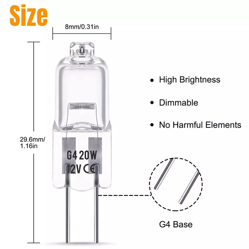 Product Feature 【Long Lasting Lifetime】 : G4 12v 20w light bulbs, made of high-quality tungsten filaments, enjoy 2,500 hours lifespan, this G4 bulb can switch on and off about 6000 times, saving you the cost of frequent bulb replacement. No lead or mercury, No UV or IR Radiation, Safe for you and your family. 【Excellent Performance】 : High output 300 lumen, 2800K bright warm white, CRI100. G4 bulb 12v 20w brings you warm lighting conditions like sunlight. The CRI up to 100 can restore the real color of the object, G4 light bulb makes the place where the light touches look more colorful. 【G4 Dimmable & Ins tant on】: T3 G4 bulb, seamless dimming capability (10% - 100%) suitable for any atmosphere or decoration. Instant on, this halogen G4 12v 20w can achieve maximum brightness in 0.5 seconds without preheating the bulb. 【360° All-around Lighting】: 360° all around lighting, no blind corner or shadow, the G4 light provides you with a wider and clearer lighting experience. Standard G4 base can be easily put in all standard G4 cans fixtures, ideal for chandelier, pendant, wall sconce, table lamp, hotel and other indoor applications. Product Specification Voltage 12V Wattage 20W Lumen 300lm CCT 2800K Warm White Shape T3 Tubular JC Lifetime 2500 hours Dimmable Yes Base G4 bi-pin with 4mm pin distance Package Included 20 x Light Bulbs