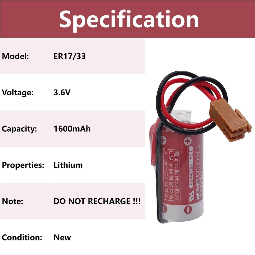 20x 3.6V 1600mAh ER17/33 2/3A Battery with 2-Pin Plug for PLC Industrial Battery Parameter: Battery Model: ER17/33 Battery Voltage: 3.6V Battery capacity: 1600MAH Battery Nature: non-rechargeable Disposable Lithium Battery Battery Size: 17mmx33mm Application: Real-time clock, PLC backup memory power, automotive electronics, various instruments, instruments, equipment, etc. Package included: 20 x Battery