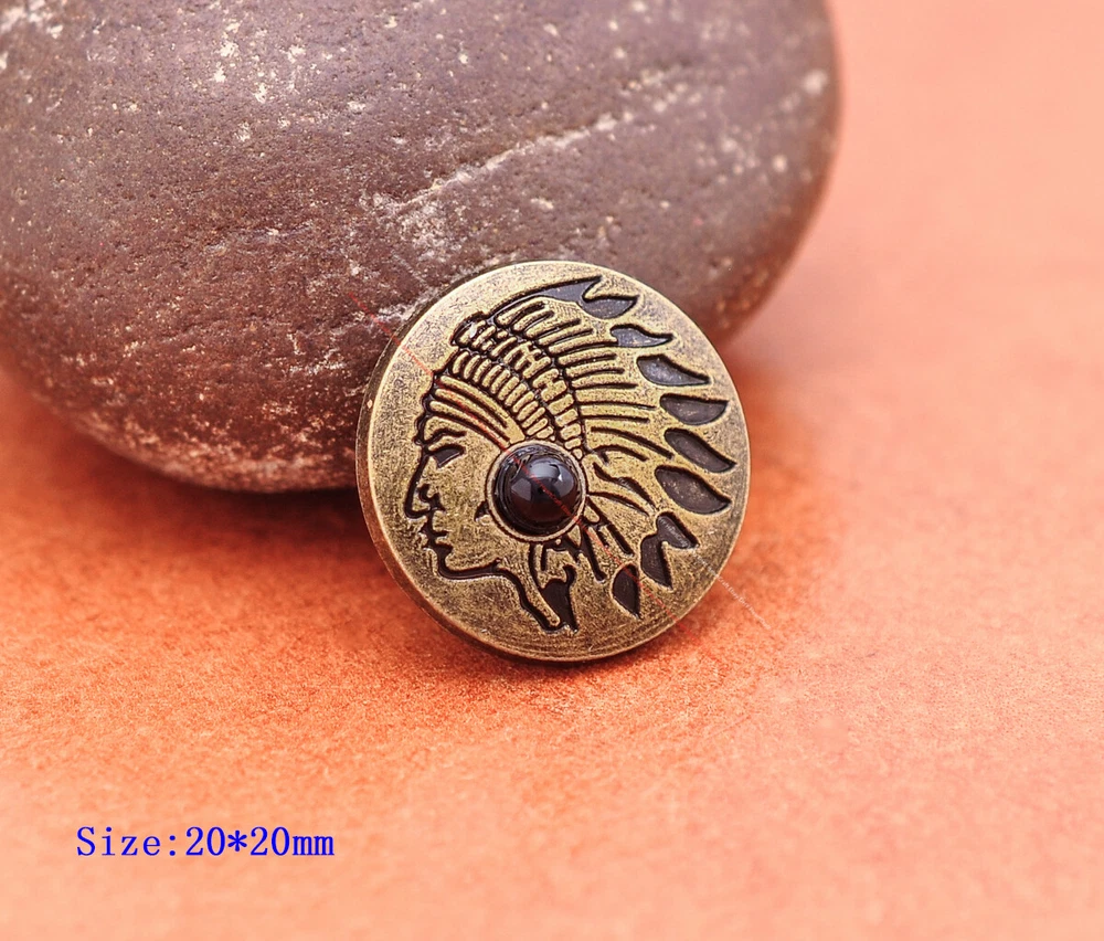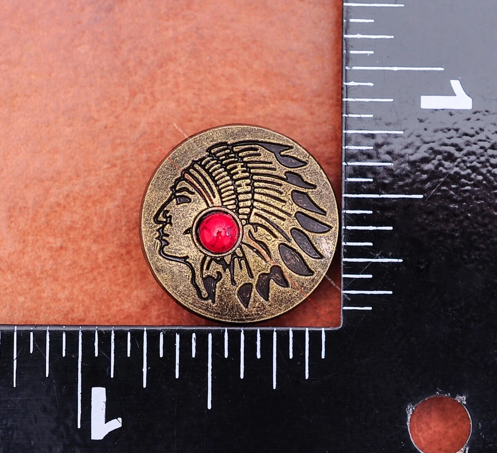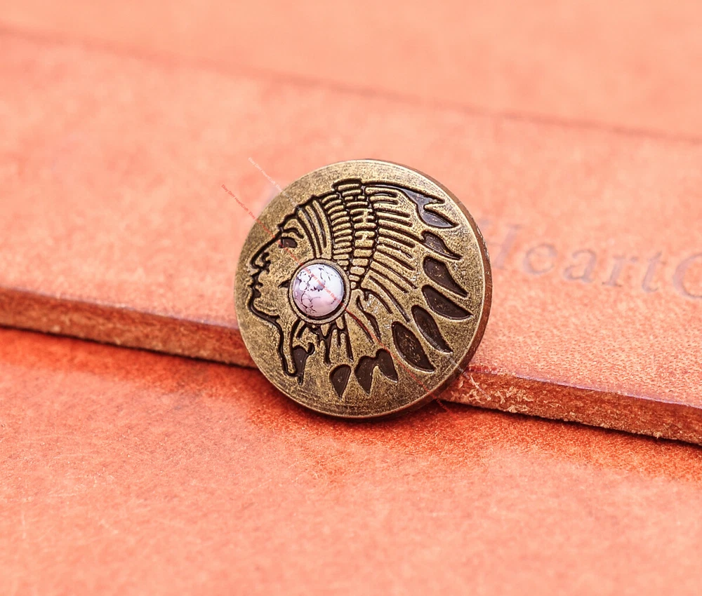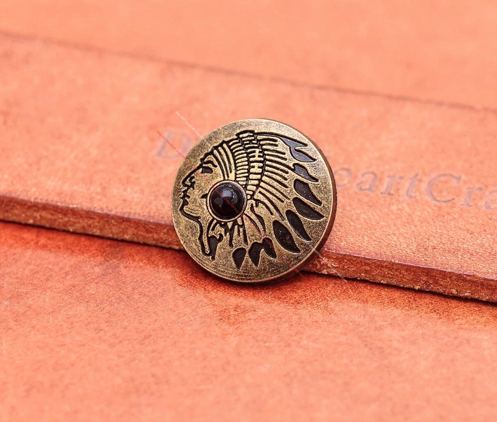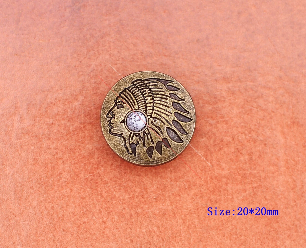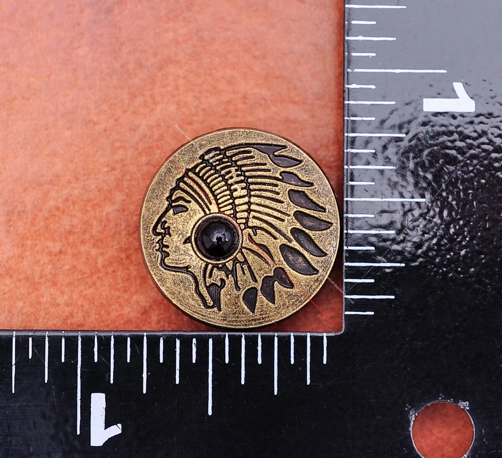 Color: Brass Shape: Indian Head Brand: Unbranded Theme: Cowboy & Western Style: Western UPC: Does not apply MPN: Does not apply Type: conchos Metal: Alloy Material: Alloy Custom Bundle: Yes Metal Purity: western cowboy Country/Region of Manufacture: China Size: 20*20 Bundle Listing: Yes gtin13: Does not apply Unit of Sale: 20pc/set Suitable For: Belts, Handbags, Hats, Jackets, Knife Shealths, Pouches, Saddles, Shoes, Blazers & Suits, Costumes, Crafts, Drapery