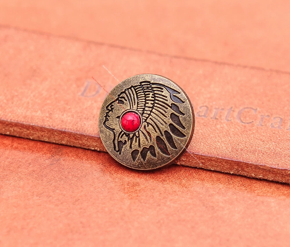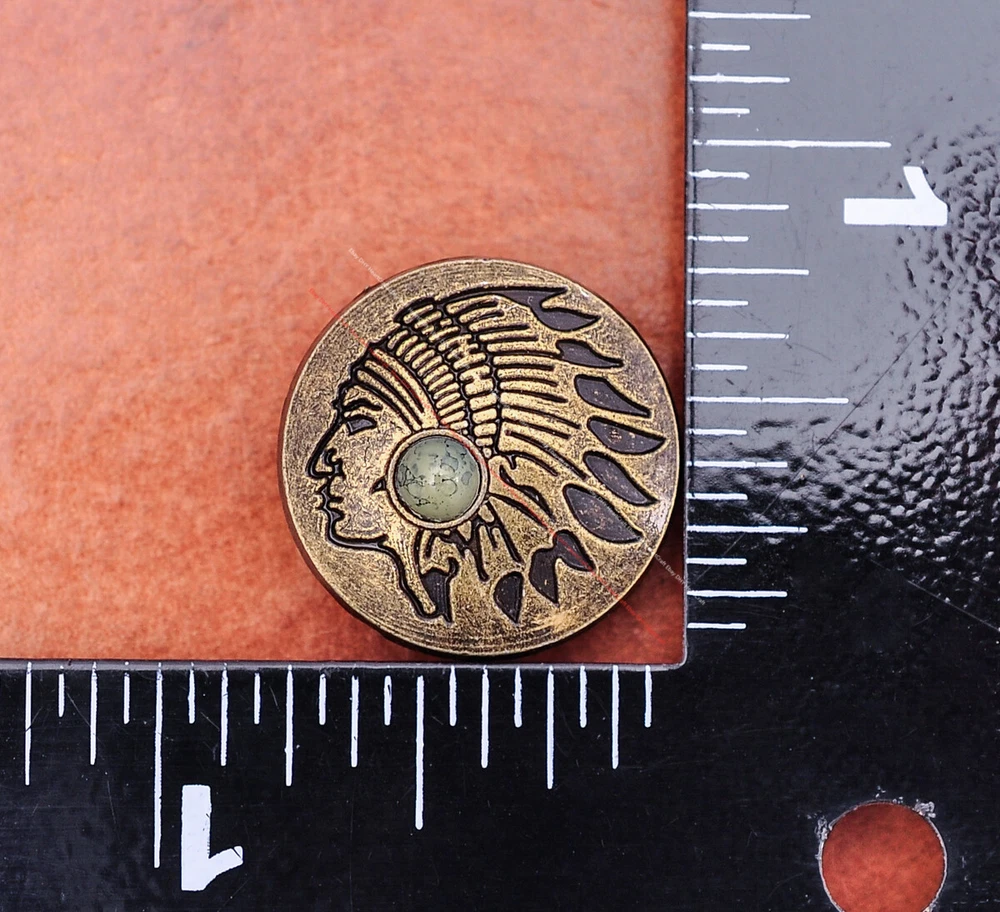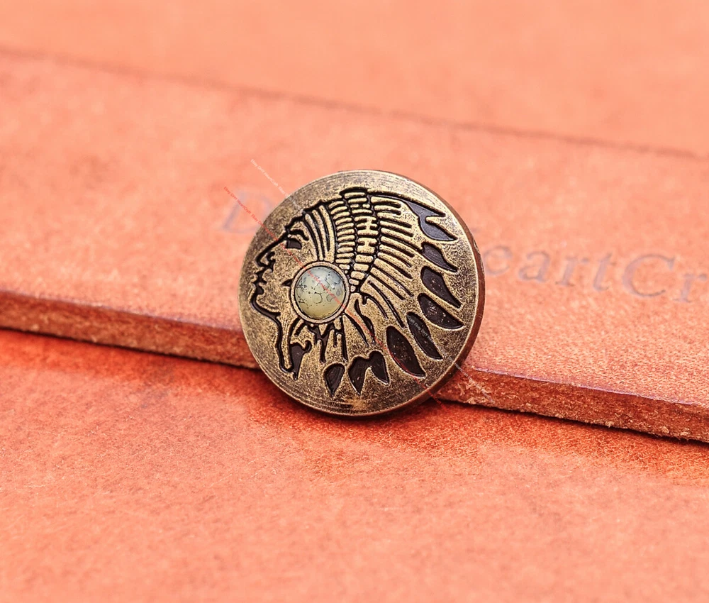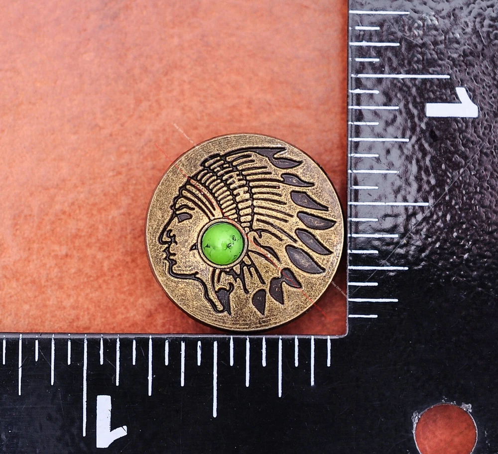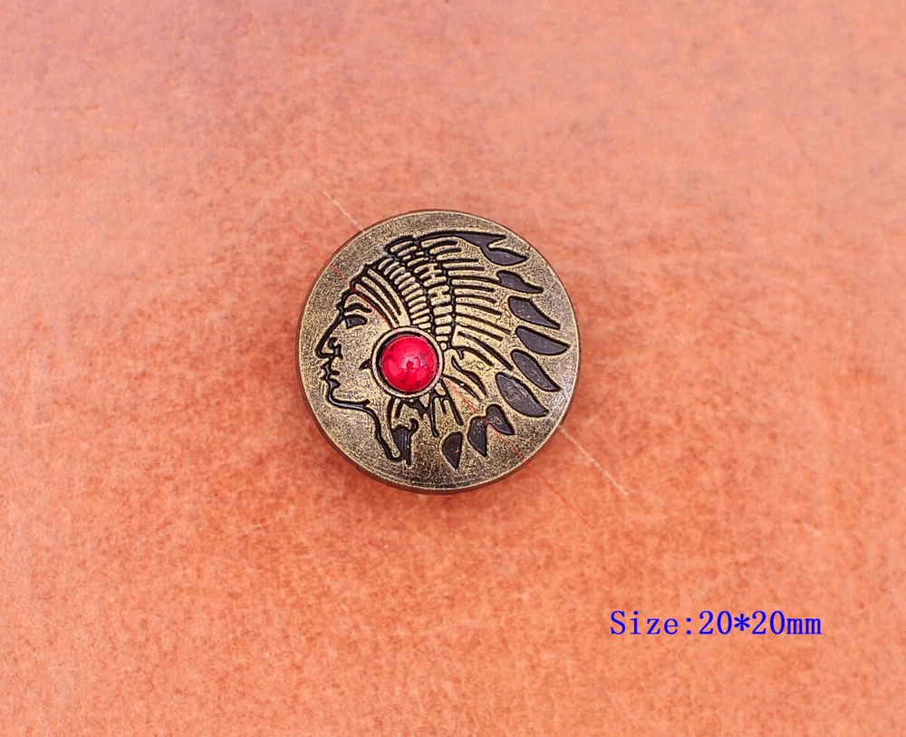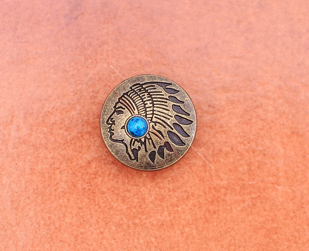 Color: Brass Shape: Indian Head Brand: Unbranded Theme: Cowboy & Western Style: Western UPC: Does not apply MPN: Does not apply Type: conchos Metal: Alloy Material: Alloy Custom Bundle: Yes Metal Purity: western cowboy Country/Region of Manufacture: China Size: 20*20 Bundle Listing: Yes gtin13: Does not apply Unit of Sale: 20pc/set Suitable For: Belts, Handbags, Hats, Jackets, Knife Shealths, Pouches, Saddles, Shoes, Blazers & Suits, Costumes, Crafts, Drapery