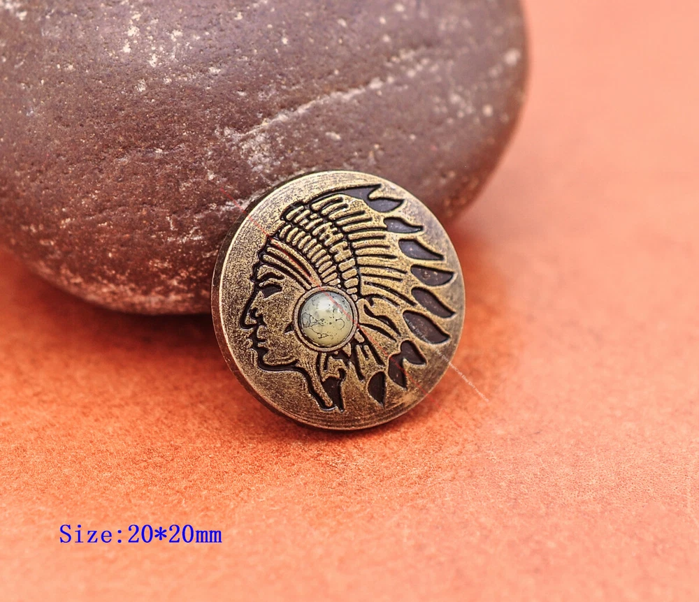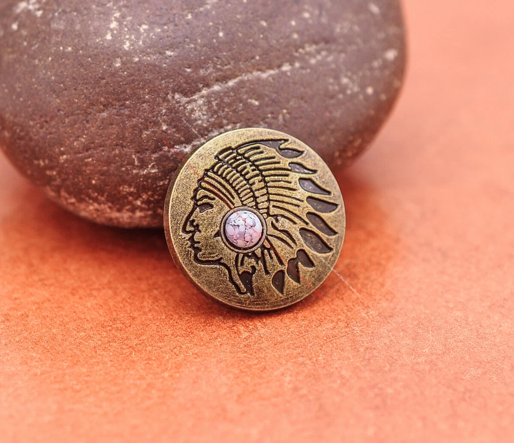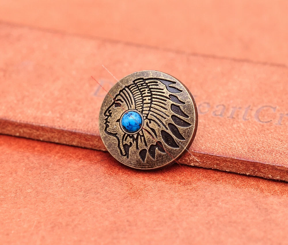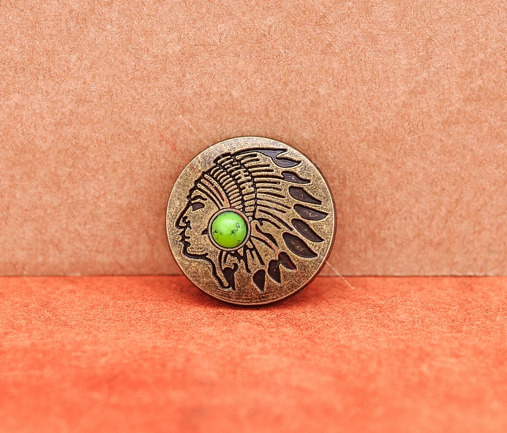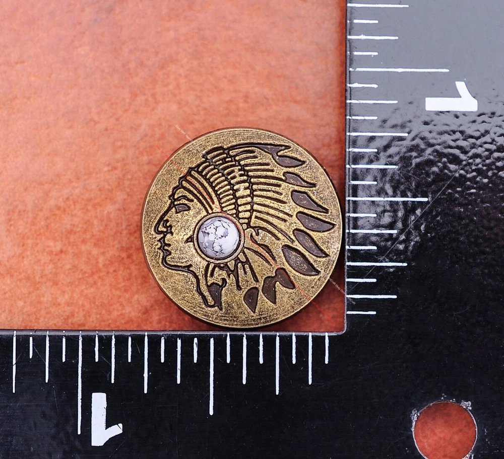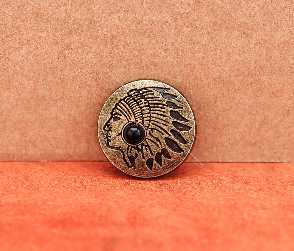 Color: Brass Shape: Indian Head Brand: Unbranded Theme: Cowboy & Western Style: Western UPC: Does not apply MPN: Does not apply Type: conchos Metal: Alloy Material: Alloy Custom Bundle: Yes Metal Purity: western cowboy Country/Region of Manufacture: China Size: 20*20 Bundle Listing: Yes gtin13: Does not apply Unit of Sale: 20pc/set Suitable For: Belts, Handbags, Hats, Jackets, Knife Shealths, Pouches, Saddles, Shoes, Blazers & Suits, Costumes, Crafts, Drapery