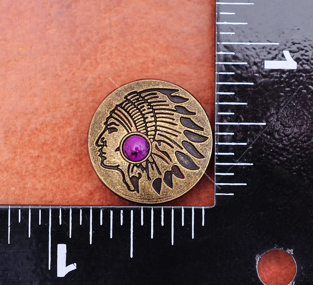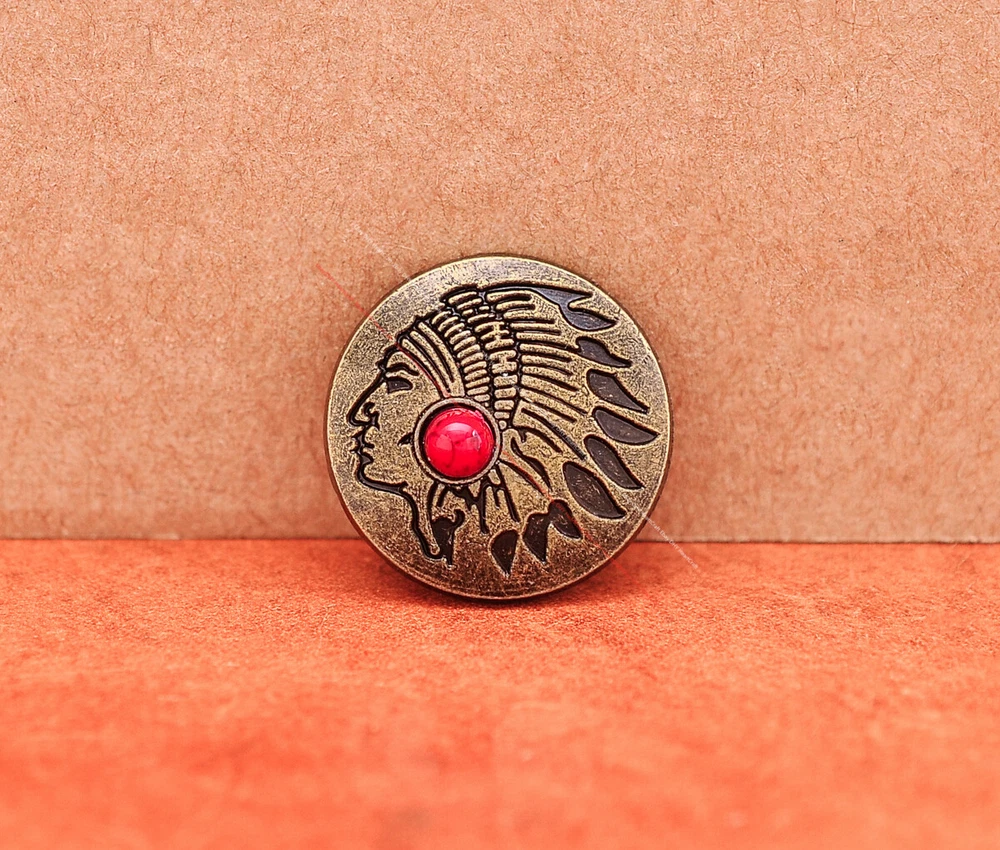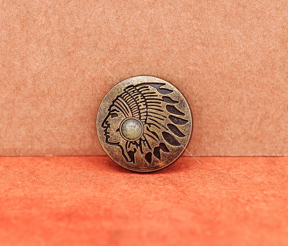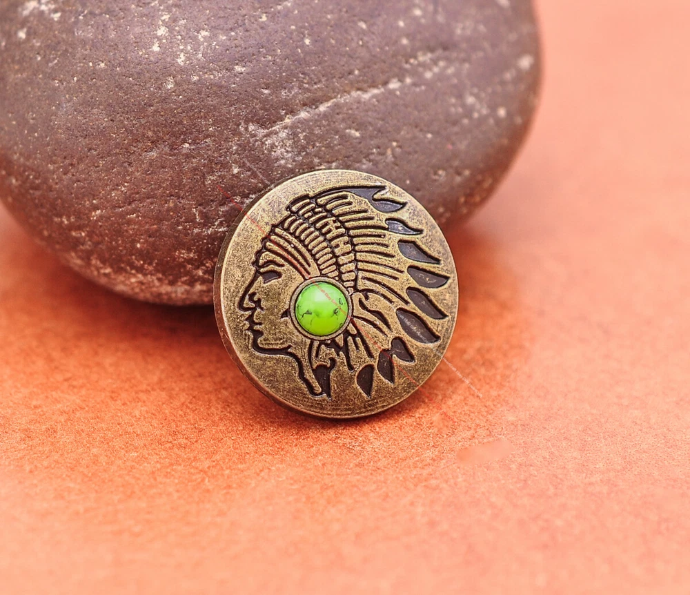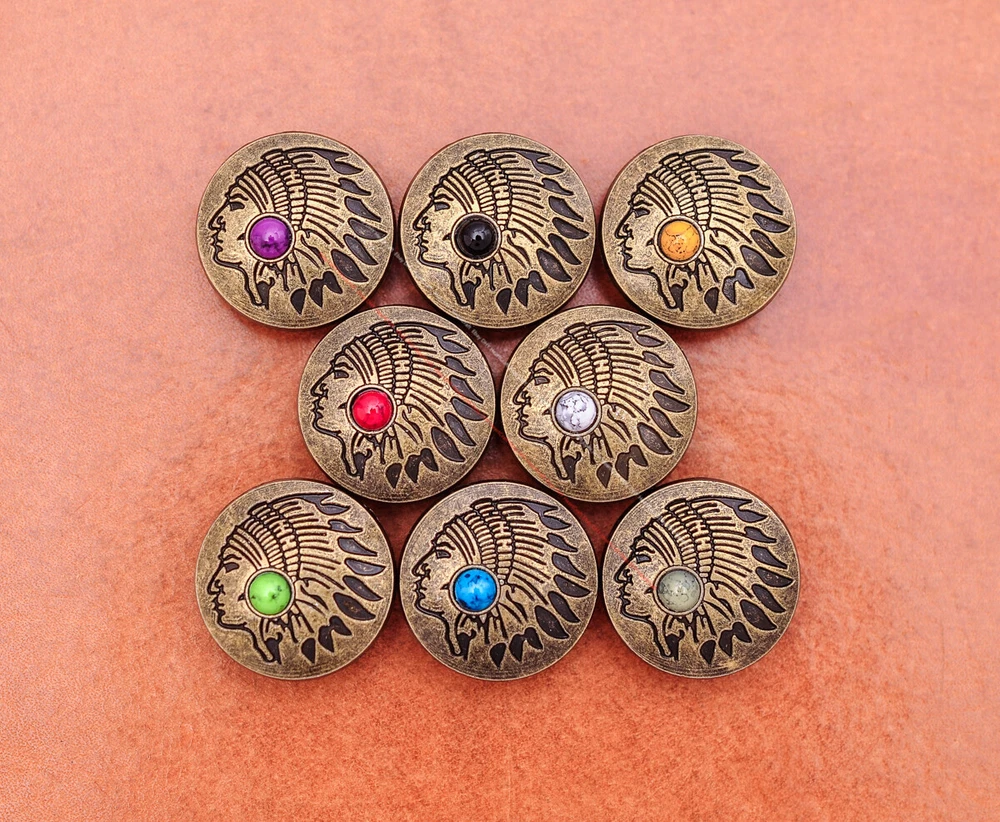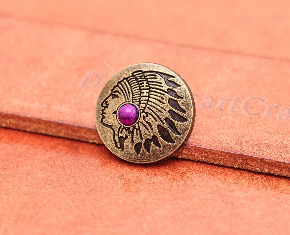 Color: Brass Shape: Indian Head Brand: Unbranded Theme: Cowboy & Western Style: Western UPC: Does not apply MPN: Does not apply Type: conchos Metal: Alloy Material: Alloy Custom Bundle: Yes Metal Purity: western cowboy Country/Region of Manufacture: China Size: 20*20 Bundle Listing: Yes gtin13: Does not apply Unit of Sale: 20pc/set Suitable For: Belts, Handbags, Hats, Jackets, Knife Shealths, Pouches, Saddles, Shoes, Blazers & Suits, Costumes, Crafts, Drapery