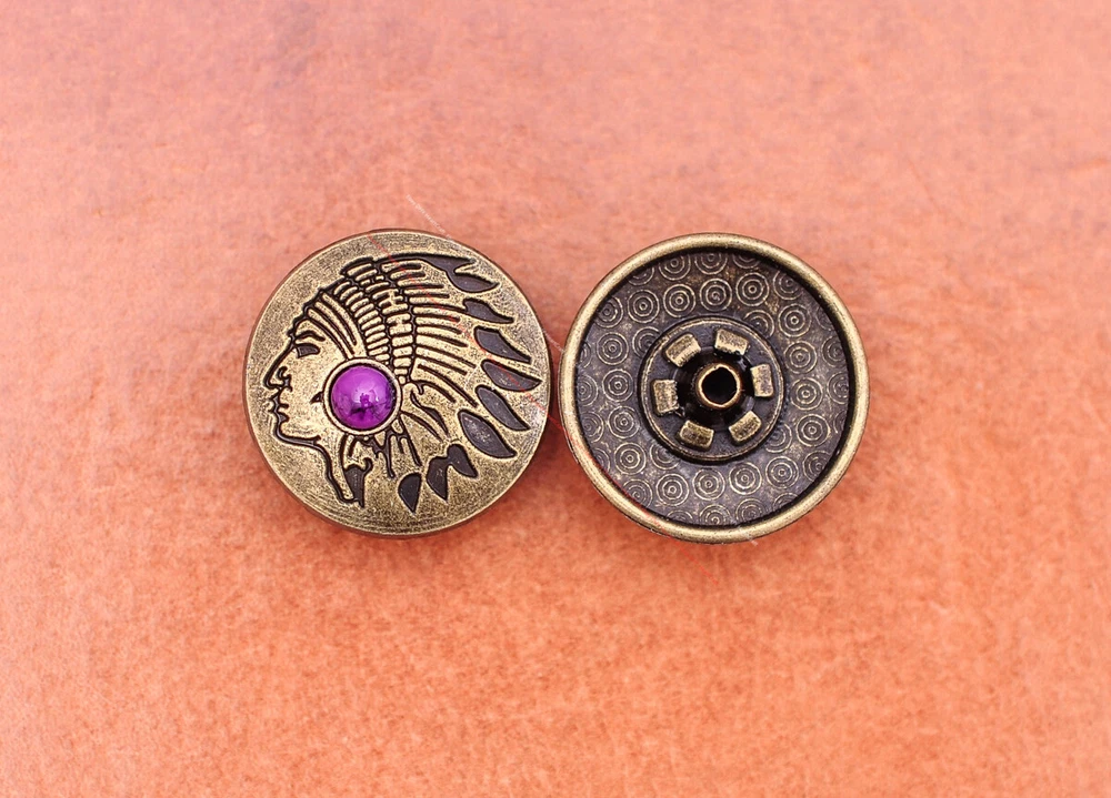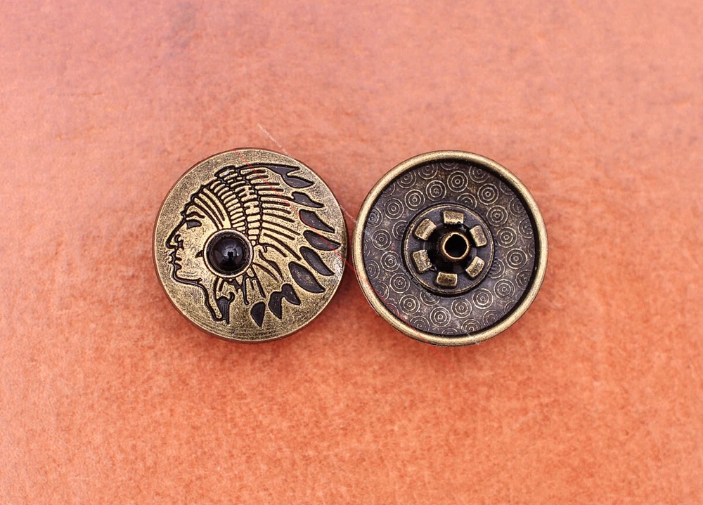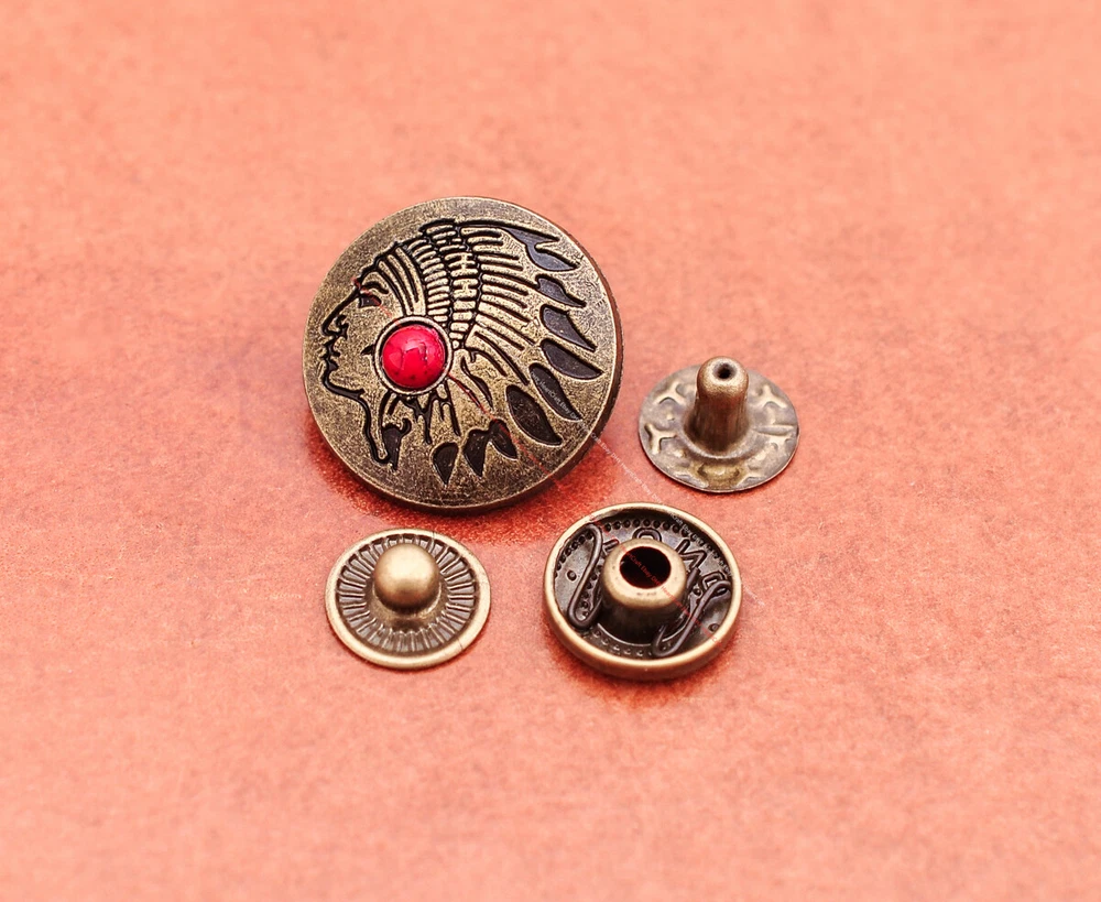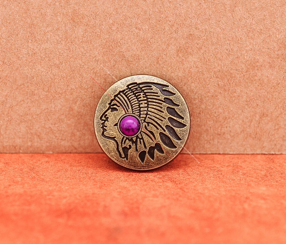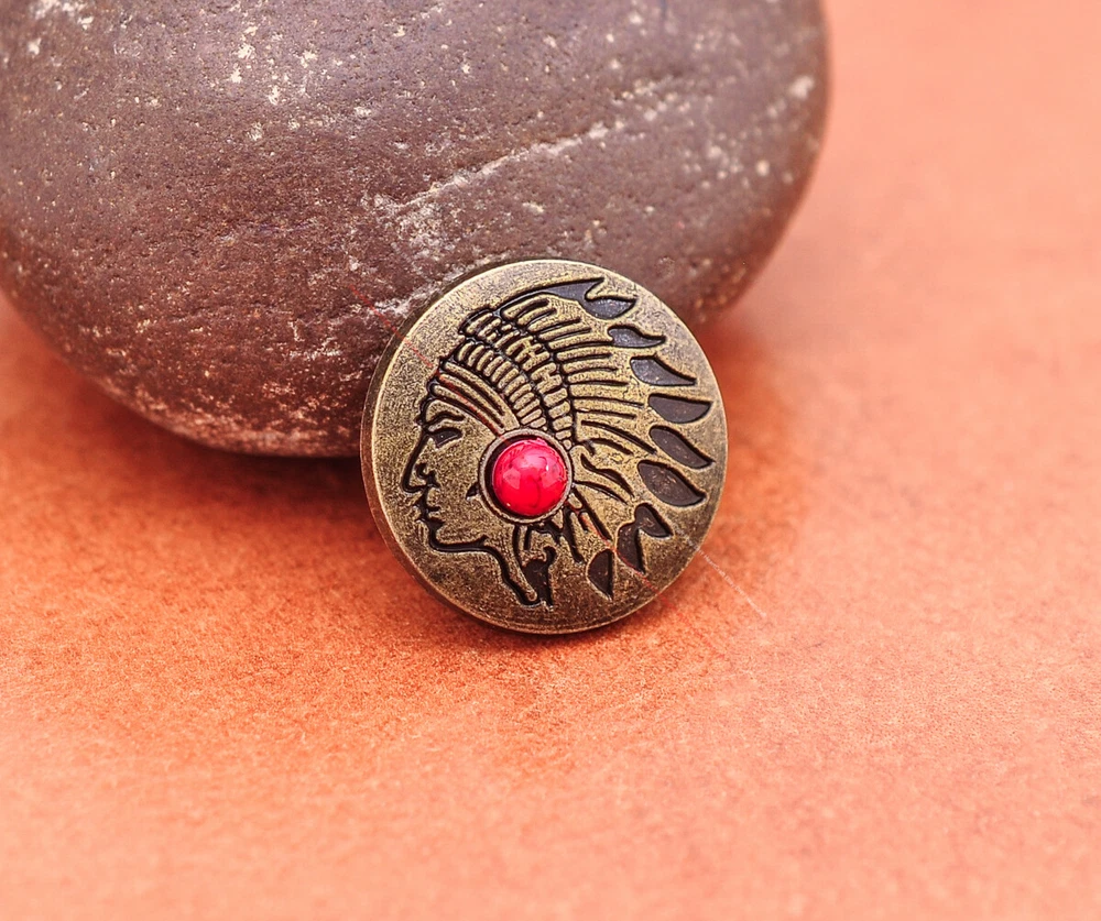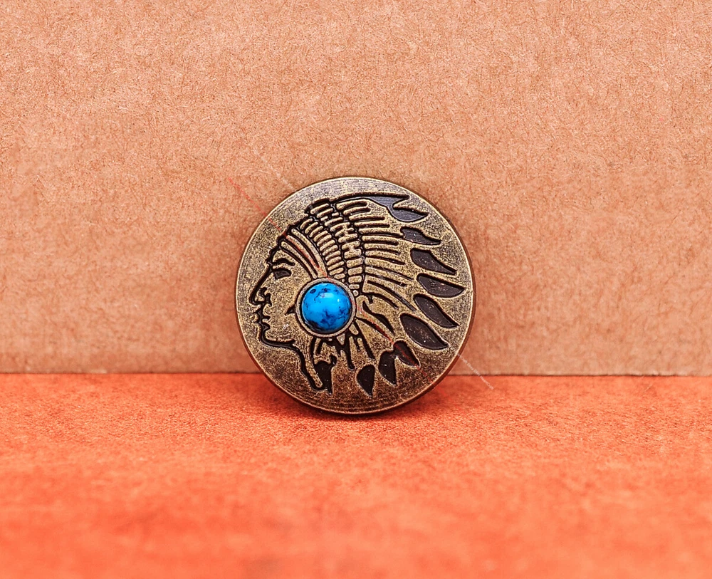 Color: Brass Shape: Indian Head Brand: Unbranded Theme: Cowboy & Western Style: Western UPC: Does not apply MPN: Does not apply Type: conchos Metal: Alloy Material: Alloy Custom Bundle: Yes Metal Purity: western cowboy Country/Region of Manufacture: China Size: 20*20 Bundle Listing: Yes gtin13: Does not apply Unit of Sale: 20pc/set Suitable For: Belts, Handbags, Hats, Jackets, Knife Shealths, Pouches, Saddles, Shoes, Blazers & Suits, Costumes, Crafts, Drapery
