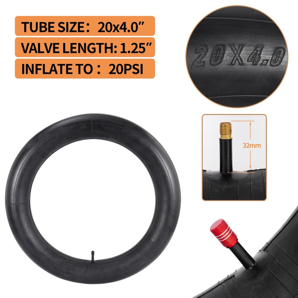 Heavy Duty 20x4 98-406 E-Bike Fat Tires, High-Performance Wear-Resistant 20X4.0 Fat Tire and Tube Sets for 20 Inch E-Bike Mountain Snow Bike Tire - 2Pack 20X4.0 (98-406) E-BIKE FAT TIRE - These 20X4 fat bike tires are not only suitable for e-bikes but also for mountain bikes, snowmobiles and other types of bikes. Note: Please check the details and size carefully before purchase HEAVY DUTY FOR ULTIMATE DURABILITY - Each heavy-duty 20 inch fat bike tire is made of high-quality rubber and puncture-resistant technology, with a thick tread depth of 4mm to help prevent road debris from puncturing the tire; the 20x4-inch all-terrain fat tire handles every ride with ease EASY TO HANDLE ALL KINDS OF RIDING SURFACES - The unique tread design of this 20X4 fat tire allows the rider to travel freely through forests, mountains, beaches, deserts, gravel and other rugged surfaces. Combines the high performance of off-road cornering and stability on dirt roads with the smoothness of street driving WIDE RANGE OF PRACTICAL ACCESSORIES - The 20x4 Rim Tape is used between rim and tube to perfectly protect the tube of the bike; These two tire levers have high toughness and sufficient elasticity enough to allow you to quickly maintain your tires; Beautiful aluminum alloy inflatable valve cover prevents dirt and dust from entering the tube AFTER-SALES SERVICE - If you have any questions about the quality of the product we provide you with 1 year service, in order to provide you with better service and satisfied with the product you can contact us in time; you need to provide relevant pictures and information so that we can quickly reply! AFTER-SALES SERVICE - If you have any questions about the quality of the product we provide you with 1 year service, in order to provide you with better service and satisfied with the product you can contact us in time; you need to provide relevant pictures and information so that we can quickly reply! Shipping We offer FREE shipping on all orders! We ship within Three business days of payment, usually sooner. We use a selection of shipping services such as UPS, FedEx, USPS etc. We only ship to the lower 48 states, no APO/FPO addresses or PO Boxes allowed. Local pickups and combined shipping options are not provided at this time. Return You can return a product for up to 30 days from the date you purchased it. Any product you return must be in the same condition you received it and in the original packaging. Please keep the receipt. Payment We accept payment by any of the following methods: PayPal Please pay as soon as possible after winning an auction, as that will allow us to post your item to you sooner! Feedback Customer satisfaction is very important to us. If you have any problem with your order, please contact us and we will do our best to make you satisfied. Contact Us If you have any queries, please contact us via ebay. We usually respond within 24 hours on weekdays. Please visit our eBay store to check out other items for sale! Thank you for shopping at our store.