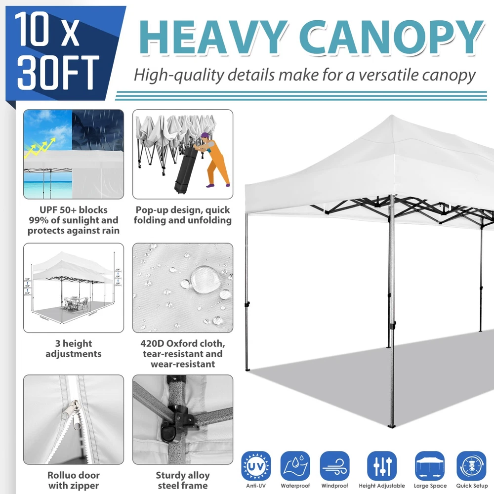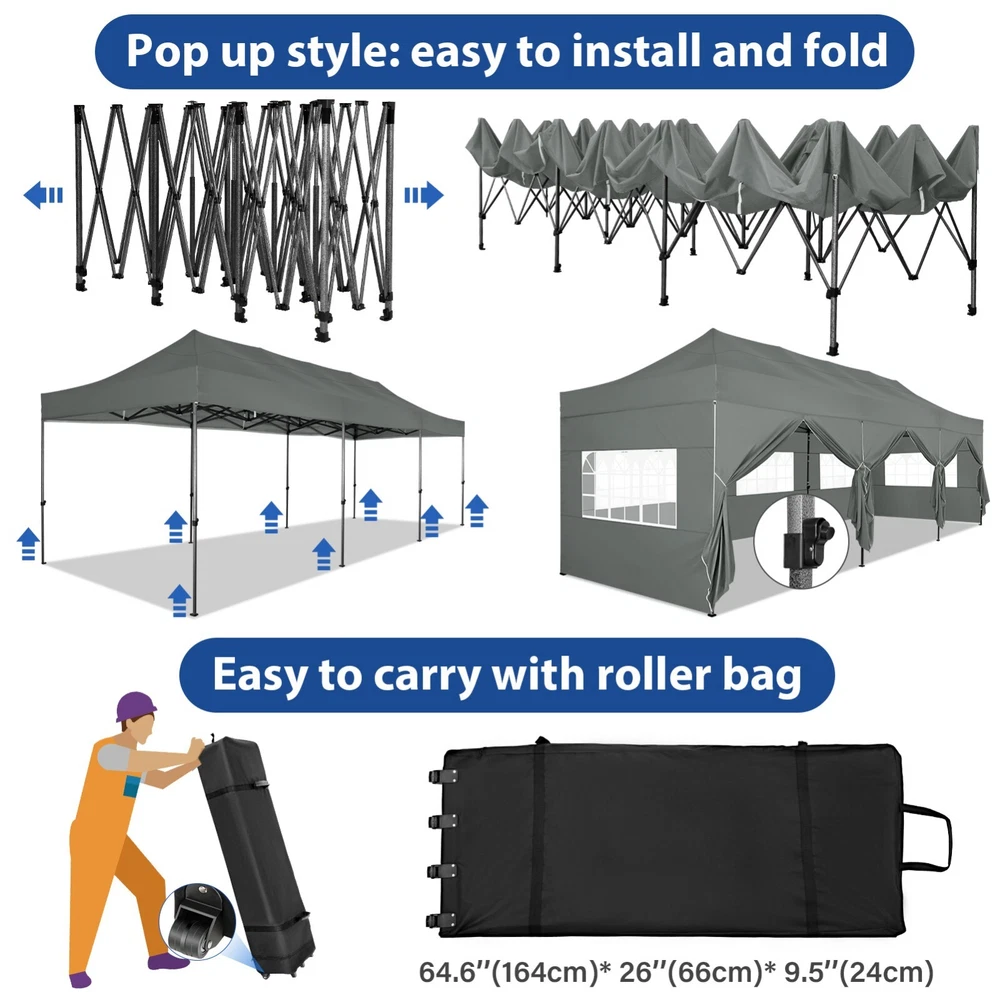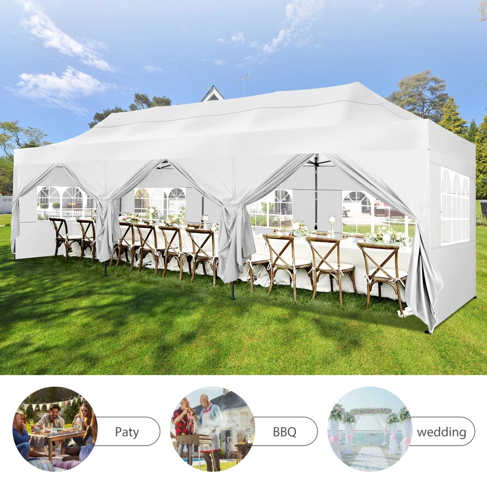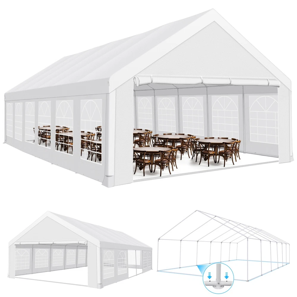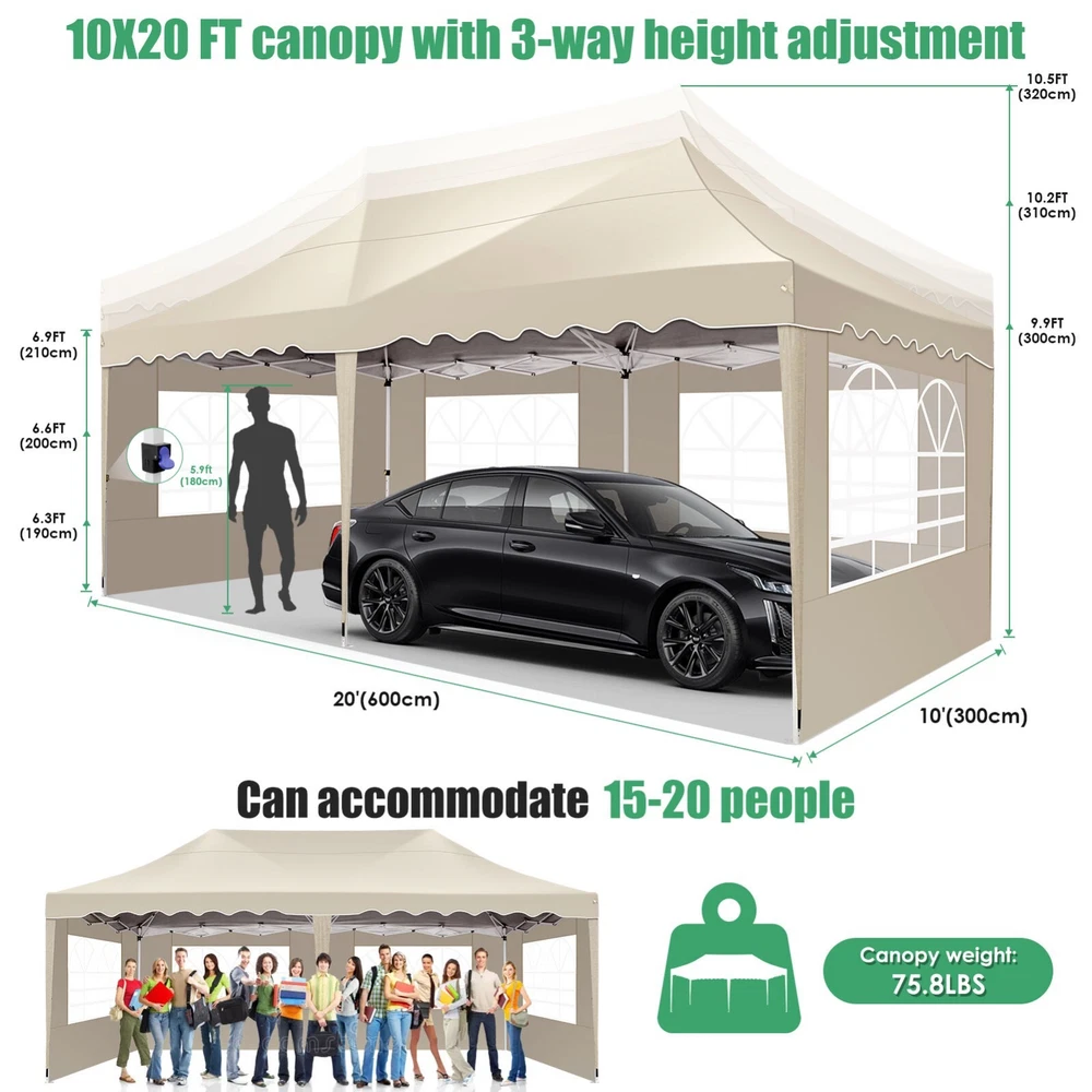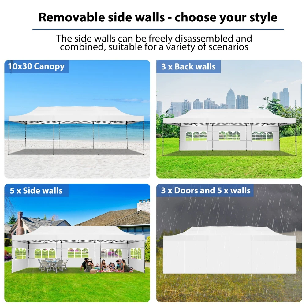 Description Heavy Duty 20x40 Event Tent Large Shelter with Removable Sidewalls, Carpas para Fiestas Commercial Outdoor Canopy Wedding Tent Carport, UV 50+, Waterproof About this item 💐 【 Heavy duty Structure & Closed Extra Ground Bars 】party tents 20x40 made from 1.5inch diameter all metal tube frame with elegant white paint coating, preventing chipping, peeling, rust, and corrosion. The stable triangular roof and closed ground link structure make the product more stable and less likely to shake than similar models on the market. Pegs and wind ropes, to make the event tents much safer and more stable. (Please do not use it when the wind is strong). 💐【 20x40 FT Extra Large Size & Versatile Usage 】20x40 tent can hold up to an estimated 50 people for for parties, or weddings, and can also be used as a carport or outdoor storage tent. Straight leg design and cathedral style roof offers an open-air feel for a variety of outdoor activities. Great for tent party, outdoor events, outdoor shelter. 💐【 All Season Tarp & Cathedral Windows 】 This heavy duty party tent top cover is made of heat-sealed, triple-layer 160g polyethylene fabric can Block 99% of Harmful UV Rays, which is waterproof and windproof, rainproof, dustproof and anti-snow, tear resistant etc. Waterproof PVC cathedral windows on the sides provide the tent with bright light and a good view. 💐【 Removable Sidewalls & Excellent Ventilation 】Our wedding tents Comes With 6 removable sidewalls with 12 PVC church windows and 2 zipper doors with windows. The number of the sidewall can be installed freely as needed. Roll-up zipper door and detachable sidewalls for even better ventilation, providing cross ventilation and venting on hot days. Also provides warmth on cold days. 💐【 Easy to Assemble & Warranty 】This waterproof outdoor wedding gazebo does not require additional installation tools. Connectiong with spring bottom simple and easy to use for quick installation. Any problem with any part, you can contact our customer service, we continue to provide you with after-sales service. Please note that this party tent is NOT FIREPROOF, so please keep it away from any fire source. Specifications: Color: White Size:20×40×10.5ft Product Weight: 300lb Weight Bearing: 2000lbs Waterproof: 100% Waterproof Sun Protection Index: UPF 50+ Cover Material: 160g PE Cloth Frame Material: Heavy Duty Metal Wide Usage: Perfect for Parties, Wedding, Camping, Storage, Shelter, marketing events, etc . Party Tent Size 20'X40' Roof style & Canopy material Peak Style Roof & Heat-sealed Triple-layer PE Tarp, Waterproof, UV protection and Tear resistant Pole material Elegant White Painted Steel Pipe, diameter 38mm, thickness 1.0mm, preventing chipping, peeling, rust, and corrosion. Sidewalls 6 Detachable Window Panels with 12 PVC Church Windows; and 2 Detachable Door Panels With Roll- up Zipper Door & 4 PVC Church Windows Party Tent Height 11.5FT to the top, 6.6FTto the edge; Window size: 4.3*4.7FT Note This party tent is NOT FIREPROOF, please stay away from the fire source. More Stability Art-welded Tube Connector; Elastic ball strap fasten the canopy to the frame; Pegs and wind ropes; Weight bags at the four corners of the canopy can add stability Variety Of Applications Perfect for Outdoor Patio Event Parties, Commercial Business Exhibition, Outdoor Wedding Parties, Storage tent, Carport, and so on. For Carport For Commercial Exhibition For Storage Tent For Wedding Tent 10'x30' / 8 Sidewalls 3 x 9m Pop Up Canopy Commercial Tent Eight Sides Three Doors Waterproof Tent Sun Shelter ✨About this item 🌟【Heavy Duty Upgraded Frame】The frame of 10x30 Pop Up Canopy Tent is commercial grade full truss construction made of durable powder coated stainless steel. 32mm/1.26 inch widened pipe diameter, 0.7mm/0.03 inch thickened wall thickness, Stronger and more stable than other normal gazebos on the market. The middle support pole structure can hold up to 220 lbs on a single pole and can withstand up to level 4 wind (18mph), using the included sandbags, ropes and nails for increased carport stability. 🌟【Best Quality Fabric and Sidewalls】10x30 Heavy duty canopy tent is made of 420D Oxford cloth with two layers of PU coating, UPF 50+, blocks 99% of UV rays. Heat-sealed seam technology is used, 100% waterproof, 1500mm waterproof pressure, waterproof effect is better than other general tents. 8 PU coated sidewalls connected by a whole strip of velcro and zipper to attach to the frame top and legs for securing, removable, you can install as many sidewalls as you want, convenient and practical. 🌟【Easy Set up, 3 Adjustable Heights】2-4 people can easily set up and take down 10x20 outdoor party tent canopy in minutes without tools, it can easily accommodate 20-25 people. Just remove the fully assembled frame and top from bag, place fabric over frame, stretch legs, and you're done. Wedding tent gazebo is available in 3 different heights (86.6'', 90.5'', 94.5'') for your choice to ensure adequate headspace. Best thumb latch system is easy to lock and release without pinching your fingers. 🌟【Portable 4 Wheels Roller Bag】Since 10x30 heavy duty pop up canopy tent with sidewalls has a weight of 136 lbs, we offer you a solid and durable 600D Oxford cloth PVC coated roller bag. It has 4 large wheels for standing feet and reinforced handle for easy movement and transportation. Tents for parties, weddings, BBQ, trade shows, sporting events, disaster relief or any outdoor event. Waterproof canopy gazebo are commonly used in commercial areas, playgrounds, patios, beaches, farms, gyms, etc. 🌟【WHAT'S INCLUDED】1x Commercial grade 10x30 Pop up Tent Frame, 1x 10'x30' Canopy Top Cover, 8x PU Coated Panels (5x Sidewalls with Window and 3x Sidewalls with Zipper), 4x 420D Oxford cloth PVC coated Sandbags, 4x Ground Pegs, 6x Wind Ropes, 1x Roller bag, 1x Manual. If you have any questions and doubts, please feel free to contact us, we will 
