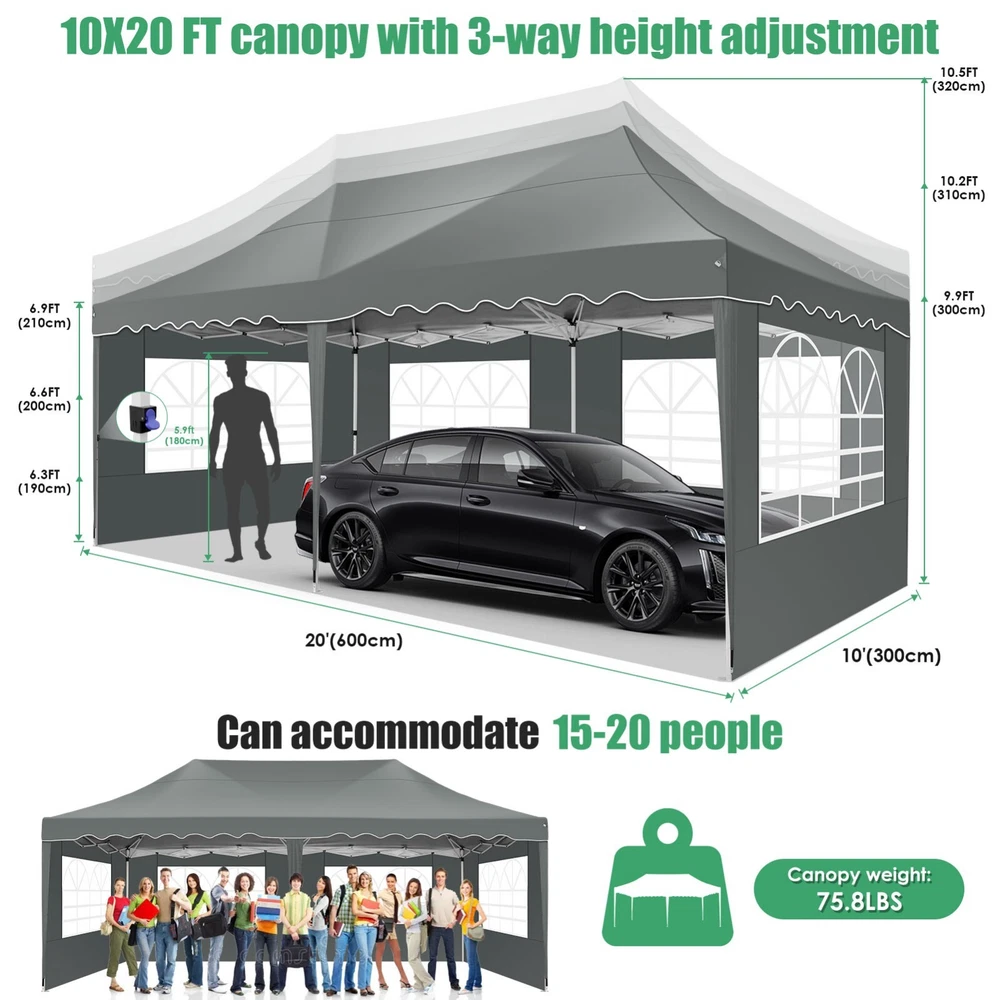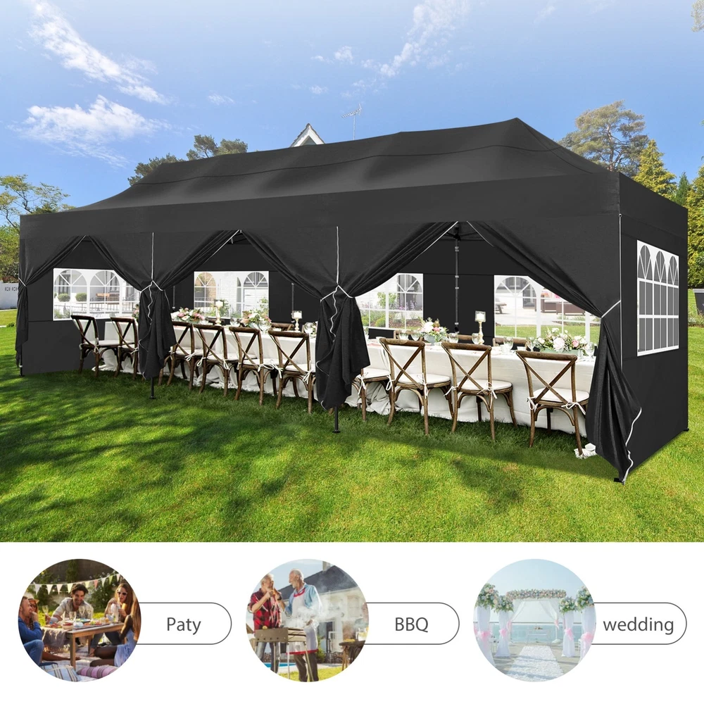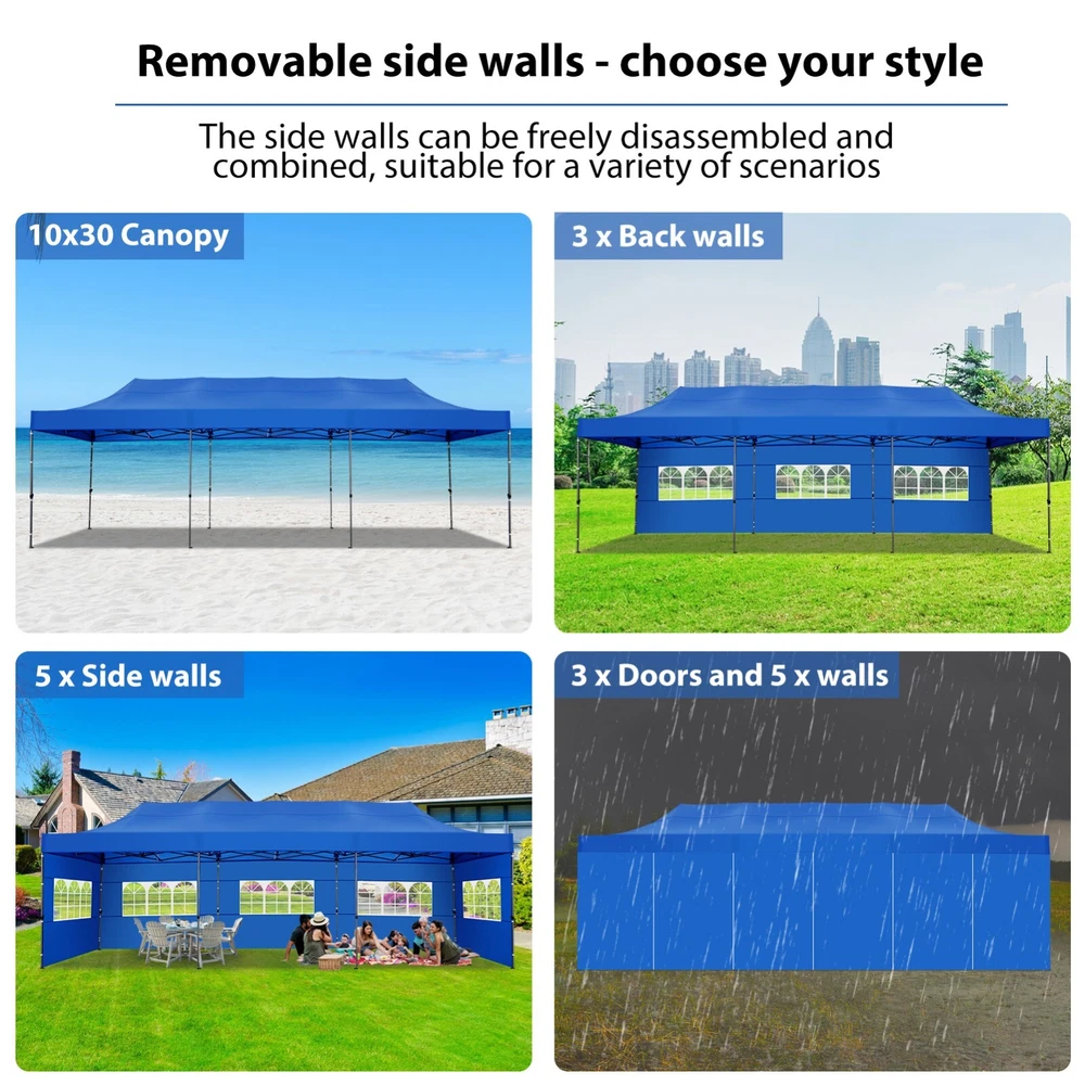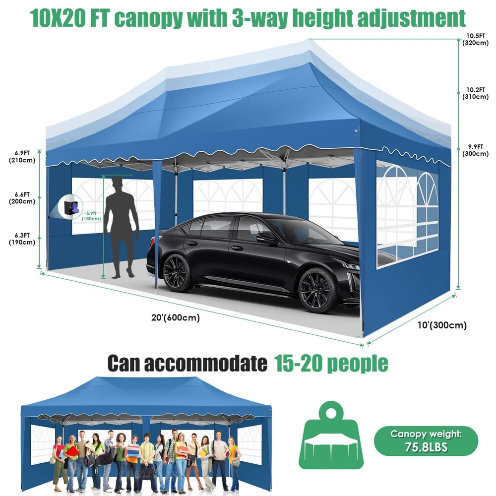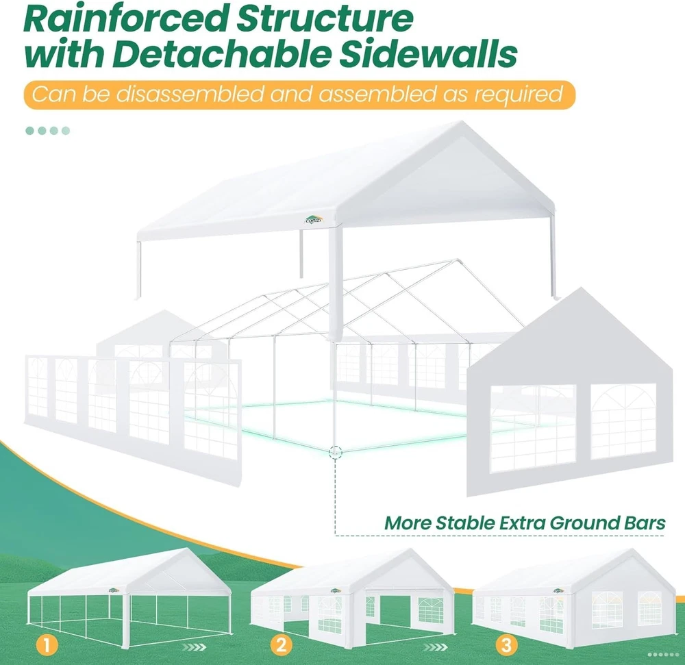 Description Heavy Duty 20x40 Event Tent Large Shelter with Removable Sidewalls, Carpas para Fiestas Commercial Outdoor Canopy Wedding Tent Carport, UV 50+, Waterproof About this item 💐 【 Heavy duty Structure & Closed Extra Ground Bars 】party tents 20x40 made from 1.5inch diameter all metal tube frame with elegant white paint coating, preventing chipping, peeling, rust, and corrosion. The stable triangular roof and closed ground link structure make the product more stable and less likely to shake than similar models on the market. Pegs and wind ropes, to make the event tents much safer and more stable. (Please do not use it when the wind is strong). 💐【 20x40 FT Extra Large Size & Versatile Usage 】20x40 tent can hold up to an estimated 50 people for for parties, or weddings, and can also be used as a carport or outdoor storage tent. Straight leg design and cathedral style roof offers an open-air feel for a variety of outdoor activities. Great for tent party, outdoor events, outdoor shelter. 💐【 All Season Tarp & Cathedral Windows 】 This heavy duty party tent top cover is made of heat-sealed, triple-layer 160g polyethylene fabric can Block 99% of Harmful UV Rays, which is waterproof and windproof, rainproof, dustproof and anti-snow, tear resistant etc. Waterproof PVC cathedral windows on the sides provide the tent with bright light and a good view. 💐【 Removable Sidewalls & Excellent Ventilation 】Our wedding tents Comes With 6 removable sidewalls with 12 PVC church windows and 2 zipper doors with windows. The number of the sidewall can be installed freely as needed. Roll-up zipper door and detachable sidewalls for even better ventilation, providing cross ventilation and venting on hot days. Also provides warmth on cold days. 💐【 Easy to Assemble & Warranty 】This waterproof outdoor wedding gazebo does not require additional installation tools. Connectiong with spring bottom simple and easy to use for quick installation. Any problem with any part, you can contact our customer service, we continue to provide you with after-sales service. Please note that this party tent is NOT FIREPROOF, so please keep it away from any fire source. Specifications: Color: White Size:20×40×10.5ft Product Weight: 300lb Weight Bearing: 2000lbs Waterproof: 100% Waterproof Sun Protection Index: UPF 50+ Cover Material: 160g PE Cloth Frame Material: Heavy Duty Metal Wide Usage: Perfect for Parties, Wedding, Camping, Storage, Shelter, marketing events, etc . Party Tent Size 20'X40' Roof style & Canopy material Peak Style Roof & Heat-sealed Triple-layer PE Tarp, Waterproof, UV protection and Tear resistant Pole material Elegant White Painted Steel Pipe, diameter 38mm, thickness 1.0mm, preventing chipping, peeling, rust, and corrosion. Sidewalls 6 Detachable Window Panels with 12 PVC Church Windows; and 2 Detachable Door Panels With Roll- up Zipper Door & 4 PVC Church Windows Party Tent Height 11.5FT to the top, 6.6FTto the edge; Window size: 4.3*4.7FT Note This party tent is NOT FIREPROOF, please stay away from the fire source. More Stability Art-welded Tube Connector; Elastic ball strap fasten the canopy to the frame; Pegs and wind ropes; Weight bags at the four corners of the canopy can add stability Variety Of Applications Perfect for Outdoor Patio Event Parties, Commercial Business Exhibition, Outdoor Wedding Parties, Storage tent, Carport, and so on. For Carport For Commercial Exhibition For Storage Tent For Wedding Tent 10'x30' / 8 Sidewalls 3 x 9m Pop Up Canopy Commercial Tent Eight Sides Three Doors Waterproof Tent Sun Shelter ✨About this item 🌟【Heavy Duty Upgraded Frame】The frame of 10x30 Pop Up Canopy Tent is commercial grade full truss construction made of durable powder coated stainless steel. 32mm/1.26 inch widened pipe diameter, 0.7mm/0.03 inch thickened wall thickness, Stronger and more stable than other normal gazebos on the market. The middle support pole structure can hold up to 220 lbs on a single pole and can withstand up to level 4 wind (18mph), using the included sandbags, ropes and nails for increased carport stability. 🌟【Best Quality Fabric and Sidewalls】10x30 Heavy duty canopy tent is made of 420D Oxford cloth with two layers of PU coating, UPF 50+, blocks 99% of UV rays. Heat-sealed seam technology is used, 100% waterproof, 1500mm waterproof pressure, waterproof effect is better than other general tents. 8 PU coated sidewalls connected by a whole strip of velcro and zipper to attach to the frame top and legs for securing, removable, you can install as many sidewalls as you want, convenient and practical. 🌟【Easy Set up, 3 Adjustable Heights】2-4 people can easily set up and take down 10x20 outdoor party tent canopy in minutes without tools, it can easily accommodate 20-25 people. Just remove the fully assembled frame and top from bag, place fabric over frame, stretch legs, and you're done. Wedding tent gazebo is available in 3 different heights (86.6'', 90.5'', 94.5'') for your choice to ensure adequate headspace. Best thumb latch system is easy to lock and release without pinching your fingers. 🌟【Portable 4 Wheels Roller Bag】Since 10x30 heavy duty pop up canopy tent with sidewalls has a weight of 136 lbs, we offer you a solid and durable 600D Oxford cloth PVC coated roller bag. It has 4 large wheels for standing feet and reinforced handle for easy movement and transportation. Tents for parties, weddings, BBQ, trade shows, sporting events, disaster relief or any outdoor event. Waterproof canopy gazebo are commonly used in commercial areas, playgrounds, patios, beaches, farms, gyms, etc. 🌟【WHAT'S INCLUDED】1x Commercial grade 10x30 Pop up Tent Frame, 1x 10'x30' Canopy Top Cover, 8x PU Coated Panels (5x Sidewalls with Window and 3x Sidewalls with Zipper), 4x 420D Oxford cloth PVC coated Sandbags, 4x Ground Pegs, 6x Wind Ropes, 1x Roller bag, 1x Manual. If you have any questions and doubts, please feel free to contact us, we will 