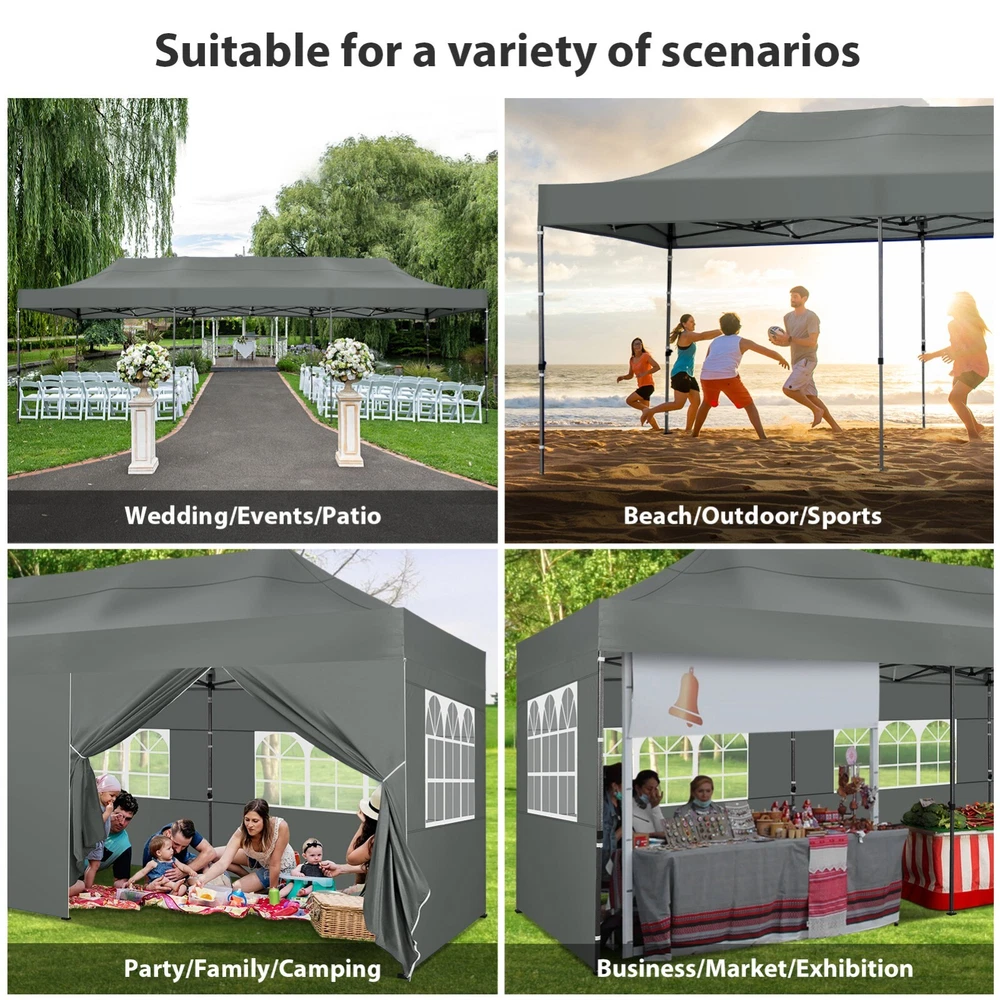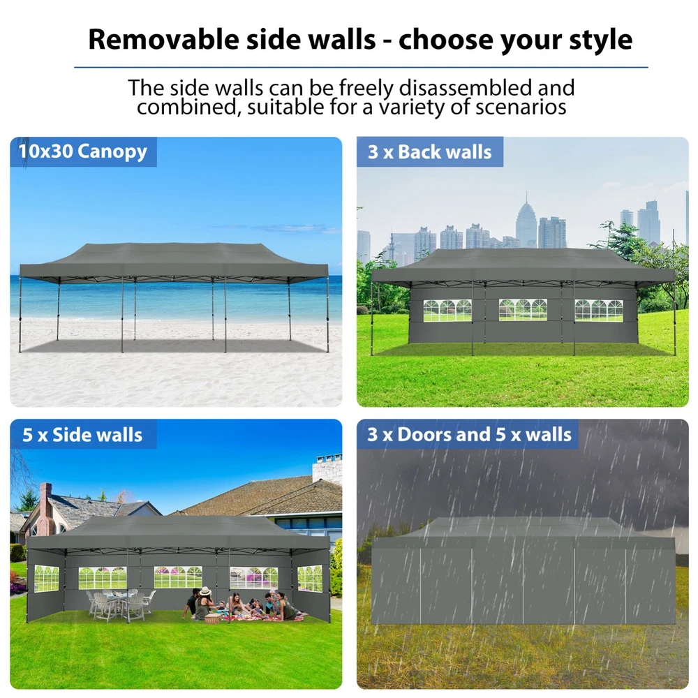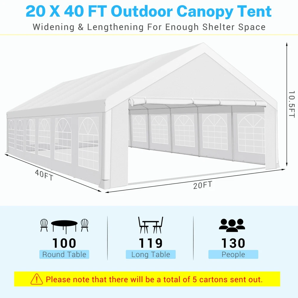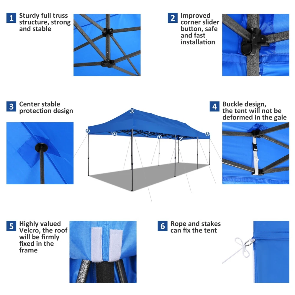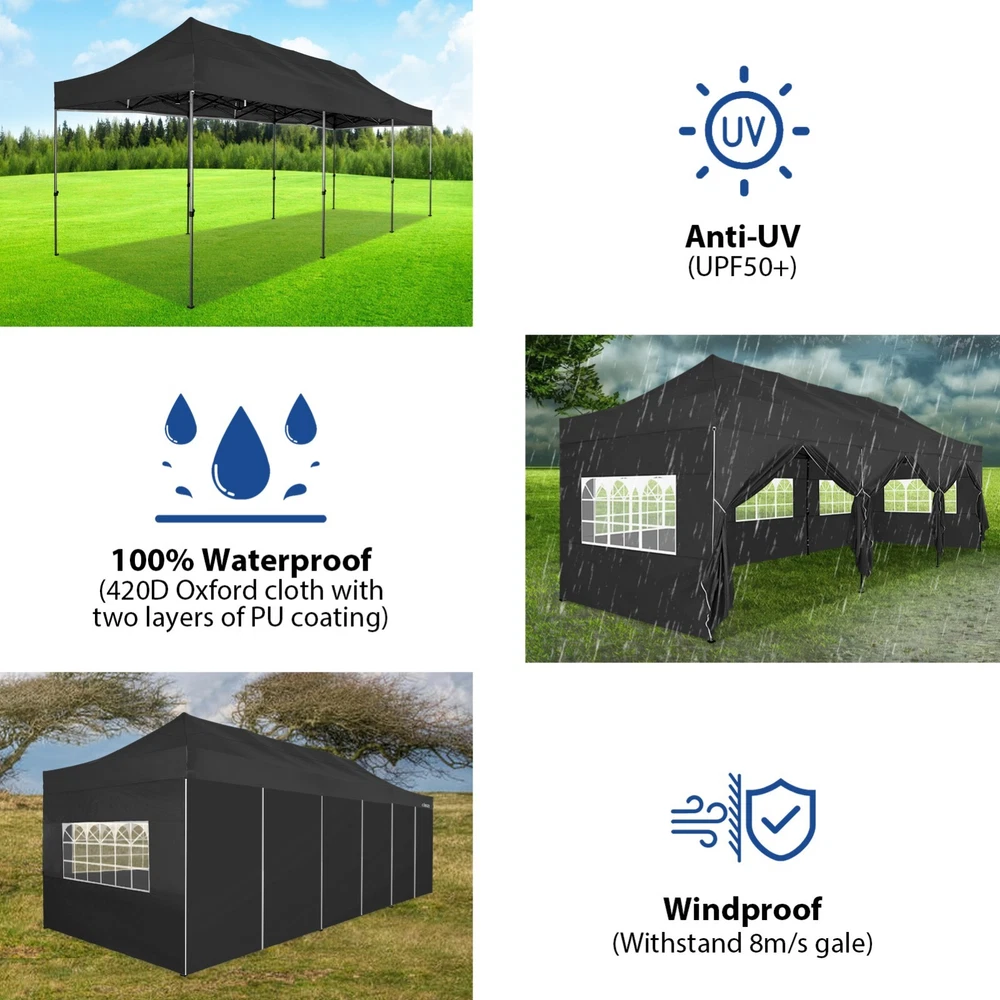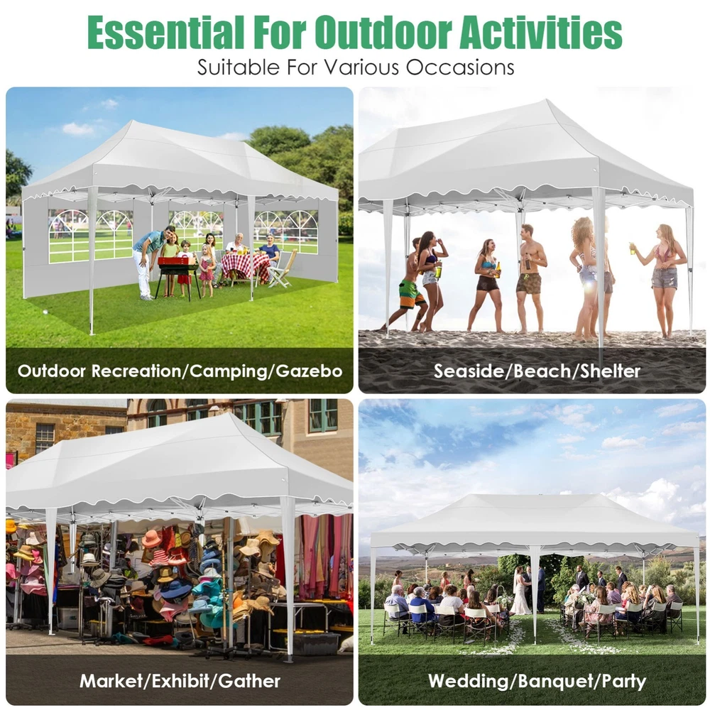 Description Heavy Duty 20x40 Event Tent Large Shelter with Removable Sidewalls, Carpas para Fiestas Commercial Outdoor Canopy Wedding Tent Carport, UV 50+, Waterproof About this item 💐 【 Heavy duty Structure & Closed Extra Ground Bars 】party tents 20x40 made from 1.5inch diameter all metal tube frame with elegant white paint coating, preventing chipping, peeling, rust, and corrosion. The stable triangular roof and closed ground link structure make the product more stable and less likely to shake than similar models on the market. Pegs and wind ropes, to make the event tents much safer and more stable. (Please do not use it when the wind is strong). 💐【 20x40 FT Extra Large Size & Versatile Usage 】20x40 tent can hold up to an estimated 50 people for for parties, or weddings, and can also be used as a carport or outdoor storage tent. Straight leg design and cathedral style roof offers an open-air feel for a variety of outdoor activities. Great for tent party, outdoor events, outdoor shelter. 💐【 All Season Tarp & Cathedral Windows 】 This heavy duty party tent top cover is made of heat-sealed, triple-layer 160g polyethylene fabric can Block 99% of Harmful UV Rays, which is waterproof and windproof, rainproof, dustproof and anti-snow, tear resistant etc. Waterproof PVC cathedral windows on the sides provide the tent with bright light and a good view. 💐【 Removable Sidewalls & Excellent Ventilation 】Our wedding tents Comes With 6 removable sidewalls with 12 PVC church windows and 2 zipper doors with windows. The number of the sidewall can be installed freely as needed. Roll-up zipper door and detachable sidewalls for even better ventilation, providing cross ventilation and venting on hot days. Also provides warmth on cold days. 💐【 Easy to Assemble & Warranty 】This waterproof outdoor wedding gazebo does not require additional installation tools. Connectiong with spring bottom simple and easy to use for quick installation. Any problem with any part, you can contact our customer service, we continue to provide you with after-sales service. Please note that this party tent is NOT FIREPROOF, so please keep it away from any fire source. Specifications: Color: White Size:20×40×10.5ft Product Weight: 300lb Weight Bearing: 2000lbs Waterproof: 100% Waterproof Sun Protection Index: UPF 50+ Cover Material: 160g PE Cloth Frame Material: Heavy Duty Metal Wide Usage: Perfect for Parties, Wedding, Camping, Storage, Shelter, marketing events, etc . Party Tent Size 20'X40' Roof style & Canopy material Peak Style Roof & Heat-sealed Triple-layer PE Tarp, Waterproof, UV protection and Tear resistant Pole material Elegant White Painted Steel Pipe, diameter 38mm, thickness 1.0mm, preventing chipping, peeling, rust, and corrosion. Sidewalls 6 Detachable Window Panels with 12 PVC Church Windows; and 2 Detachable Door Panels With Roll- up Zipper Door & 4 PVC Church Windows Party Tent Height 11.5FT to the top, 6.6FTto the edge; Window size: 4.3*4.7FT Note This party tent is NOT FIREPROOF, please stay away from the fire source. More Stability Art-welded Tube Connector; Elastic ball strap fasten the canopy to the frame; Pegs and wind ropes; Weight bags at the four corners of the canopy can add stability Variety Of Applications Perfect for Outdoor Patio Event Parties, Commercial Business Exhibition, Outdoor Wedding Parties, Storage tent, Carport, and so on. For Carport For Commercial Exhibition For Storage Tent For Wedding Tent 10'x30' / 8 Sidewalls 3 x 9m Pop Up Canopy Commercial Tent Eight Sides Three Doors Waterproof Tent Sun Shelter ✨About this item 🌟【Heavy Duty Upgraded Frame】The frame of 10x30 Pop Up Canopy Tent is commercial grade full truss construction made of durable powder coated stainless steel. 32mm/1.26 inch widened pipe diameter, 0.7mm/0.03 inch thickened wall thickness, Stronger and more stable than other normal gazebos on the market. The middle support pole structure can hold up to 220 lbs on a single pole and can withstand up to level 4 wind (18mph), using the included sandbags, ropes and nails for increased carport stability. 🌟【Best Quality Fabric and Sidewalls】10x30 Heavy duty canopy tent is made of 420D Oxford cloth with two layers of PU coating, UPF 50+, blocks 99% of UV rays. Heat-sealed seam technology is used, 100% waterproof, 1500mm waterproof pressure, waterproof effect is better than other general tents. 8 PU coated sidewalls connected by a whole strip of velcro and zipper to attach to the frame top and legs for securing, removable, you can install as many sidewalls as you want, convenient and practical. 🌟【Easy Set up, 3 Adjustable Heights】2-4 people can easily set up and take down 10x20 outdoor party tent canopy in minutes without tools, it can easily accommodate 20-25 people. Just remove the fully assembled frame and top from bag, place fabric over frame, stretch legs, and you're done. Wedding tent gazebo is available in 3 different heights (86.6'', 90.5'', 94.5'') for your choice to ensure adequate headspace. Best thumb latch system is easy to lock and release without pinching your fingers. 🌟【Portable 4 Wheels Roller Bag】Since 10x30 heavy duty pop up canopy tent with sidewalls has a weight of 136 lbs, we offer you a solid and durable 600D Oxford cloth PVC coated roller bag. It has 4 large wheels for standing feet and reinforced handle for easy movement and transportation. Tents for parties, weddings, BBQ, trade shows, sporting events, disaster relief or any outdoor event. Waterproof canopy gazebo are commonly used in commercial areas, playgrounds, patios, beaches, farms, gyms, etc. 🌟【WHAT'S INCLUDED】1x Commercial grade 10x30 Pop up Tent Frame, 1x 10'x30' Canopy Top Cover, 8x PU Coated Panels (5x Sidewalls with Window and 3x Sidewalls with Zipper), 4x 420D Oxford cloth PVC coated Sandbags, 4x Ground Pegs, 6x Wind Ropes, 1x Roller bag, 1x Manual. If you have any questions and doubts, please feel free to contact us, we will 