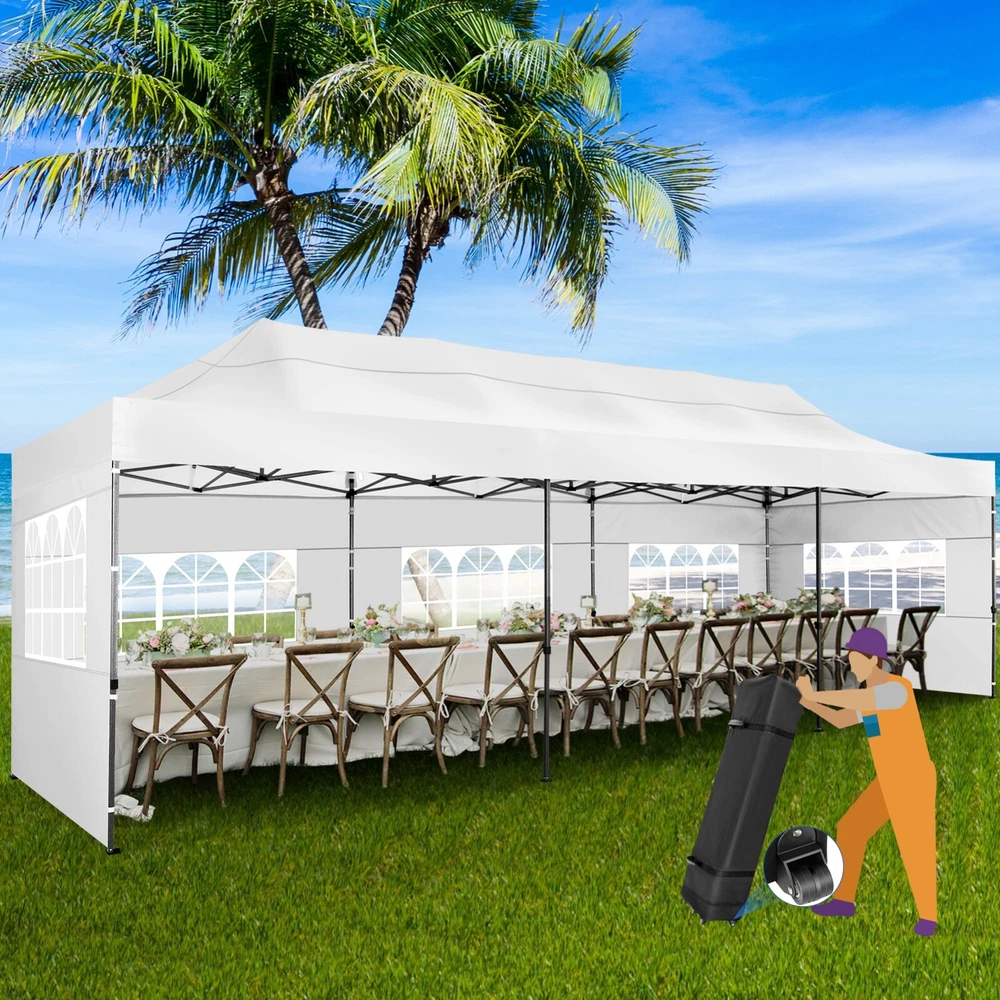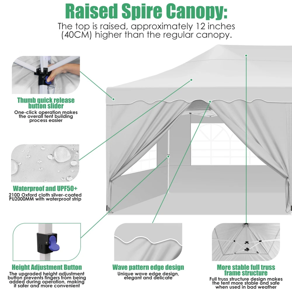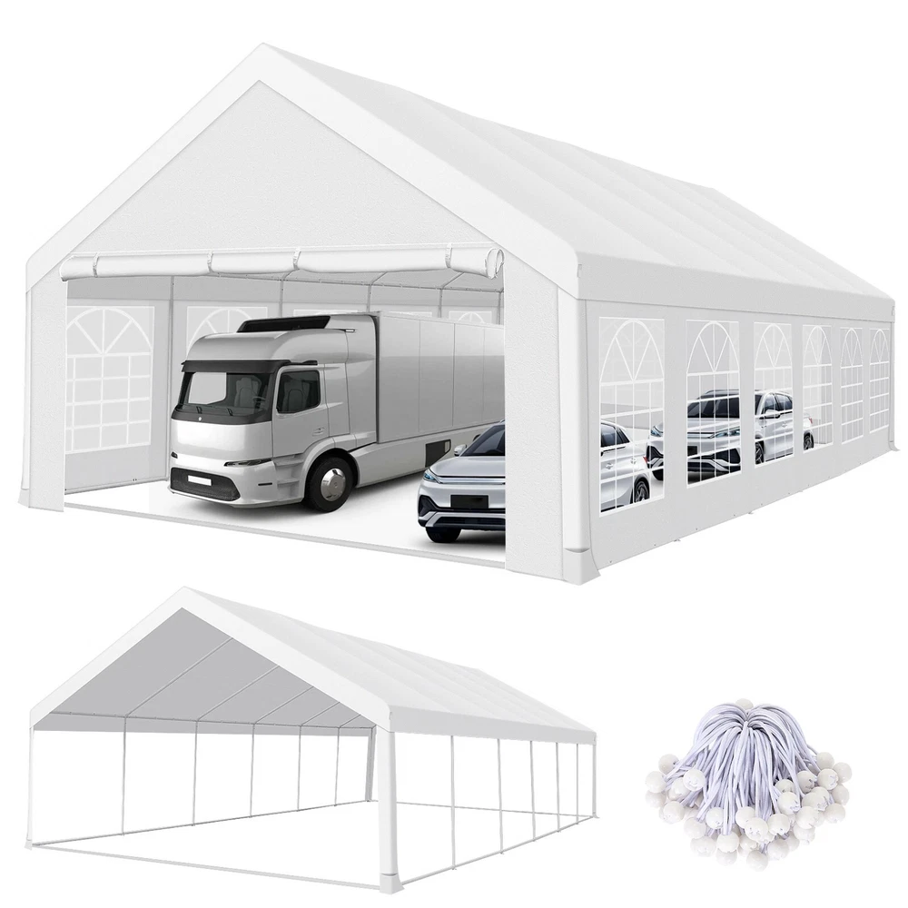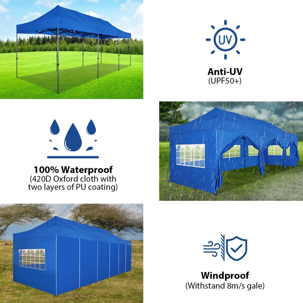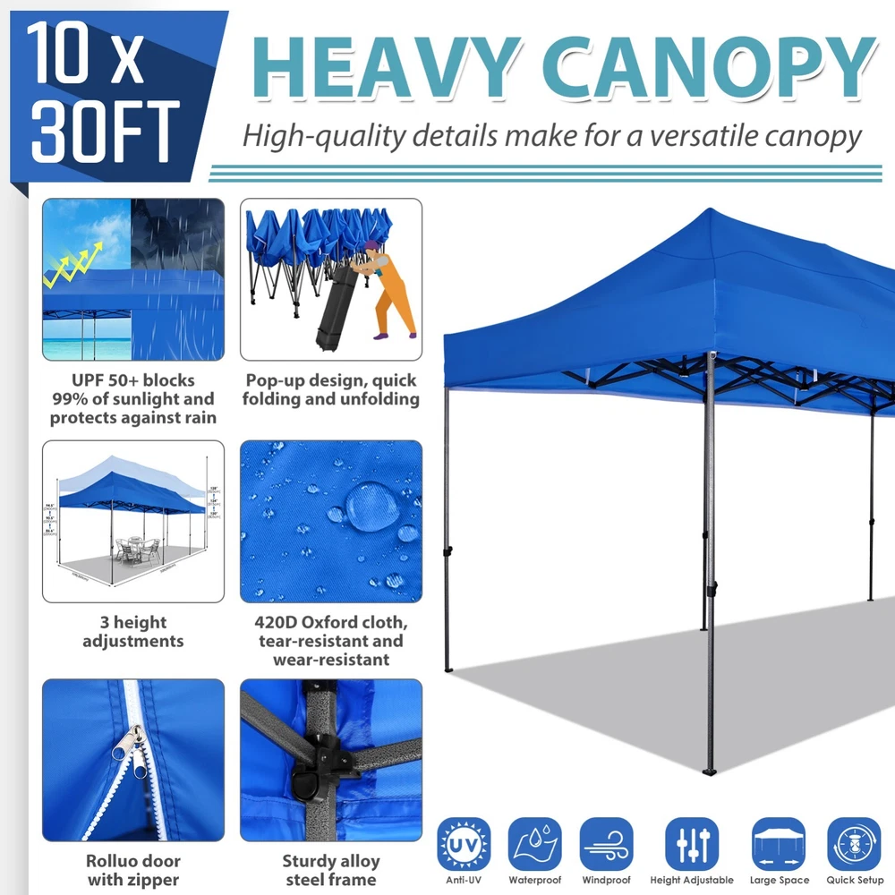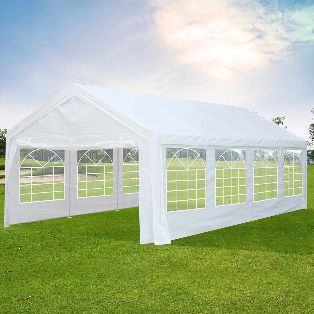 Description Heavy Duty 20x40 Event Tent Large Shelter with Removable Sidewalls, Carpas para Fiestas Commercial Outdoor Canopy Wedding Tent Carport, UV 50+, Waterproof About this item 💐 【 Heavy duty Structure & Closed Extra Ground Bars 】party tents 20x40 made from 1.5inch diameter all metal tube frame with elegant white paint coating, preventing chipping, peeling, rust, and corrosion. The stable triangular roof and closed ground link structure make the product more stable and less likely to shake than similar models on the market. Pegs and wind ropes, to make the event tents much safer and more stable. (Please do not use it when the wind is strong). 💐【 20x40 FT Extra Large Size & Versatile Usage 】20x40 tent can hold up to an estimated 50 people for for parties, or weddings, and can also be used as a carport or outdoor storage tent. Straight leg design and cathedral style roof offers an open-air feel for a variety of outdoor activities. Great for tent party, outdoor events, outdoor shelter. 💐【 All Season Tarp & Cathedral Windows 】 This heavy duty party tent top cover is made of heat-sealed, triple-layer 160g polyethylene fabric can Block 99% of Harmful UV Rays, which is waterproof and windproof, rainproof, dustproof and anti-snow, tear resistant etc. Waterproof PVC cathedral windows on the sides provide the tent with bright light and a good view. 💐【 Removable Sidewalls & Excellent Ventilation 】Our wedding tents Comes With 6 removable sidewalls with 12 PVC church windows and 2 zipper doors with windows. The number of the sidewall can be installed freely as needed. Roll-up zipper door and detachable sidewalls for even better ventilation, providing cross ventilation and venting on hot days. Also provides warmth on cold days. 💐【 Easy to Assemble & Warranty 】This waterproof outdoor wedding gazebo does not require additional installation tools. Connectiong with spring bottom simple and easy to use for quick installation. Any problem with any part, you can contact our customer service, we continue to provide you with after-sales service. Please note that this party tent is NOT FIREPROOF, so please keep it away from any fire source. Specifications: Color: White Size:20×40×10.5ft Product Weight: 300lb Weight Bearing: 2000lbs Waterproof: 100% Waterproof Sun Protection Index: UPF 50+ Cover Material: 160g PE Cloth Frame Material: Heavy Duty Metal Wide Usage: Perfect for Parties, Wedding, Camping, Storage, Shelter, marketing events, etc . Party Tent Size 20'X40' Roof style & Canopy material Peak Style Roof & Heat-sealed Triple-layer PE Tarp, Waterproof, UV protection and Tear resistant Pole material Elegant White Painted Steel Pipe, diameter 38mm, thickness 1.0mm, preventing chipping, peeling, rust, and corrosion. Sidewalls 6 Detachable Window Panels with 12 PVC Church Windows; and 2 Detachable Door Panels With Roll- up Zipper Door & 4 PVC Church Windows Party Tent Height 11.5FT to the top, 6.6FTto the edge; Window size: 4.3*4.7FT Note This party tent is NOT FIREPROOF, please stay away from the fire source. More Stability Art-welded Tube Connector; Elastic ball strap fasten the canopy to the frame; Pegs and wind ropes; Weight bags at the four corners of the canopy can add stability Variety Of Applications Perfect for Outdoor Patio Event Parties, Commercial Business Exhibition, Outdoor Wedding Parties, Storage tent, Carport, and so on. For Carport For Commercial Exhibition For Storage Tent For Wedding Tent 10'x30' / 8 Sidewalls 3 x 9m Pop Up Canopy Commercial Tent Eight Sides Three Doors Waterproof Tent Sun Shelter ✨About this item 🌟【Heavy Duty Upgraded Frame】The frame of 10x30 Pop Up Canopy Tent is commercial grade full truss construction made of durable powder coated stainless steel. 32mm/1.26 inch widened pipe diameter, 0.7mm/0.03 inch thickened wall thickness, Stronger and more stable than other normal gazebos on the market. The middle support pole structure can hold up to 220 lbs on a single pole and can withstand up to level 4 wind (18mph), using the included sandbags, ropes and nails for increased carport stability. 🌟【Best Quality Fabric and Sidewalls】10x30 Heavy duty canopy tent is made of 420D Oxford cloth with two layers of PU coating, UPF 50+, blocks 99% of UV rays. Heat-sealed seam technology is used, 100% waterproof, 1500mm waterproof pressure, waterproof effect is better than other general tents. 8 PU coated sidewalls connected by a whole strip of velcro and zipper to attach to the frame top and legs for securing, removable, you can install as many sidewalls as you want, convenient and practical. 🌟【Easy Set up, 3 Adjustable Heights】2-4 people can easily set up and take down 10x20 outdoor party tent canopy in minutes without tools, it can easily accommodate 20-25 people. Just remove the fully assembled frame and top from bag, place fabric over frame, stretch legs, and you're done. Wedding tent gazebo is available in 3 different heights (86.6'', 90.5'', 94.5'') for your choice to ensure adequate headspace. Best thumb latch system is easy to lock and release without pinching your fingers. 🌟【Portable 4 Wheels Roller Bag】Since 10x30 heavy duty pop up canopy tent with sidewalls has a weight of 136 lbs, we offer you a solid and durable 600D Oxford cloth PVC coated roller bag. It has 4 large wheels for standing feet and reinforced handle for easy movement and transportation. Tents for parties, weddings, BBQ, trade shows, sporting events, disaster relief or any outdoor event. Waterproof canopy gazebo are commonly used in commercial areas, playgrounds, patios, beaches, farms, gyms, etc. 🌟【WHAT'S INCLUDED】1x Commercial grade 10x30 Pop up Tent Frame, 1x 10'x30' Canopy Top Cover, 8x PU Coated Panels (5x Sidewalls with Window and 3x Sidewalls with Zipper), 4x 420D Oxford cloth PVC coated Sandbags, 4x Ground Pegs, 6x Wind Ropes, 1x Roller bag, 1x Manual. If you have any questions and doubts, please feel free to contact us, we will 
