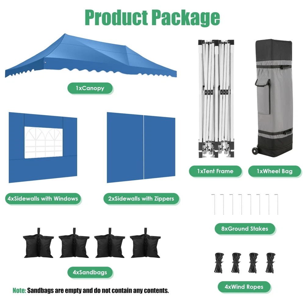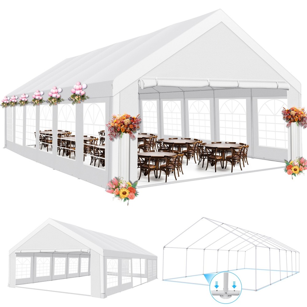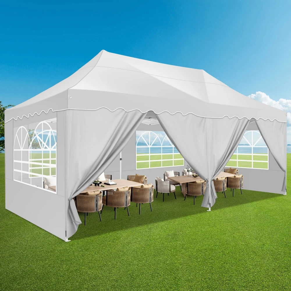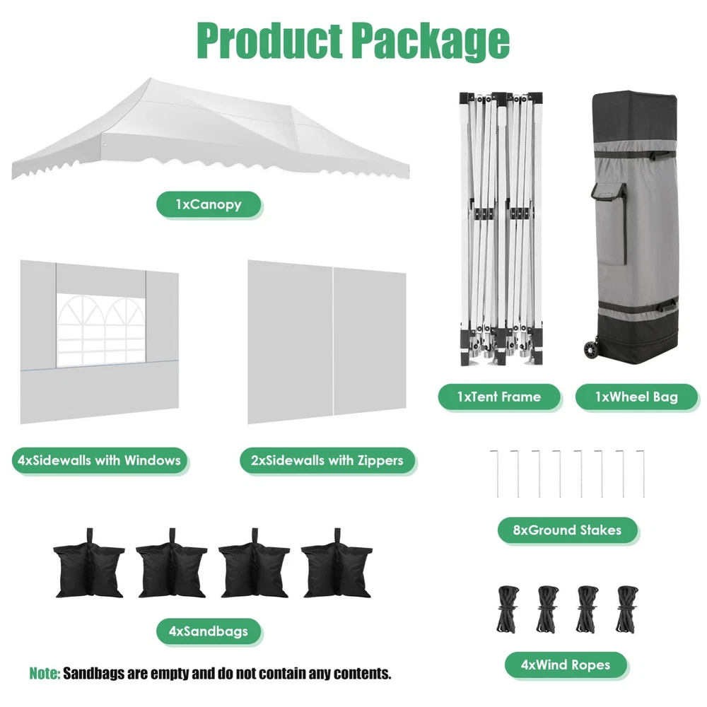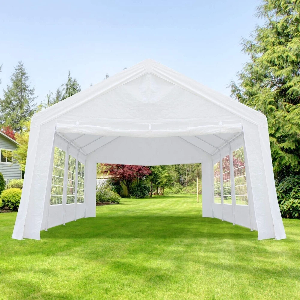 Description Heavy Duty 20x40 Event Tent Large Shelter with Removable Sidewalls, Carpas para Fiestas Commercial Outdoor Canopy Wedding Tent Carport, UV 50+, Waterproof About this item 💐 【 Heavy duty Structure & Closed Extra Ground Bars 】party tents 20x40 made from 1.5inch diameter all metal tube frame with elegant white paint coating, preventing chipping, peeling, rust, and corrosion. The stable triangular roof and closed ground link structure make the product more stable and less likely to shake than similar models on the market. Pegs and wind ropes, to make the event tents much safer and more stable. (Please do not use it when the wind is strong). 💐【 20x40 FT Extra Large Size & Versatile Usage 】20x40 tent can hold up to an estimated 50 people for for parties, or weddings, and can also be used as a carport or outdoor storage tent. Straight leg design and cathedral style roof offers an open-air feel for a variety of outdoor activities. Great for tent party, outdoor events, outdoor shelter. 💐【 All Season Tarp & Cathedral Windows 】 This heavy duty party tent top cover is made of heat-sealed, triple-layer 160g polyethylene fabric can Block 99% of Harmful UV Rays, which is waterproof and windproof, rainproof, dustproof and anti-snow, tear resistant etc. Waterproof PVC cathedral windows on the sides provide the tent with bright light and a good view. 💐【 Removable Sidewalls & Excellent Ventilation 】Our wedding tents Comes With 6 removable sidewalls with 12 PVC church windows and 2 zipper doors with windows. The number of the sidewall can be installed freely as needed. Roll-up zipper door and detachable sidewalls for even better ventilation, providing cross ventilation and venting on hot days. Also provides warmth on cold days. 💐【 Easy to Assemble & Warranty 】This waterproof outdoor wedding gazebo does not require additional installation tools. Connectiong with spring bottom simple and easy to use for quick installation. Any problem with any part, you can contact our customer service, we continue to provide you with after-sales service. Please note that this party tent is NOT FIREPROOF, so please keep it away from any fire source. Specifications: Color: White Size:20×40×10.5ft Product Weight: 300lb Weight Bearing: 2000lbs Waterproof: 100% Waterproof Sun Protection Index: UPF 50+ Cover Material: 160g PE Cloth Frame Material: Heavy Duty Metal Wide Usage: Perfect for Parties, Wedding, Camping, Storage, Shelter, marketing events, etc . Party Tent Size 20'X40' Roof style & Canopy material Peak Style Roof & Heat-sealed Triple-layer PE Tarp, Waterproof, UV protection and Tear resistant Pole material Elegant White Painted Steel Pipe, diameter 38mm, thickness 1.0mm, preventing chipping, peeling, rust, and corrosion. Sidewalls 6 Detachable Window Panels with 12 PVC Church Windows; and 2 Detachable Door Panels With Roll- up Zipper Door & 4 PVC Church Windows Party Tent Height 11.5FT to the top, 6.6FTto the edge; Window size: 4.3*4.7FT Note This party tent is NOT FIREPROOF, please stay away from the fire source. More Stability Art-welded Tube Connector; Elastic ball strap fasten the canopy to the frame; Pegs and wind ropes; Weight bags at the four corners of the canopy can add stability Variety Of Applications Perfect for Outdoor Patio Event Parties, Commercial Business Exhibition, Outdoor Wedding Parties, Storage tent, Carport, and so on. For Carport For Commercial Exhibition For Storage Tent For Wedding Tent 10'x30' / 8 Sidewalls 3 x 9m Pop Up Canopy Commercial Tent Eight Sides Three Doors Waterproof Tent Sun Shelter ✨About this item 🌟【Heavy Duty Upgraded Frame】The frame of 10x30 Pop Up Canopy Tent is commercial grade full truss construction made of durable powder coated stainless steel. 32mm/1.26 inch widened pipe diameter, 0.7mm/0.03 inch thickened wall thickness, Stronger and more stable than other normal gazebos on the market. The middle support pole structure can hold up to 220 lbs on a single pole and can withstand up to level 4 wind (18mph), using the included sandbags, ropes and nails for increased carport stability. 🌟【Best Quality Fabric and Sidewalls】10x30 Heavy duty canopy tent is made of 420D Oxford cloth with two layers of PU coating, UPF 50+, blocks 99% of UV rays. Heat-sealed seam technology is used, 100% waterproof, 1500mm waterproof pressure, waterproof effect is better than other general tents. 8 PU coated sidewalls connected by a whole strip of velcro and zipper to attach to the frame top and legs for securing, removable, you can install as many sidewalls as you want, convenient and practical. 🌟【Easy Set up, 3 Adjustable Heights】2-4 people can easily set up and take down 10x20 outdoor party tent canopy in minutes without tools, it can easily accommodate 20-25 people. Just remove the fully assembled frame and top from bag, place fabric over frame, stretch legs, and you're done. Wedding tent gazebo is available in 3 different heights (86.6'', 90.5'', 94.5'') for your choice to ensure adequate headspace. Best thumb latch system is easy to lock and release without pinching your fingers. 🌟【Portable 4 Wheels Roller Bag】Since 10x30 heavy duty pop up canopy tent with sidewalls has a weight of 136 lbs, we offer you a solid and durable 600D Oxford cloth PVC coated roller bag. It has 4 large wheels for standing feet and reinforced handle for easy movement and transportation. Tents for parties, weddings, BBQ, trade shows, sporting events, disaster relief or any outdoor event. Waterproof canopy gazebo are commonly used in commercial areas, playgrounds, patios, beaches, farms, gyms, etc. 🌟【WHAT'S INCLUDED】1x Commercial grade 10x30 Pop up Tent Frame, 1x 10'x30' Canopy Top Cover, 8x PU Coated Panels (5x Sidewalls with Window and 3x Sidewalls with Zipper), 4x 420D Oxford cloth PVC coated Sandbags, 4x Ground Pegs, 6x Wind Ropes, 1x Roller bag, 1x Manual. If you have any questions and doubts, please feel free to contact us, we will 