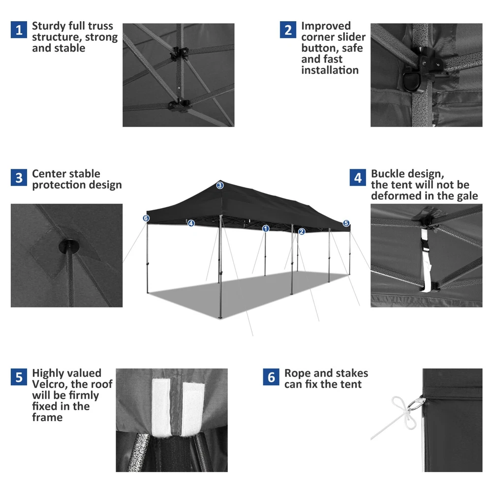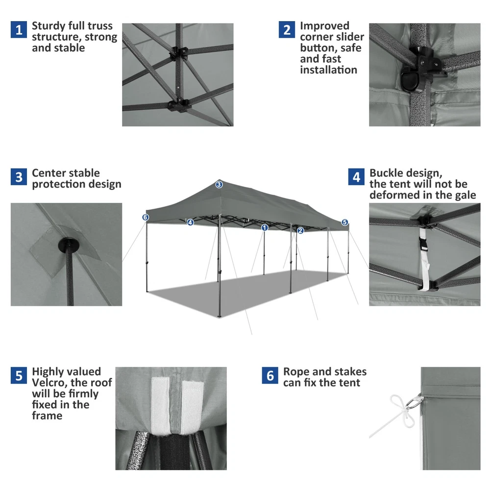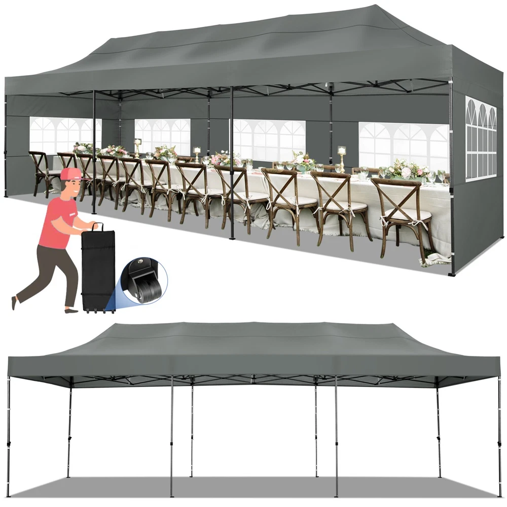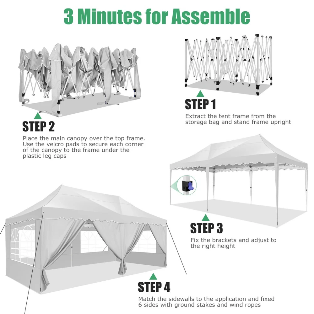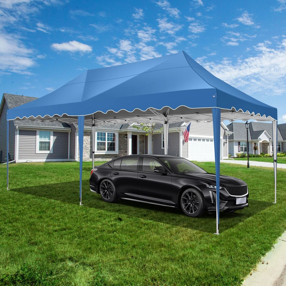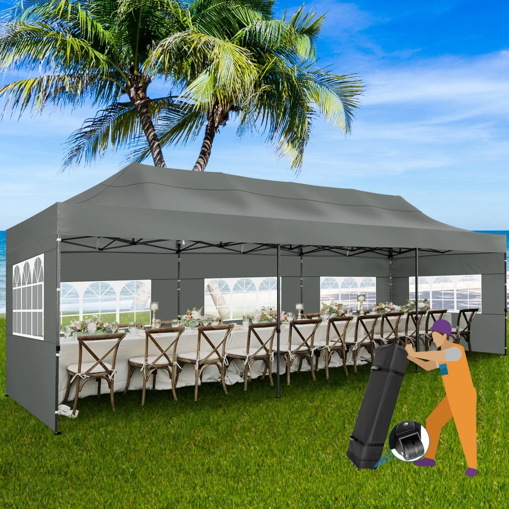 Description Heavy Duty 20x40 Event Tent Large Shelter with Removable Sidewalls, Carpas para Fiestas Commercial Outdoor Canopy Wedding Tent Carport, UV 50+, Waterproof About this item 💐 【 Heavy duty Structure & Closed Extra Ground Bars 】party tents 20x40 made from 1.5inch diameter all metal tube frame with elegant white paint coating, preventing chipping, peeling, rust, and corrosion. The stable triangular roof and closed ground link structure make the product more stable and less likely to shake than similar models on the market. Pegs and wind ropes, to make the event tents much safer and more stable. (Please do not use it when the wind is strong). 💐【 20x40 FT Extra Large Size & Versatile Usage 】20x40 tent can hold up to an estimated 50 people for for parties, or weddings, and can also be used as a carport or outdoor storage tent. Straight leg design and cathedral style roof offers an open-air feel for a variety of outdoor activities. Great for tent party, outdoor events, outdoor shelter. 💐【 All Season Tarp & Cathedral Windows 】 This heavy duty party tent top cover is made of heat-sealed, triple-layer 160g polyethylene fabric can Block 99% of Harmful UV Rays, which is waterproof and windproof, rainproof, dustproof and anti-snow, tear resistant etc. Waterproof PVC cathedral windows on the sides provide the tent with bright light and a good view. 💐【 Removable Sidewalls & Excellent Ventilation 】Our wedding tents Comes With 6 removable sidewalls with 12 PVC church windows and 2 zipper doors with windows. The number of the sidewall can be installed freely as needed. Roll-up zipper door and detachable sidewalls for even better ventilation, providing cross ventilation and venting on hot days. Also provides warmth on cold days. 💐【 Easy to Assemble & Warranty 】This waterproof outdoor wedding gazebo does not require additional installation tools. Connectiong with spring bottom simple and easy to use for quick installation. Any problem with any part, you can contact our customer service, we continue to provide you with after-sales service. Please note that this party tent is NOT FIREPROOF, so please keep it away from any fire source. Specifications: Color: White Size:20×40×10.5ft Product Weight: 300lb Weight Bearing: 2000lbs Waterproof: 100% Waterproof Sun Protection Index: UPF 50+ Cover Material: 160g PE Cloth Frame Material: Heavy Duty Metal Wide Usage: Perfect for Parties, Wedding, Camping, Storage, Shelter, marketing events, etc . Party Tent Size 20'X40' Roof style & Canopy material Peak Style Roof & Heat-sealed Triple-layer PE Tarp, Waterproof, UV protection and Tear resistant Pole material Elegant White Painted Steel Pipe, diameter 38mm, thickness 1.0mm, preventing chipping, peeling, rust, and corrosion. Sidewalls 6 Detachable Window Panels with 12 PVC Church Windows; and 2 Detachable Door Panels With Roll- up Zipper Door & 4 PVC Church Windows Party Tent Height 11.5FT to the top, 6.6FTto the edge; Window size: 4.3*4.7FT Note This party tent is NOT FIREPROOF, please stay away from the fire source. More Stability Art-welded Tube Connector; Elastic ball strap fasten the canopy to the frame; Pegs and wind ropes; Weight bags at the four corners of the canopy can add stability Variety Of Applications Perfect for Outdoor Patio Event Parties, Commercial Business Exhibition, Outdoor Wedding Parties, Storage tent, Carport, and so on. For Carport For Commercial Exhibition For Storage Tent For Wedding Tent 10'x30' / 8 Sidewalls 3 x 9m Pop Up Canopy Commercial Tent Eight Sides Three Doors Waterproof Tent Sun Shelter ✨About this item 🌟【Heavy Duty Upgraded Frame】The frame of 10x30 Pop Up Canopy Tent is commercial grade full truss construction made of durable powder coated stainless steel. 32mm/1.26 inch widened pipe diameter, 0.7mm/0.03 inch thickened wall thickness, Stronger and more stable than other normal gazebos on the market. The middle support pole structure can hold up to 220 lbs on a single pole and can withstand up to level 4 wind (18mph), using the included sandbags, ropes and nails for increased carport stability. 🌟【Best Quality Fabric and Sidewalls】10x30 Heavy duty canopy tent is made of 420D Oxford cloth with two layers of PU coating, UPF 50+, blocks 99% of UV rays. Heat-sealed seam technology is used, 100% waterproof, 1500mm waterproof pressure, waterproof effect is better than other general tents. 8 PU coated sidewalls connected by a whole strip of velcro and zipper to attach to the frame top and legs for securing, removable, you can install as many sidewalls as you want, convenient and practical. 🌟【Easy Set up, 3 Adjustable Heights】2-4 people can easily set up and take down 10x20 outdoor party tent canopy in minutes without tools, it can easily accommodate 20-25 people. Just remove the fully assembled frame and top from bag, place fabric over frame, stretch legs, and you're done. Wedding tent gazebo is available in 3 different heights (86.6'', 90.5'', 94.5'') for your choice to ensure adequate headspace. Best thumb latch system is easy to lock and release without pinching your fingers. 🌟【Portable 4 Wheels Roller Bag】Since 10x30 heavy duty pop up canopy tent with sidewalls has a weight of 136 lbs, we offer you a solid and durable 600D Oxford cloth PVC coated roller bag. It has 4 large wheels for standing feet and reinforced handle for easy movement and transportation. Tents for parties, weddings, BBQ, trade shows, sporting events, disaster relief or any outdoor event. Waterproof canopy gazebo are commonly used in commercial areas, playgrounds, patios, beaches, farms, gyms, etc. 🌟【WHAT'S INCLUDED】1x Commercial grade 10x30 Pop up Tent Frame, 1x 10'x30' Canopy Top Cover, 8x PU Coated Panels (5x Sidewalls with Window and 3x Sidewalls with Zipper), 4x 420D Oxford cloth PVC coated Sandbags, 4x Ground Pegs, 6x Wind Ropes, 1x Roller bag, 1x Manual. If you have any questions and doubts, please feel free to contact us, we will 