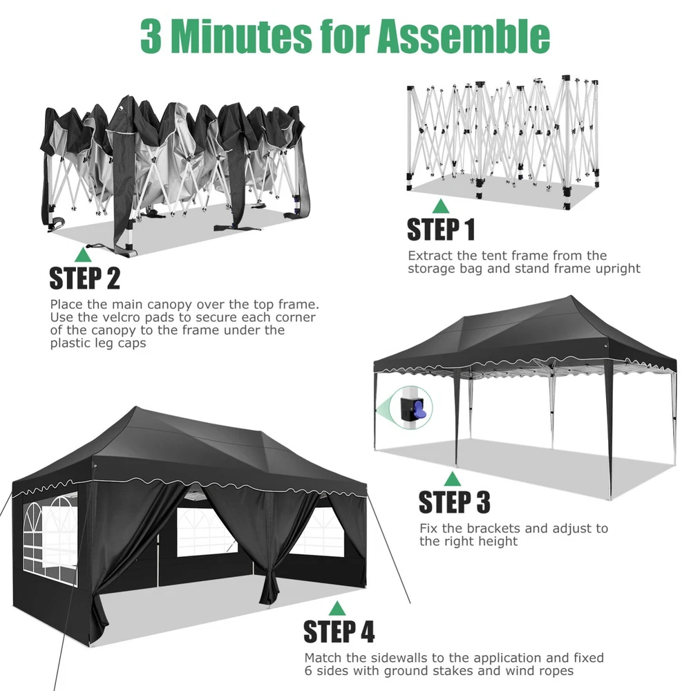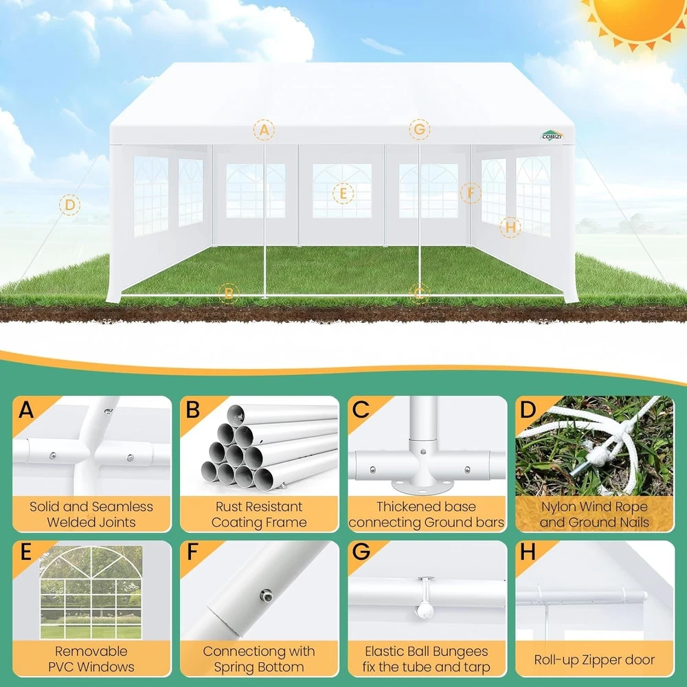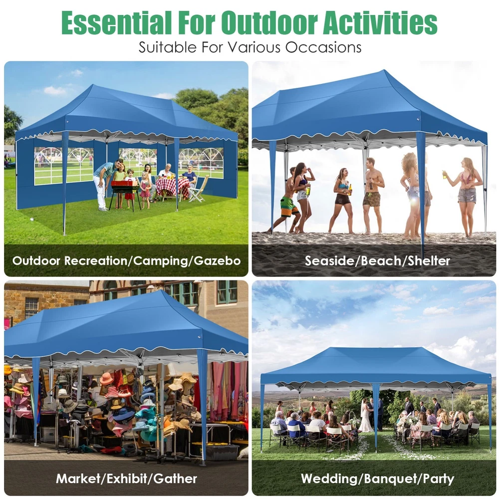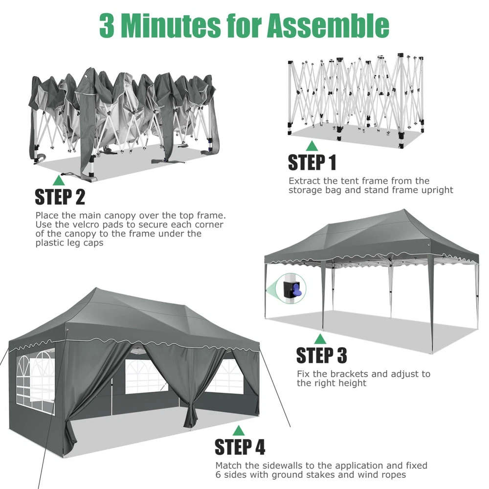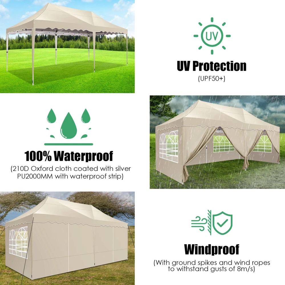 Description Heavy Duty 20x40 Event Tent Large Shelter with Removable Sidewalls, Carpas para Fiestas Commercial Outdoor Canopy Wedding Tent Carport, UV 50+, Waterproof About this item 💐 【 Heavy duty Structure & Closed Extra Ground Bars 】party tents 20x40 made from 1.5inch diameter all metal tube frame with elegant white paint coating, preventing chipping, peeling, rust, and corrosion. The stable triangular roof and closed ground link structure make the product more stable and less likely to shake than similar models on the market. Pegs and wind ropes, to make the event tents much safer and more stable. (Please do not use it when the wind is strong). 💐【 20x40 FT Extra Large Size & Versatile Usage 】20x40 tent can hold up to an estimated 50 people for for parties, or weddings, and can also be used as a carport or outdoor storage tent. Straight leg design and cathedral style roof offers an open-air feel for a variety of outdoor activities. Great for tent party, outdoor events, outdoor shelter. 💐【 All Season Tarp & Cathedral Windows 】 This heavy duty party tent top cover is made of heat-sealed, triple-layer 160g polyethylene fabric can Block 99% of Harmful UV Rays, which is waterproof and windproof, rainproof, dustproof and anti-snow, tear resistant etc. Waterproof PVC cathedral windows on the sides provide the tent with bright light and a good view. 💐【 Removable Sidewalls & Excellent Ventilation 】Our wedding tents Comes With 6 removable sidewalls with 12 PVC church windows and 2 zipper doors with windows. The number of the sidewall can be installed freely as needed. Roll-up zipper door and detachable sidewalls for even better ventilation, providing cross ventilation and venting on hot days. Also provides warmth on cold days. 💐【 Easy to Assemble & Warranty 】This waterproof outdoor wedding gazebo does not require additional installation tools. Connectiong with spring bottom simple and easy to use for quick installation. Any problem with any part, you can contact our customer service, we continue to provide you with after-sales service. Please note that this party tent is NOT FIREPROOF, so please keep it away from any fire source. Specifications: Color: White Size:20×40×10.5ft Product Weight: 300lb Weight Bearing: 2000lbs Waterproof: 100% Waterproof Sun Protection Index: UPF 50+ Cover Material: 160g PE Cloth Frame Material: Heavy Duty Metal Wide Usage: Perfect for Parties, Wedding, Camping, Storage, Shelter, marketing events, etc . Party Tent Size 20'X40' Roof style & Canopy material Peak Style Roof & Heat-sealed Triple-layer PE Tarp, Waterproof, UV protection and Tear resistant Pole material Elegant White Painted Steel Pipe, diameter 38mm, thickness 1.0mm, preventing chipping, peeling, rust, and corrosion. Sidewalls 6 Detachable Window Panels with 12 PVC Church Windows; and 2 Detachable Door Panels With Roll- up Zipper Door & 4 PVC Church Windows Party Tent Height 11.5FT to the top, 6.6FTto the edge; Window size: 4.3*4.7FT Note This party tent is NOT FIREPROOF, please stay away from the fire source. More Stability Art-welded Tube Connector; Elastic ball strap fasten the canopy to the frame; Pegs and wind ropes; Weight bags at the four corners of the canopy can add stability Variety Of Applications Perfect for Outdoor Patio Event Parties, Commercial Business Exhibition, Outdoor Wedding Parties, Storage tent, Carport, and so on. For Carport For Commercial Exhibition For Storage Tent For Wedding Tent 10'x30' / 8 Sidewalls 3 x 9m Pop Up Canopy Commercial Tent Eight Sides Three Doors Waterproof Tent Sun Shelter ✨About this item 🌟【Heavy Duty Upgraded Frame】The frame of 10x30 Pop Up Canopy Tent is commercial grade full truss construction made of durable powder coated stainless steel. 32mm/1.26 inch widened pipe diameter, 0.7mm/0.03 inch thickened wall thickness, Stronger and more stable than other normal gazebos on the market. The middle support pole structure can hold up to 220 lbs on a single pole and can withstand up to level 4 wind (18mph), using the included sandbags, ropes and nails for increased carport stability. 🌟【Best Quality Fabric and Sidewalls】10x30 Heavy duty canopy tent is made of 420D Oxford cloth with two layers of PU coating, UPF 50+, blocks 99% of UV rays. Heat-sealed seam technology is used, 100% waterproof, 1500mm waterproof pressure, waterproof effect is better than other general tents. 8 PU coated sidewalls connected by a whole strip of velcro and zipper to attach to the frame top and legs for securing, removable, you can install as many sidewalls as you want, convenient and practical. 🌟【Easy Set up, 3 Adjustable Heights】2-4 people can easily set up and take down 10x20 outdoor party tent canopy in minutes without tools, it can easily accommodate 20-25 people. Just remove the fully assembled frame and top from bag, place fabric over frame, stretch legs, and you're done. Wedding tent gazebo is available in 3 different heights (86.6'', 90.5'', 94.5'') for your choice to ensure adequate headspace. Best thumb latch system is easy to lock and release without pinching your fingers. 🌟【Portable 4 Wheels Roller Bag】Since 10x30 heavy duty pop up canopy tent with sidewalls has a weight of 136 lbs, we offer you a solid and durable 600D Oxford cloth PVC coated roller bag. It has 4 large wheels for standing feet and reinforced handle for easy movement and transportation. Tents for parties, weddings, BBQ, trade shows, sporting events, disaster relief or any outdoor event. Waterproof canopy gazebo are commonly used in commercial areas, playgrounds, patios, beaches, farms, gyms, etc. 🌟【WHAT'S INCLUDED】1x Commercial grade 10x30 Pop up Tent Frame, 1x 10'x30' Canopy Top Cover, 8x PU Coated Panels (5x Sidewalls with Window and 3x Sidewalls with Zipper), 4x 420D Oxford cloth PVC coated Sandbags, 4x Ground Pegs, 6x Wind Ropes, 1x Roller bag, 1x Manual. If you have any questions and doubts, please feel free to contact us, we will 
