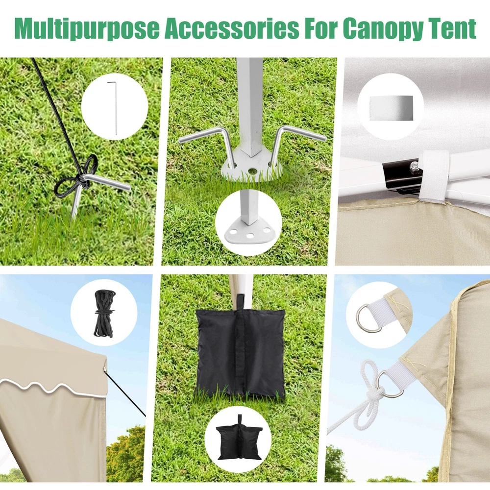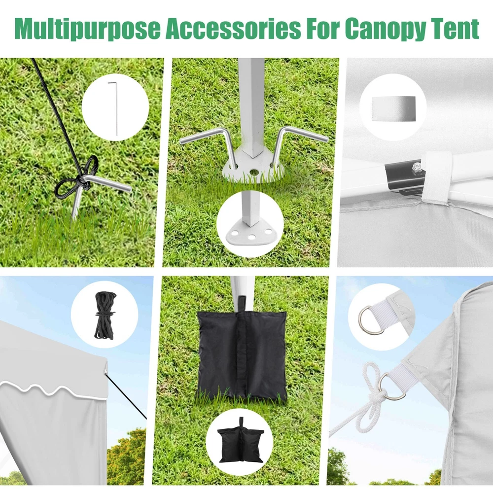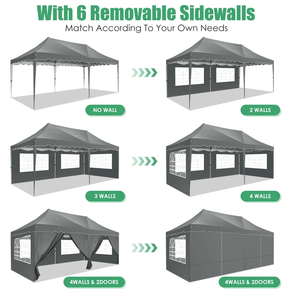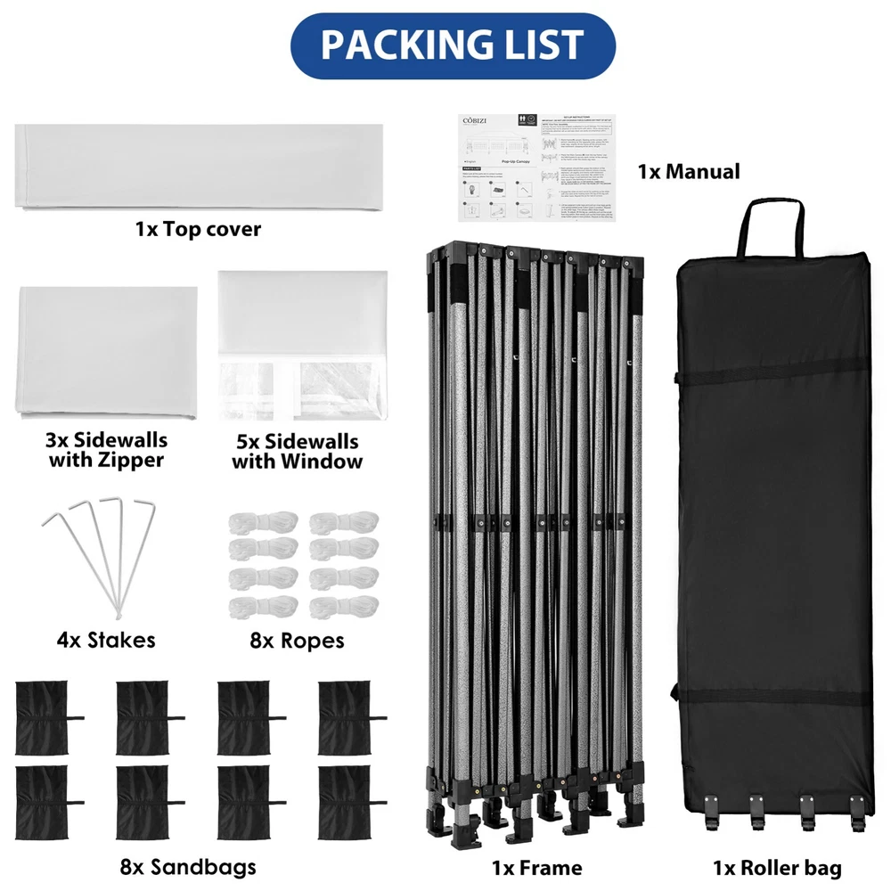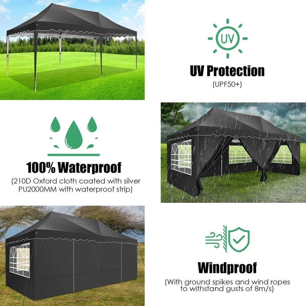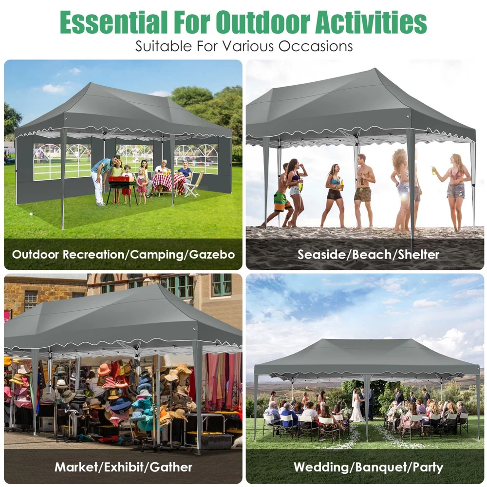 Description Heavy Duty 20x40 Event Tent Large Shelter with Removable Sidewalls, Carpas para Fiestas Commercial Outdoor Canopy Wedding Tent Carport, UV 50+, Waterproof About this item 💐 【 Heavy duty Structure & Closed Extra Ground Bars 】party tents 20x40 made from 1.5inch diameter all metal tube frame with elegant white paint coating, preventing chipping, peeling, rust, and corrosion. The stable triangular roof and closed ground link structure make the product more stable and less likely to shake than similar models on the market. Pegs and wind ropes, to make the event tents much safer and more stable. (Please do not use it when the wind is strong). 💐【 20x40 FT Extra Large Size & Versatile Usage 】20x40 tent can hold up to an estimated 50 people for for parties, or weddings, and can also be used as a carport or outdoor storage tent. Straight leg design and cathedral style roof offers an open-air feel for a variety of outdoor activities. Great for tent party, outdoor events, outdoor shelter. 💐【 All Season Tarp & Cathedral Windows 】 This heavy duty party tent top cover is made of heat-sealed, triple-layer 160g polyethylene fabric can Block 99% of Harmful UV Rays, which is waterproof and windproof, rainproof, dustproof and anti-snow, tear resistant etc. Waterproof PVC cathedral windows on the sides provide the tent with bright light and a good view. 💐【 Removable Sidewalls & Excellent Ventilation 】Our wedding tents Comes With 6 removable sidewalls with 12 PVC church windows and 2 zipper doors with windows. The number of the sidewall can be installed freely as needed. Roll-up zipper door and detachable sidewalls for even better ventilation, providing cross ventilation and venting on hot days. Also provides warmth on cold days. 💐【 Easy to Assemble & Warranty 】This waterproof outdoor wedding gazebo does not require additional installation tools. Connectiong with spring bottom simple and easy to use for quick installation. Any problem with any part, you can contact our customer service, we continue to provide you with after-sales service. Please note that this party tent is NOT FIREPROOF, so please keep it away from any fire source. Specifications: Color: White Size:20×40×10.5ft Product Weight: 300lb Weight Bearing: 2000lbs Waterproof: 100% Waterproof Sun Protection Index: UPF 50+ Cover Material: 160g PE Cloth Frame Material: Heavy Duty Metal Wide Usage: Perfect for Parties, Wedding, Camping, Storage, Shelter, marketing events, etc . Party Tent Size 20'X40' Roof style & Canopy material Peak Style Roof & Heat-sealed Triple-layer PE Tarp, Waterproof, UV protection and Tear resistant Pole material Elegant White Painted Steel Pipe, diameter 38mm, thickness 1.0mm, preventing chipping, peeling, rust, and corrosion. Sidewalls 6 Detachable Window Panels with 12 PVC Church Windows; and 2 Detachable Door Panels With Roll- up Zipper Door & 4 PVC Church Windows Party Tent Height 11.5FT to the top, 6.6FTto the edge; Window size: 4.3*4.7FT Note This party tent is NOT FIREPROOF, please stay away from the fire source. More Stability Art-welded Tube Connector; Elastic ball strap fasten the canopy to the frame; Pegs and wind ropes; Weight bags at the four corners of the canopy can add stability Variety Of Applications Perfect for Outdoor Patio Event Parties, Commercial Business Exhibition, Outdoor Wedding Parties, Storage tent, Carport, and so on. For Carport For Commercial Exhibition For Storage Tent For Wedding Tent 10'x30' / 8 Sidewalls 3 x 9m Pop Up Canopy Commercial Tent Eight Sides Three Doors Waterproof Tent Sun Shelter ✨About this item 🌟【Heavy Duty Upgraded Frame】The frame of 10x30 Pop Up Canopy Tent is commercial grade full truss construction made of durable powder coated stainless steel. 32mm/1.26 inch widened pipe diameter, 0.7mm/0.03 inch thickened wall thickness, Stronger and more stable than other normal gazebos on the market. The middle support pole structure can hold up to 220 lbs on a single pole and can withstand up to level 4 wind (18mph), using the included sandbags, ropes and nails for increased carport stability. 🌟【Best Quality Fabric and Sidewalls】10x30 Heavy duty canopy tent is made of 420D Oxford cloth with two layers of PU coating, UPF 50+, blocks 99% of UV rays. Heat-sealed seam technology is used, 100% waterproof, 1500mm waterproof pressure, waterproof effect is better than other general tents. 8 PU coated sidewalls connected by a whole strip of velcro and zipper to attach to the frame top and legs for securing, removable, you can install as many sidewalls as you want, convenient and practical. 🌟【Easy Set up, 3 Adjustable Heights】2-4 people can easily set up and take down 10x20 outdoor party tent canopy in minutes without tools, it can easily accommodate 20-25 people. Just remove the fully assembled frame and top from bag, place fabric over frame, stretch legs, and you're done. Wedding tent gazebo is available in 3 different heights (86.6'', 90.5'', 94.5'') for your choice to ensure adequate headspace. Best thumb latch system is easy to lock and release without pinching your fingers. 🌟【Portable 4 Wheels Roller Bag】Since 10x30 heavy duty pop up canopy tent with sidewalls has a weight of 136 lbs, we offer you a solid and durable 600D Oxford cloth PVC coated roller bag. It has 4 large wheels for standing feet and reinforced handle for easy movement and transportation. Tents for parties, weddings, BBQ, trade shows, sporting events, disaster relief or any outdoor event. Waterproof canopy gazebo are commonly used in commercial areas, playgrounds, patios, beaches, farms, gyms, etc. 🌟【WHAT'S INCLUDED】1x Commercial grade 10x30 Pop up Tent Frame, 1x 10'x30' Canopy Top Cover, 8x PU Coated Panels (5x Sidewalls with Window and 3x Sidewalls with Zipper), 4x 420D Oxford cloth PVC coated Sandbags, 4x Ground Pegs, 6x Wind Ropes, 1x Roller bag, 1x Manual. If you have any questions and doubts, please feel free to contact us, we will 