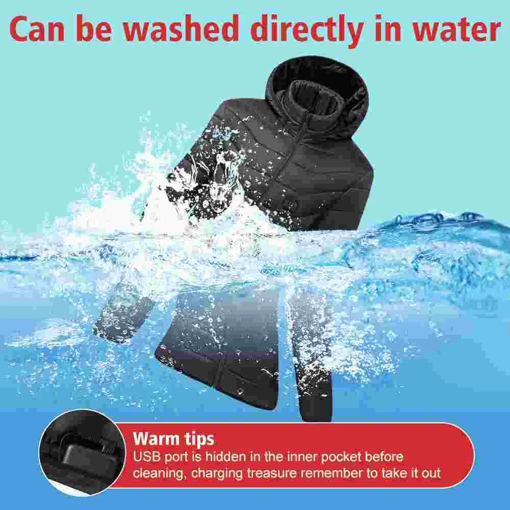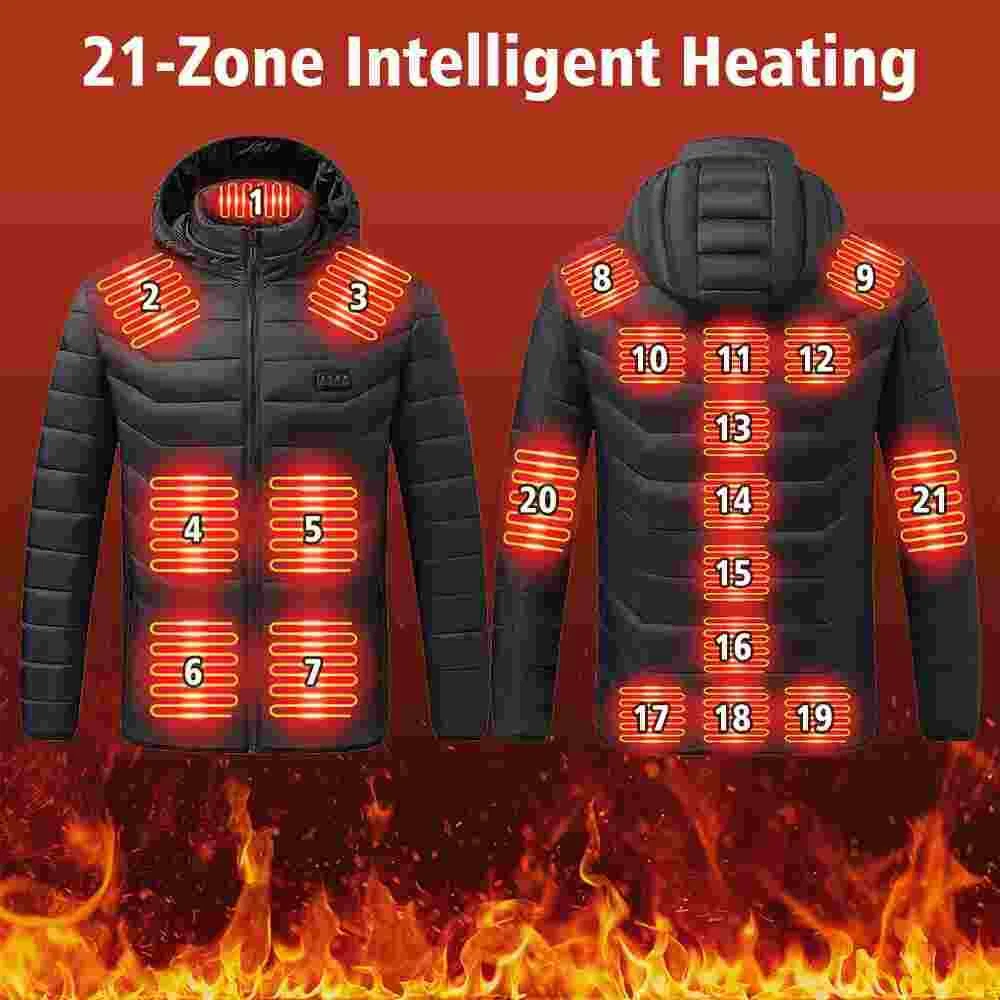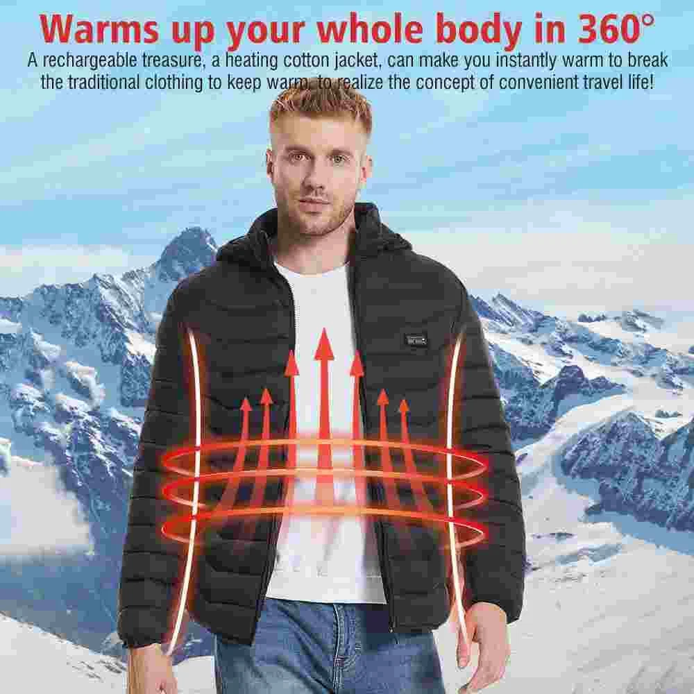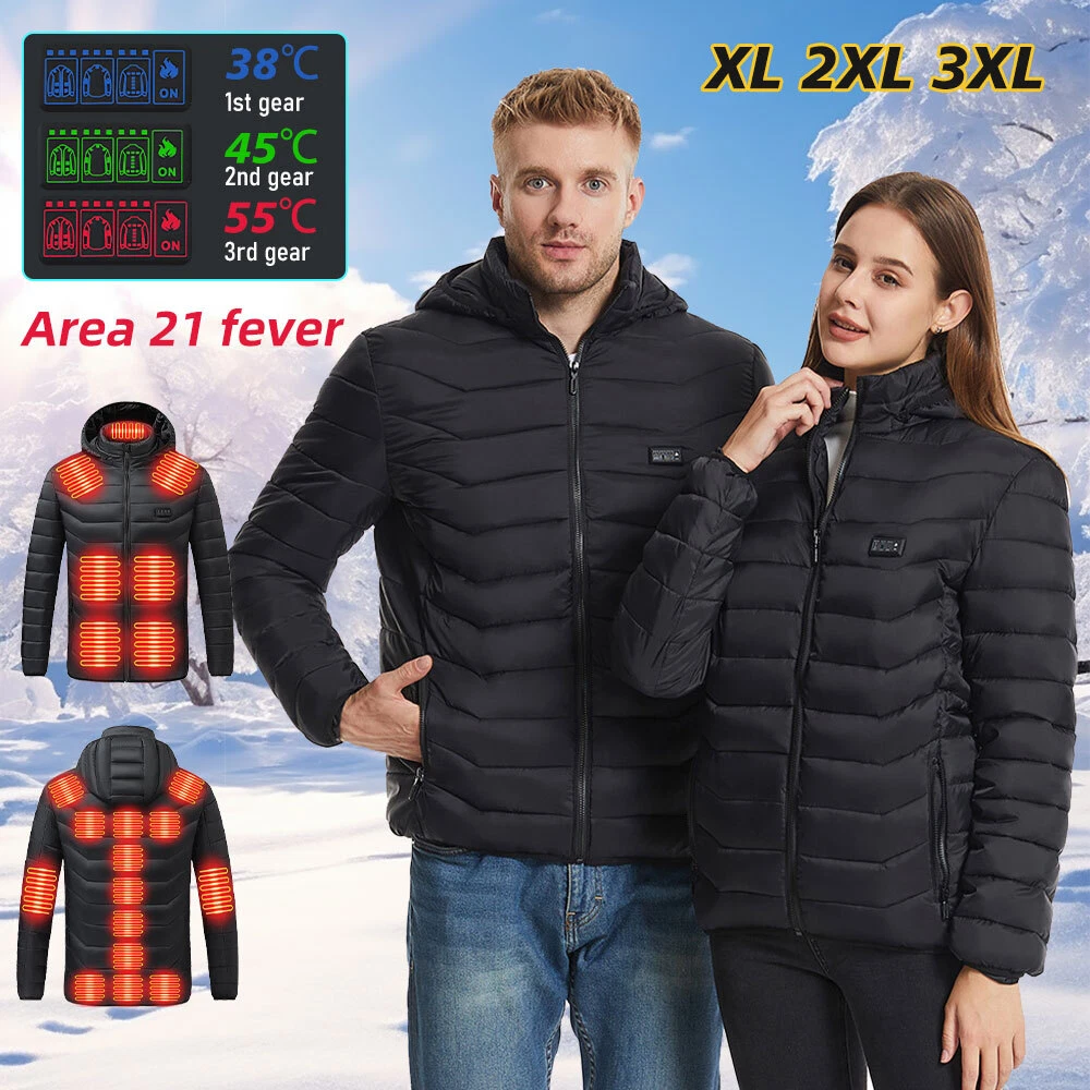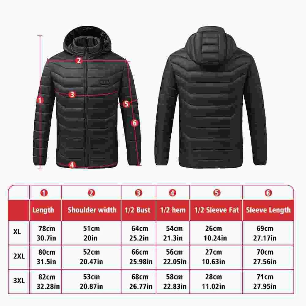 Note!!! To ensure better heating effect, please be sure to choose the size that fits your body shape according to the size chart. Featur es : 1. 21Heating Zones and 3 Temperature Adjustment: Carbon fiber heating elements generate heat across the waist, shoulder ,arm, belly,neck, and back, promote blood circulation and keep you warm. 3 heating temperature adjustment according to your needs. * 2. USB Charging: Easy to charge. You need to always connect 5V 2A mobile power(this product does not include power bank). The mobile power needs to be removed during washing. 3. Safe and Healthy: The 5V far infrared heating is far below the human body safety voltage. Large area carbon fiber wire heater is safe and insulated, ensure safe heating for you. 4. Skin-friendly and Comfortable: Soft and comfortable touch, premium fabrics, keep you warm in cold winter conditions without wearing thick clothes. 5. Wide Application: Suitable for outdoor skiing, winter fishing, cycling, camping, skating, or daily wear, etc. Descr iption : 1. Size: XL/XXL/3XL(US) * 2. Material: -Liner: Polyester -Fabric: Nylon, 100% cotton 3. Temperature Adjustment: -Warm: 45℃ (Red Light) -Comfort: 35℃ (White Light) -Energy Saving: 25℃ (Blue Light) Instructions: *1. T ake out the USB plug . *2. Access to the mobile charging power source. *3. Press and hold the chest temperature control output switch for 3 second s. 4. Long press the chest temperature control switch for 3 seconds, start to warm up and then adjust to the medium temperature heat when you need to always connect the mobile power. 5. Manual adjustment between 3 gears. Warm at 45 degrees Celsius, Comfortable at 35 degrees Celsius, and Energy-saving at 25 degrees Celsius. 6. Press and hold the chest temperature control switch for 3 seconds, and turn off the light to stop heating. Washing Tips: - Machine wash & hand wash are available. Do not wring or twist. - Unplug the powers before washing and make sure it is dried before heating. Pack age Includes: 1 x Heated Jacket ( power bank included )