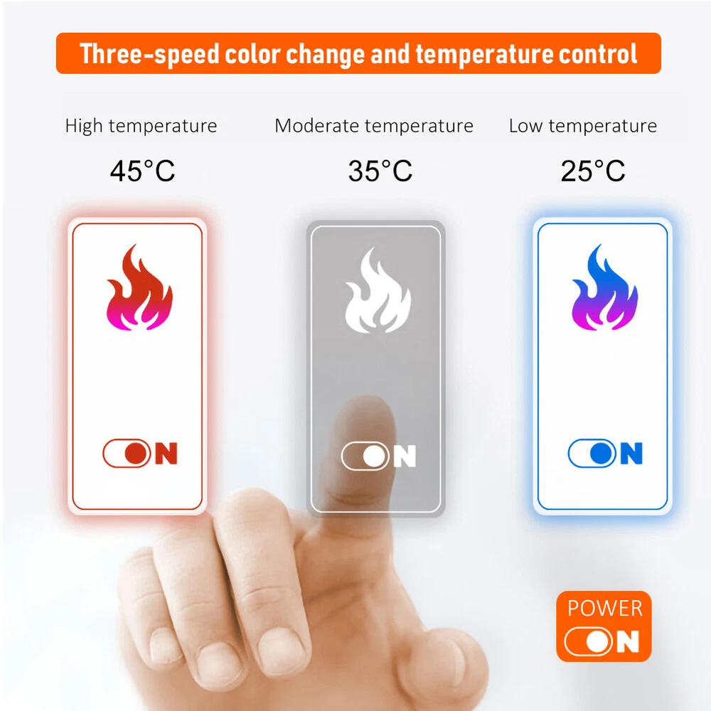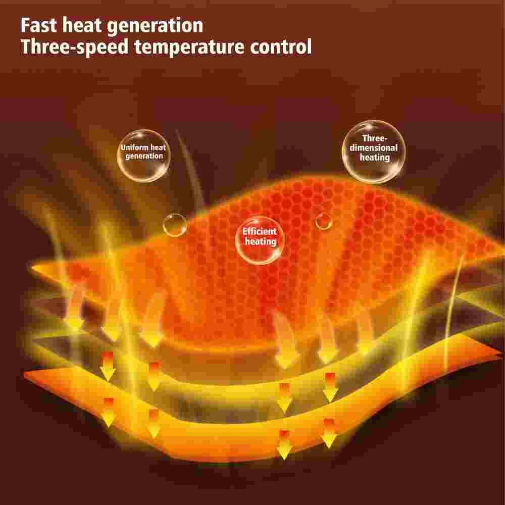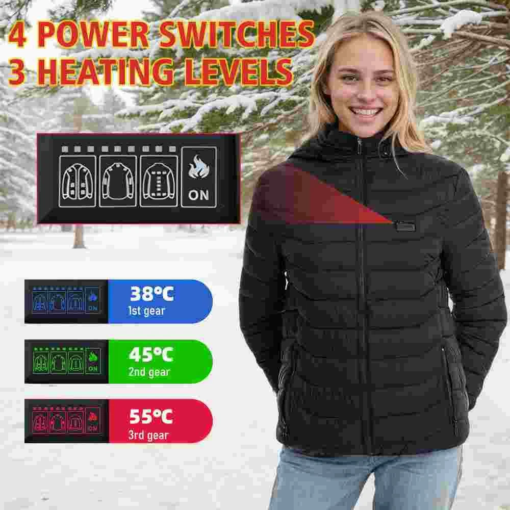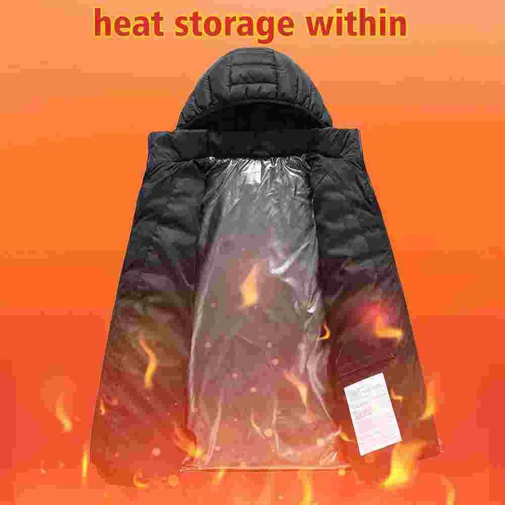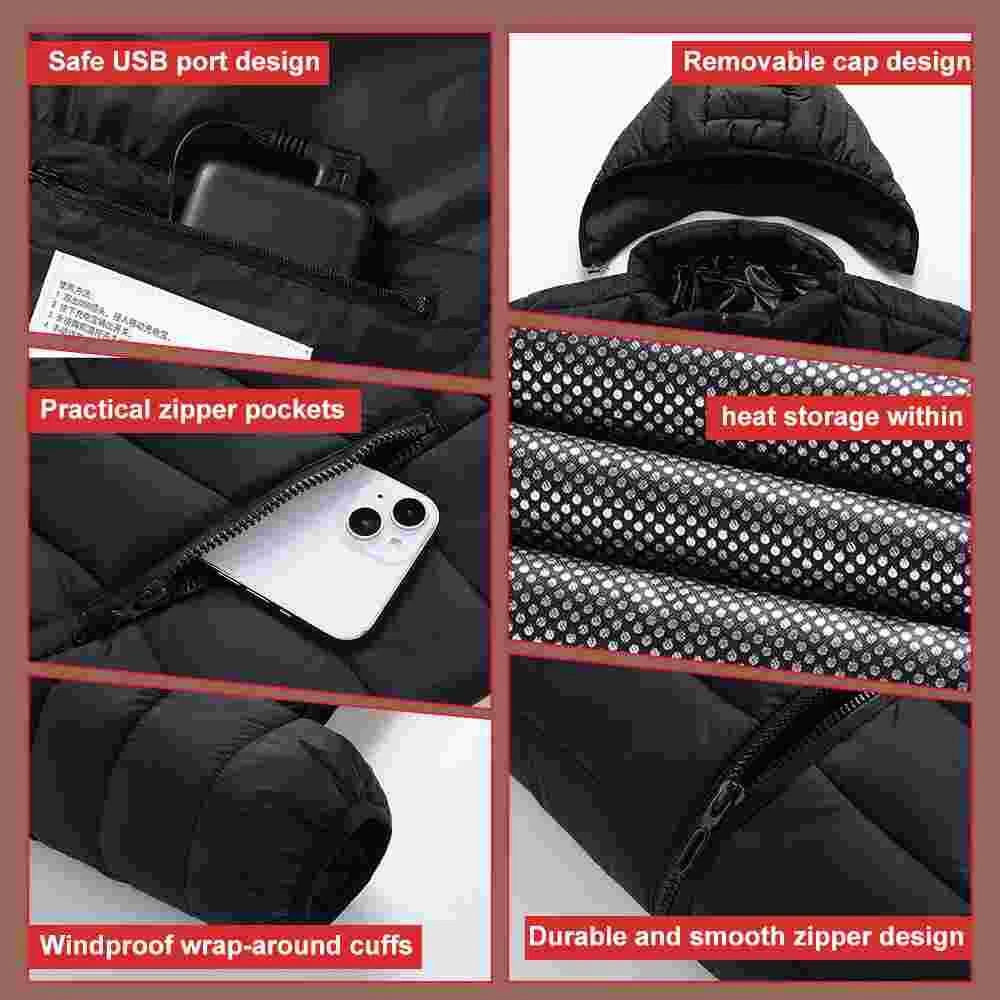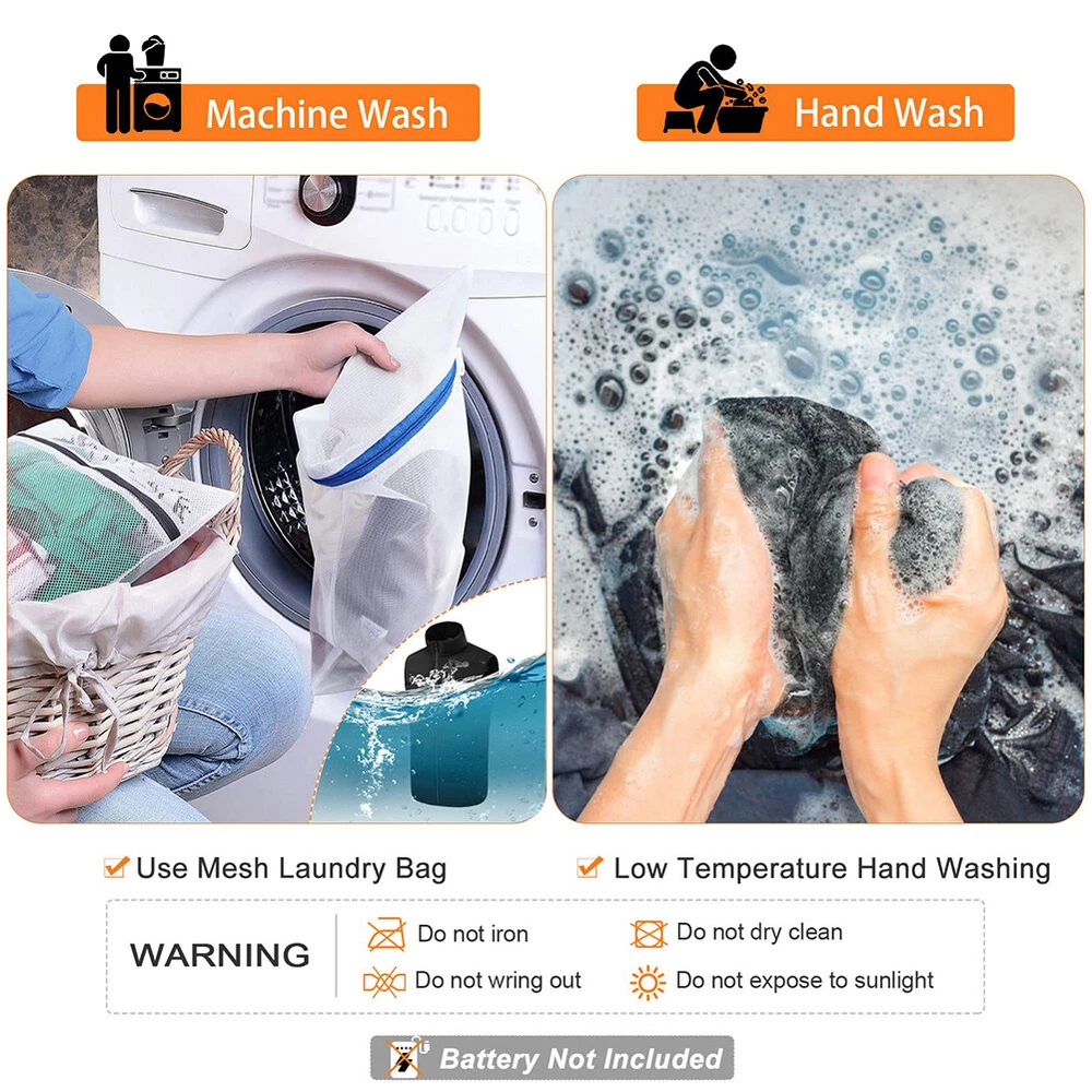 Note!!! To ensure better heating effect, please be sure to choose the size that fits your body shape according to the size chart. Featur es : 1. 21Heating Zones and 3 Temperature Adjustment: Carbon fiber heating elements generate heat across the waist, shoulder ,arm, belly,neck, and back, promote blood circulation and keep you warm. 3 heating temperature adjustment according to your needs. * 2. USB Charging: Easy to charge. You need to always connect 5V 2A mobile power(this product does not include power bank). The mobile power needs to be removed during washing. 3. Safe and Healthy: The 5V far infrared heating is far below the human body safety voltage. Large area carbon fiber wire heater is safe and insulated, ensure safe heating for you. 4. Skin-friendly and Comfortable: Soft and comfortable touch, premium fabrics, keep you warm in cold winter conditions without wearing thick clothes. 5. Wide Application: Suitable for outdoor skiing, winter fishing, cycling, camping, skating, or daily wear, etc. Descr iption : 1. Size: XL/XXL/3XL(US) * 2. Material: -Liner: Polyester -Fabric: Nylon, 100% cotton 3. Temperature Adjustment: -Warm: 45℃ (Red Light) -Comfort: 35℃ (White Light) -Energy Saving: 25℃ (Blue Light) Instructions: *1. T ake out the USB plug . *2. Access to the mobile charging power source. *3. Press and hold the chest temperature control output switch for 3 second s. 4. Long press the chest temperature control switch for 3 seconds, start to warm up and then adjust to the medium temperature heat when you need to always connect the mobile power. 5. Manual adjustment between 3 gears. Warm at 45 degrees Celsius, Comfortable at 35 degrees Celsius, and Energy-saving at 25 degrees Celsius. 6. Press and hold the chest temperature control switch for 3 seconds, and turn off the light to stop heating. Washing Tips: - Machine wash & hand wash are available. Do not wring or twist. - Unplug the powers before washing and make sure it is dried before heating. Pack age Includes: 1 x Heated Jacket ( power bank included )
