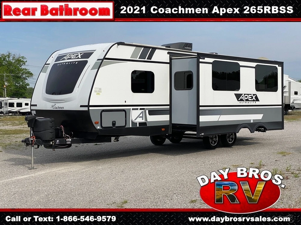 Vehicle Information Year: 2021 Make: Coachmen Model: Apex Ultra Lite Condition: Used Contact Day Bros RV Sales 3054 South Laurel Rd London Kentucky 40744 View Map Ask for: Anthony Wortham Contact:  Contact Us Main: (866) 546-9579 Hours Mon, Tues, Thurs, Fri: 09:00 AM-06:00 PM EST Wednesday: 09:00 AM-05:00 PM EST Saturday: 09:00 AM-04:30 PM EST Sunday: Closed Why Buy From Day Bros In Kentucky **Click "See full description" in Item Description for more specs and photos!** Come visit us in scenic Laurel County, KY! Our location in London, KY is just five miles off Exit 38 on I-75 and places us in the middle of some of the most beautiful scenery in the country. We're just north of Cumberland Fall State Resort Park, a vacation destination that's home to the "Niagara of the South." Cumberland Falls is one of the largest waterfalls in North America and one of the precious few places in the world where you can see a moonbow. People come from all across America to take in the beauty of this local treasure, and with its RV park you can make a long weekend of your purchase from Day Bros. It's also home to miles of hiking trails, making it the perfect RV destination. Come on by and plan to stay for a few days after you drive your new purchase off the lot! If anything goes wrong, we're right here to help make sure you make that long drive home with a reliable coach. A little closer but no less beautiful is Levi Jackson State Park, which is just up the road from our dealership. A historic park encompassing nearly 900 acres, you can visit parts of the Wilderness Road, where early settlers traveled to reach Kentucky. You can retrace the steps of Wilderness Road with two hiking trails totaling 8.5 miles. Levi Jackson is also home to an RV park for that long weekend--why not celebrate the purchase of your new coach with a mini vacation! Levi Jackson also boasts the Mountain Life Museum, which brings visitors into a pioneer settlement for some historic fun every Friday and Saturday Memorial Day through Halloween. Don't hesitate to ask us where to find good food and good fun in the local towns while you're here. London and Corbin are experiencing an exciting downtown revival of great food and local shops, and if you give us a call you can schedule a visit during one of our famous events, such as the World Chicken Festival. We want your RV buying experience to be a fun as possible and our location means there's plenty to be had. To get started on your RV buying journey, call us at 1-866-546-9579 or visit our website at www.daybrosrvsales.com NOTE: Some of our RVs are located at our NEW location in Monticello, KY! See pictures for more info. Anthony Wortham (866) 546-9579 3054 South Laurel Rd London Kentucky 40744  Day Bros RV Is Located In Scenic London, KY  Credit Application  Directions to Dealer  Contact Us BBB Accredited Business London, KY Monticello, KY 21 Coachmen Apex Ultra Lite 265RBSS Travel Trailer Towable RV Camper Rear Bath Video  Apply Now Secure Credit Application Applying for a vehicle loan online is one of the quickest and easiest application methods. Our secure application is easy to complete, all you need are a few personal and employment details.  Credit Application  Directions to Dealer  Contact Us Options and Standard Features Basic Information Year: 2021 Make: Coachmen Model: Apex Ultra Lite Trim: 265RBSS Stock Number: 041099 VIN: 5ZT2CXSB6MS041099 Condition: Used Dry Weight: 5652 Type: Travel Trailer Sleeping Capacity: 6 Length (Feet): 30 Construction Body Material: Aluminum Sidewall Construction: Fiberglass Dry Weight (kg): 2563.7 Dry Weight (lbs): 5652 Title: Clean Suspension / Braking / Wheels Spare Tire Location: Exterior Mounted Wheels Composition: Aluminum Rear Tire (Full Spec): Nitrogen Filled Radial Tires Wheels Tires Spare Tire Front Brake Type: Not Applicable Rear Brake Type: Electric Drum Drivetrain Number Of Axles: 2 Safety Smoke Detector Carbon Monoxide Detector Propane Alarm Emergency Exit(S) Number Of Emergency Exits: 1 Exterior Exterior Flood Lights Exterior Shower Retractable Roof Antenna Exterior Color: White Interior Interior Wood Finish Wallpaper Living Area Location: Center Interior Color: Tan Comfort Air Conditioning (Btus): 13,500 Heater Sofa Number Of Sofas: 1 Number Of Convertible / Sofa Beds: 2 Air Conditioning Type: Automatic Sofa Material: Vinyl Heater Type: Automatic Convenience Sky Light Roof Vents Leveling Jack Type: Front Manual / Rear Manual Leveling Jacks Included: Standard Entertainment Television Radio TV Antenna Prewiring Cable Prewiring Number Of Radios: 1 Number Of Televisions: 1 Speaker Location(s): Interior / Exterior Slide-Outs & Awnings Slide Outs: 1 Awnings: 1 Slideouts Awning Power Retractable Slideout Power Retractable Awning Awning Length (ft): 18 Awning Length (m): 5.5 Cargo / Storage Pass-Thru Storage Utility Hookups Number Of Propane Tanks: 2 Water Heater Pump Power Mode: Electrical / Propane Water Heater Tank Capacity (g): 6 Water Heater Tank Capacity (l): 22.7 Total Propane Tank Capacity (gal): 9.4 Total Propane Tank Capacity (lbs): 40 Water Heater Tank Rear Bumper Drain Hose Carrier Propane Tank Cover Propane Tank(S) Water Heater Tank Bypass Holding Tanks Water Capacity (Gallons): 41-50 Fresh Water Holding Tank Gauge Gray Water Holding Tank Gauge Black Water Holding Tank Gauge Holding Tanks Number Of Fresh Water Holding Tanks: 1 Number Of Gray Water Holding Tanks: 1 Number Of Black Water Holding Tanks: 1 Total Black Water Tank Capacity (gal): 35 Total Black Water Tank Capacity (l): 132.5 Total Fresh Water Tank Capacity (gal): 50 Total Fresh Water Tank Capacity (l): 189.3 Total Gray Water Tank Capacity (gal): 70 Total Gray Water Tank Capacity (l): 265 Electrical / Generator Solar Battery Charger Exterior Plugs Ground Fault Plugs Battery Air Conditioning Prewiring Heat Prewiring Battery Converter Amps: 55 Battery Power Converter Bedroom / Bath Bathroom Bathroom Flooring Type: Vinyl Bathroom Location: Rear Ba