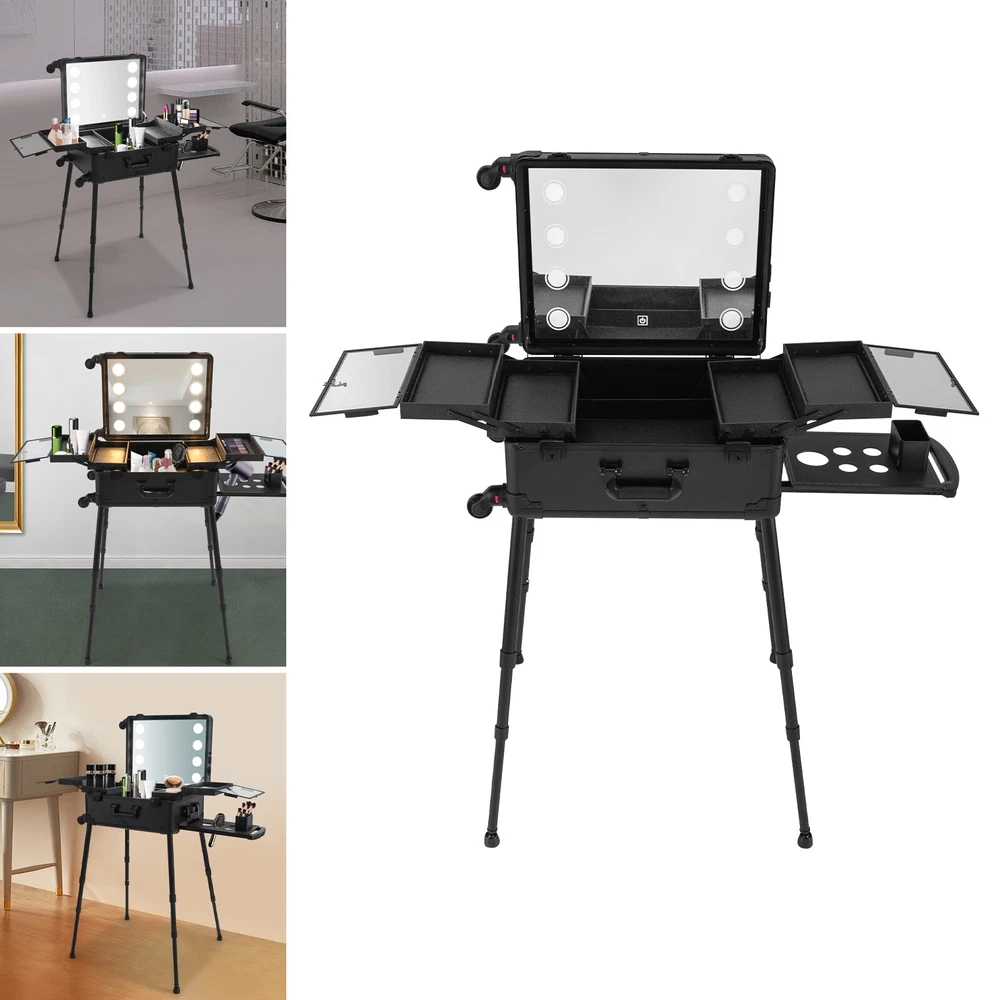21 Inch Makeup Train Case Travel Cosmetic Organizer Case Rolling Make-up Case Description Are you still struggling with not being able to pack your makeup when you go out? Come and take a look at our makeup case! It's designed for professional cosmetologists to get their makeup done anywhere, anytime. It has an extra-large main case and 4 compartments, together with the minimalist style, universal wheels, convenient invisible legs and a comfortable top carry handle to make your daily makeup work more convenient. Come and bring it home! Key Features High-quality Material: Made of fireproof board, aluminum alloy, PP with a frosted process, this product is corrosion-resistant, wear-resistant, and waterproof, ensuring your long-term use. Sorted Storage: The inner box has 4 compartments for storing nail polish, lipstick, makeup brushes, eyeliners or combs (all not included). The porous storage board holds a hair dryer, curling iron (neither included) and more to keep your belongings neatly organized. Flexible Movement: Four easy-to-move universal wheels, a telescopic trolley rod, and a side handle make it easy to get the case up and down stairs, in and out of cars and elevators. Makeup Assistant: High-definition glass, eight LED lights, adjustable brightness, and three adjustable light colors (white, warm yellow and neutral) help you see more details of your makeup and restore the true state of your makeup. Adjustable Legs Height: With the 4-gear height-adjustable support legs(15.35-33.46in), you can find the height that suits you best to have enjoyable makeup without back pain. Protect Your Privacy: It is equipped with locks and two keys to protect the valuables inside the box and maximize your privacy and property security. Thoughtful Design: The edges and corners fixed with multiple rivets are collision-resistant and drop-resistant, effectively protecting the product. In addition, the support feet can be easily installed when needed or removed and stored at the bottom of the case when not in use. Easy to Clean: A simple construction and smooth surface make this product easy to clean, you just need a towel (not included)and water to easily remove dust and residue. Ideal Gift: Its classic design and large capacity make this product a great gift to your mother, girlfriend, sisters, wife, and loved ones so that they can enjoy more convenient makeup time. Protective Package: To prevent damage to the product due to bumps in transit, we place bubble bags and foam to protect the product as much as possible. Details Comfortable Handle: The top handle gives you a secure and comfortable grip without slipping. Clear Lids: They are both dustproof and serve as a display for you to see the contents at a glance. 4 Non-slip Foot Seats: They prevent the case from touching the floor directly without getting dirty and cut up, while enhancing the stability of the product without slipping. Practical Socket and Charging Ports: They can be used to charge hair dryers, curling irons and cell phones (not included). In addition, their protective covers keep rain or other debris out. Application Professional makeup artists, hairdressers, beauticians, manicurists, beauty lovers, etc. can use this product to store cosmetics and makeup tools. It is ideal for makeup contests, wedding makeup scenarios, travel makeup, outdoor shooting, cinemas, dressing rooms, crew, tourism, beauty salons, and more. Specifications Color: Black Style: Modern Shape: Rectangle Material: Fireproof Board, Aluminum Alloy, PP Process: Frosted Assembly Required: Yes Mount Type: Freestanding Plug Type: US Standard Voltage: 110V Wheel: Removable Universal Wheel Carrying Method: Hand-held, Hand-pulled Light Color: Warm Yellow, Neutral, White Makeup Mirror Control Method: Touch-in Light Source: 8 LEDs(Included) Legs Adjustable Height: 4 Gears(39-85cm/15.35-33.46in) Power Cord Length: 1.8m/5.91ft Drawbar Length: 40cm/15.75in USB Cable Length: 97cm/38.19in Number of Universal Wheels:4 Number of Compartments: 4 Gross Weight: 12.5kg/27.56lbs Net Weight: 11kg/24.25lbs Makeup Mirror Size(L*W): 45*35cm/17.72*13.78in Makeup Mirror Diagonal Length: 55cm/21.65in Each Compartment Size: 27*14.5*2.5cm/10.63*5.71*1in Main Case Height: 11cm/4.33in Product Height: 138cm/54.33in Package Size: 60*50*30cm/23.62*19.68*11.81in Package Included 1* Makeup Case 1* USB Cable 1* Power Cord 4* Universal Wheels 4* Legs 1* Storage Board 2* Keys 1* English Manual Notes Please note that this product does not include any other items. This product is an 8-light model without Bluetooth function. The support legs need to be tightened slightly before being supported. The service wear of the case is a normal phenomenon. In the process of daily use, please try to avoid excessive impact and drop to extend the lifespan of the product. Please use soft tools and water to clean. Please keep away from corrosive liquids. Please avoid long-term exposure to the sun. Please clear the wheels in time to maintain smooth movement. Please read the English manual completely before use. Please allow the slight color difference caused by the shooting light and the 1-3 cm error due to manual measurement, and make sure you do not mind before ordering. Payment Delivery details Terms of sales About us Contact us Payment We accept ebay payment 。 Fees such as import duties, taxes are not included in the item price or shipping costs. These charges are the buyer's responsibility. Delivery details Shipping: 2-9 working days to: USA Terms of sales We maintain high standards of excellence and strive for hundred percent customer satisfaction. Feedback is very important to us. We hope that you contact us immediately before you give neutral or negative feedback, so that we can address your concerns. It is impossible to address issues if we do not know about them! About us Your satis faction is our ultimate goal. We work hard to earn your trust and future business. Our certified technicians have tested each item before 