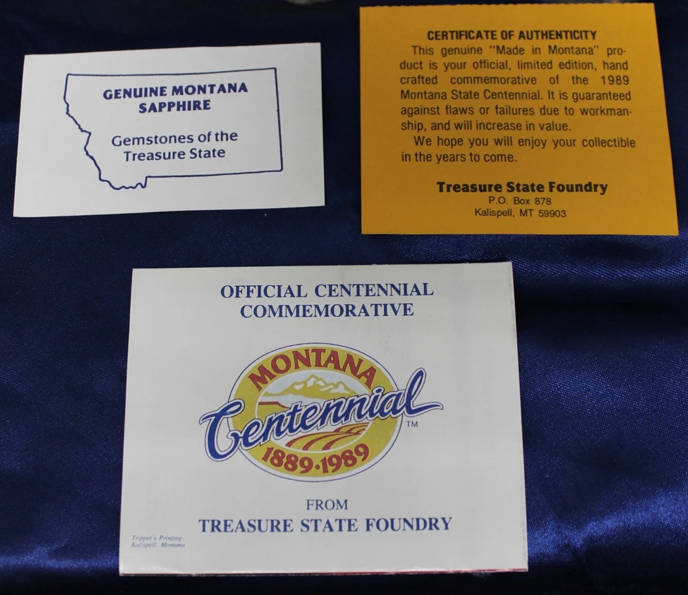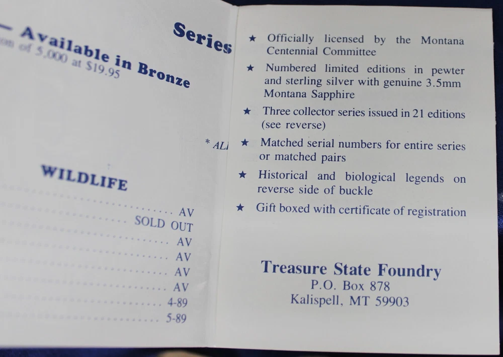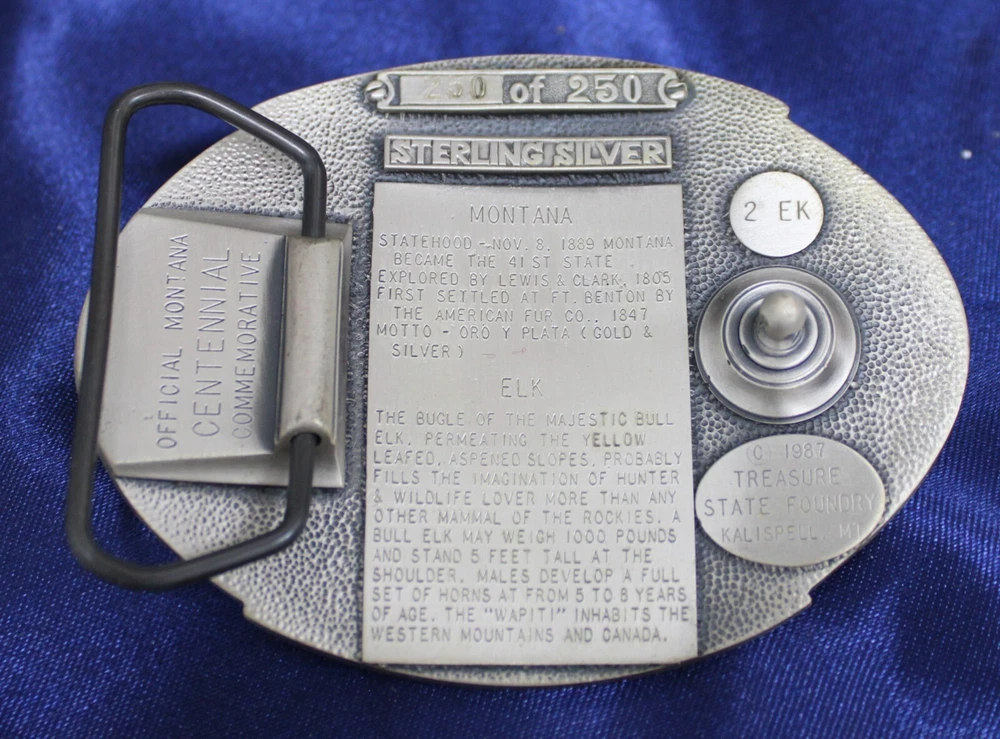 A complete set of (21) Montana Centennial sterling silver belt buckles commemorating the hundred year anniversary of Montana's statehood. While they made 5000 bronze buckles (which trade between $50-100) they only made 250 sterling examples. This is #250 of 250. Were told its one of only two complete sets with the other located at the Charlie Russell museum in Great Falls MT. Each buckle is over 5ozt of sterling silver with a quality MT sapphire. The sapphires were supplied by Adair's Jewelry in Missoula, MT who provided a hand written appraisal of $11k in 2001! Worth note the appraisal states that if a buckle were removed and it wasn't a complete set the value drops to $1500-2k. (2001 money) So it is a big deal to have full set and we are not interested in breaking it up. We are asking $5500 which puts each buckle at only $262 a piece. Shipping would be fedex at around $50. These came over the counter at our brick and mortar store in Helena, MT. You can call us with questions. Our phone # is on card in pics. (didn't want to write here in case of spam) Awesome set don't expect it to last long. Thanks for looking.