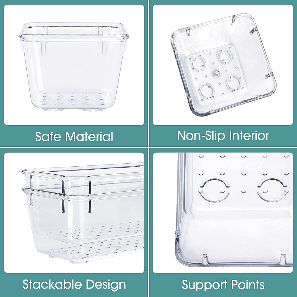 Premium Material:The drawer organizer is made of non-toxic plastic which may be safely used.The transparent design makes it easy to find what you need quickly. 4 Combinations of Different Sizes: A set of cabinet organizer includes 21 storage bins of 4 different sizes. Includes: 9 x 6 x 1.8 inches (3pcs), 9 x 3x 1.8 inches(6pcs), 6 x 3 x 1.8 inches(6pcs), 3 x 3 x 1.8 inches(6cps). You can customize the combination to customize your own drawers. Long Lasting and Non-Slip: The plastic has 3-5 times the impact strength of other materials and is robust. The bottom of the storage organizers has a non-slip design to prevent the tray from moving around when the drawer is opened and closed. Stackable Design: These clear storage bins stack into one other to help maximize your space. Use them side by side to keep organized. The clear color allows you to save time and find what you need quickly and easily. Variety Storage Ways: These versatile Drawer Divider trays fit any part of your home. Suitable for all kinds of drawers, such as dresser / bathroom / kitchen / office. Ideal choice for organizing cosmetics, pins, hair accessories, jewelry, office supplies, craft supplies, utensils, etc. Product Description Safe Materials These drawer organizers are made of plastic; a non-toxic and tasteless plastic which can be safely used for food packaging. Non-Slip Inside Design The bottom of the organizer has a non-slip design to prevent the items of the box from sliding. Stackable Design To help maximize your space, storage may be stacked. The transparent design allows you to quickly locate stored materials. Non-Slip Outside Design There are four support point on the bottom of each plastic organizer bin to prevent the drawer from moving when pulling. Safe Materials Non-Slip Inside Design Stackable Design Non-Slip Outside Design Kitchen Organizer Makeup Organizer Office Organizer